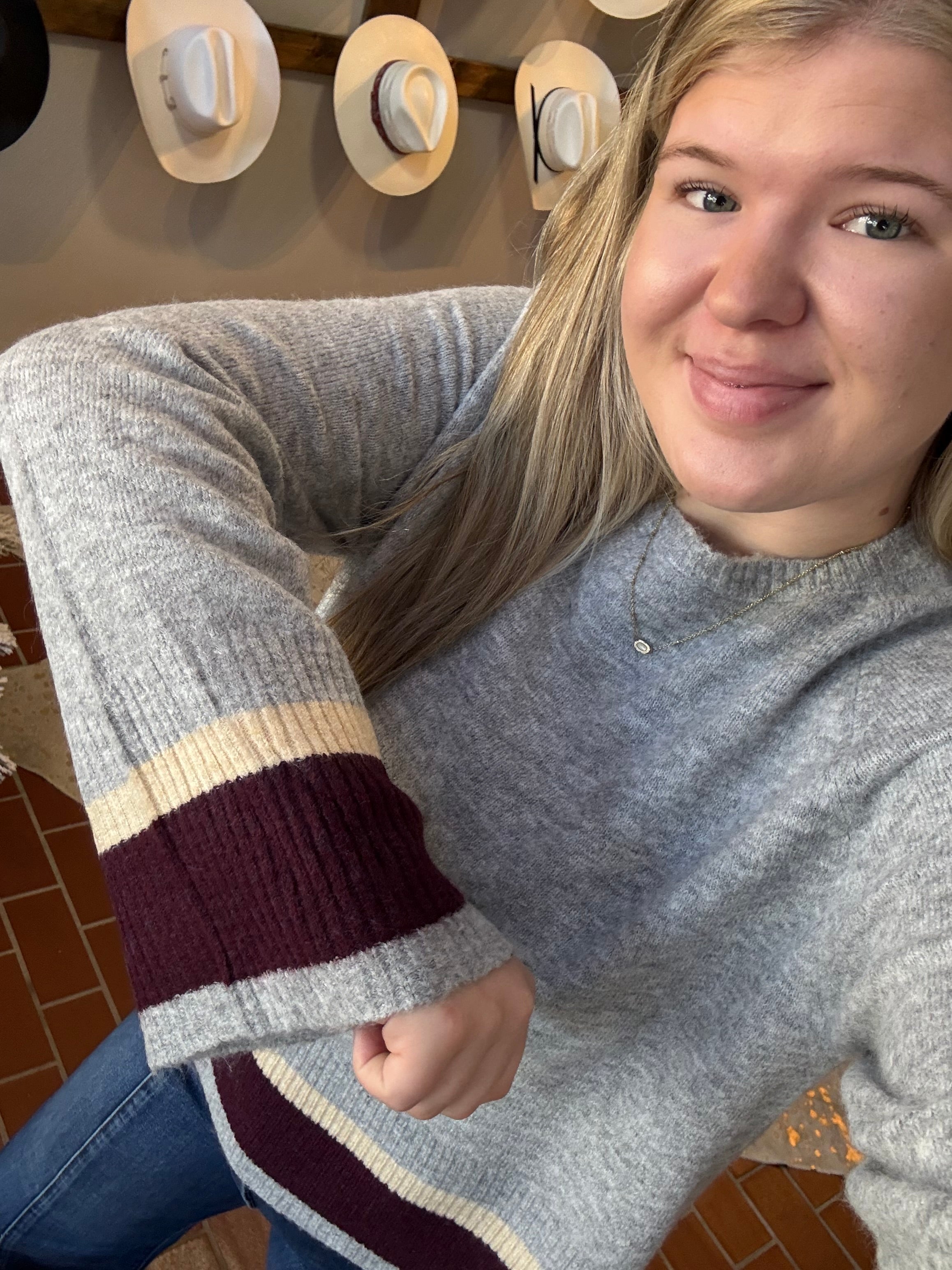 Tanea long sleeve crew neck sweater features a spirited relaxing fit. A touch of modern flair for any lifestyle with wide colorblock stripe band, go-to companion for the leisure out-n-about.