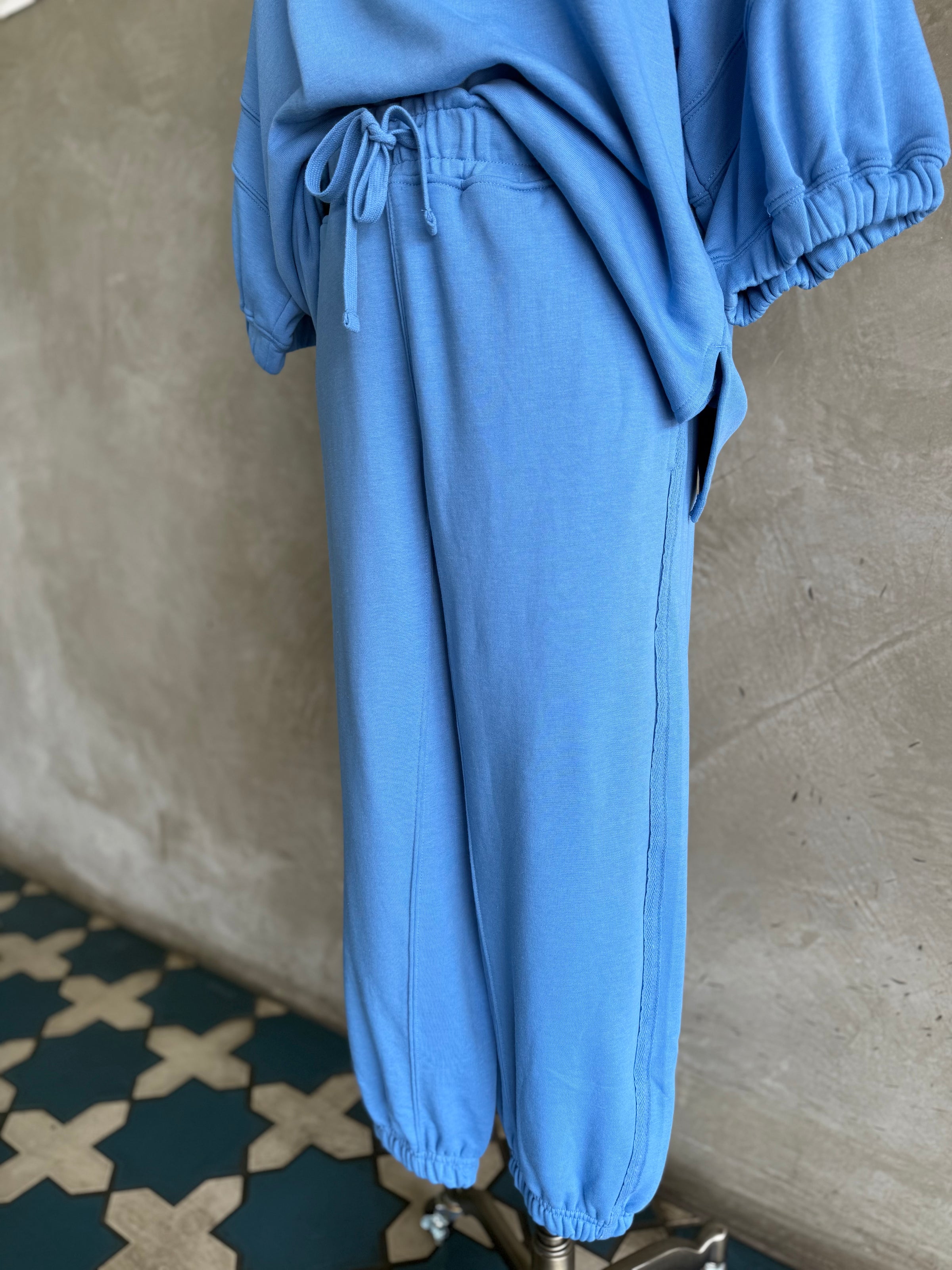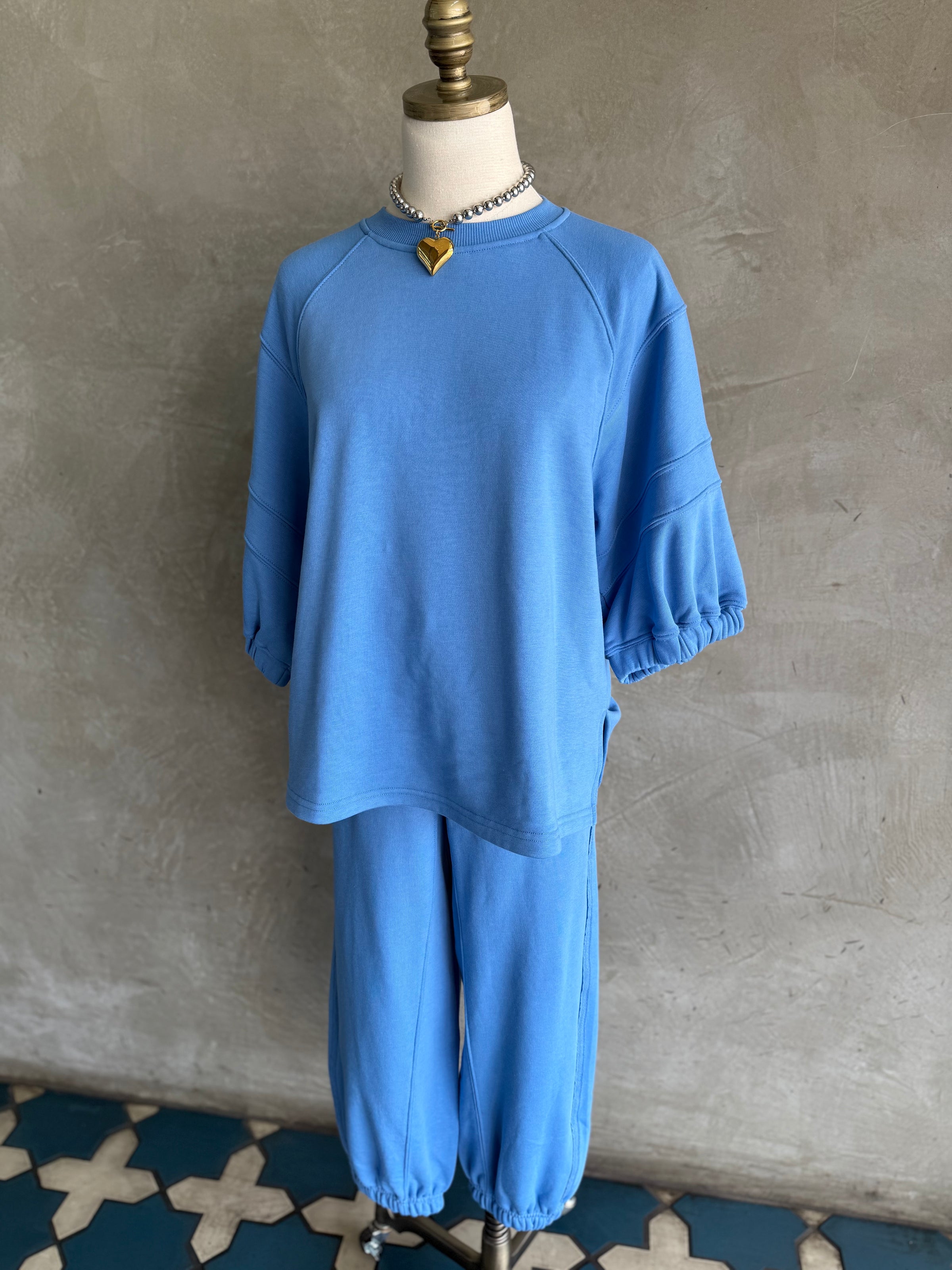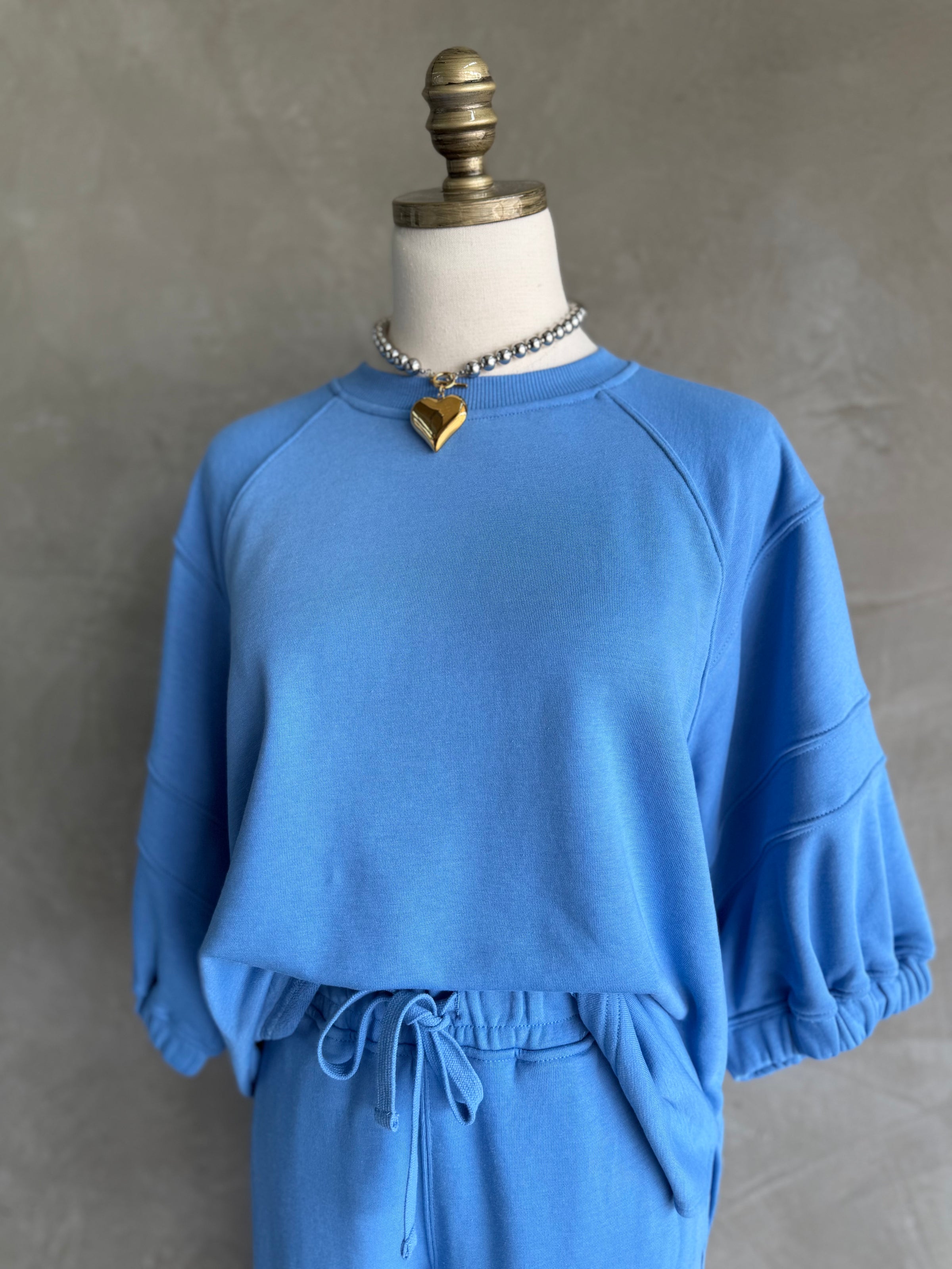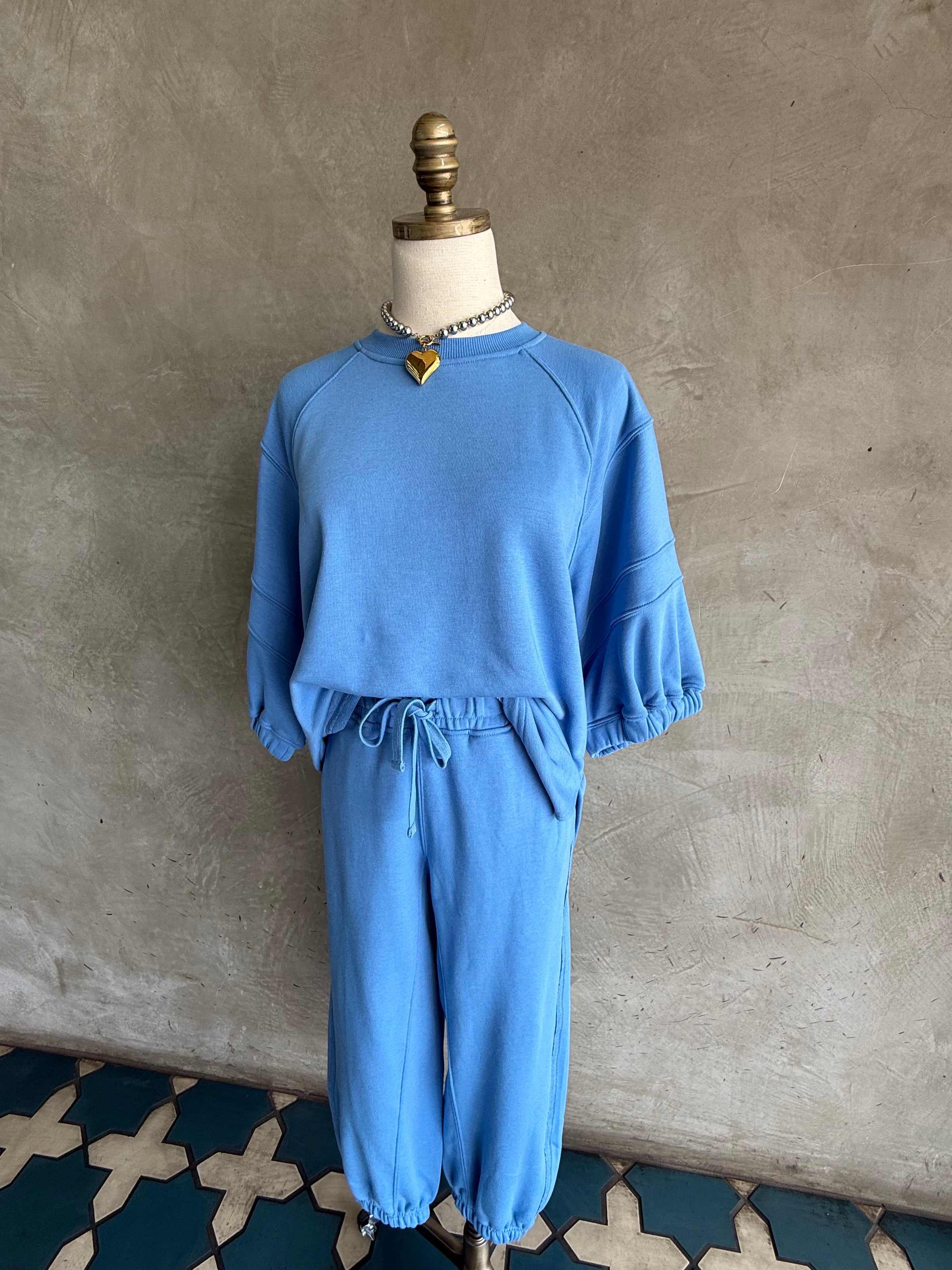 Elevate your casual wardrobe with the Aqua Splash Set, featuring a stunning blue sweatpant set that combines comfort with style. The bubble sleeve top adds a playful, feminine touch, while the pants showcase an adorable side detail that sets this set apart. Perfect for lounging, running errands, or casual outings. Soft, cozy fabric keeps you comfortable all day long. With a drawstring waistband.