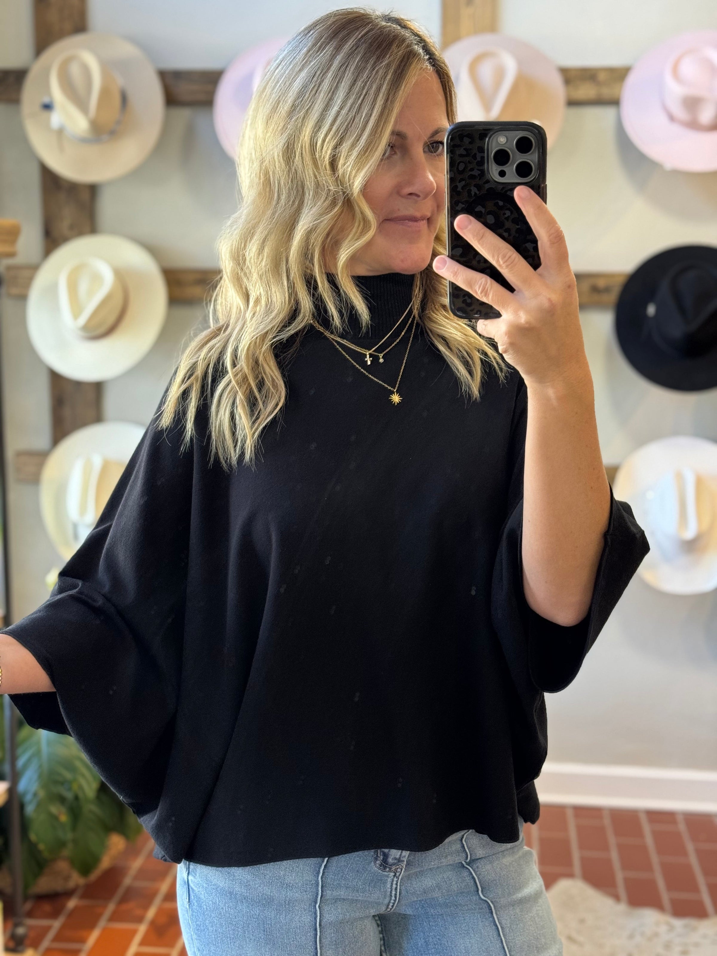 The Hilda Black Sweater Top is an ideal piece to effortlessly transition your wardrobe into Fall. Its batwing sleeves provide exceptional comfort and a relaxed, flowy fit, while the lightweight sweater material keeps you cozy without overheating. Pair it with the Brown Chelsea Ruffle Jeans for an effortlessly festive look that’s perfect for the season. Embrace comfort and style with this versatile top designed for cooler days.