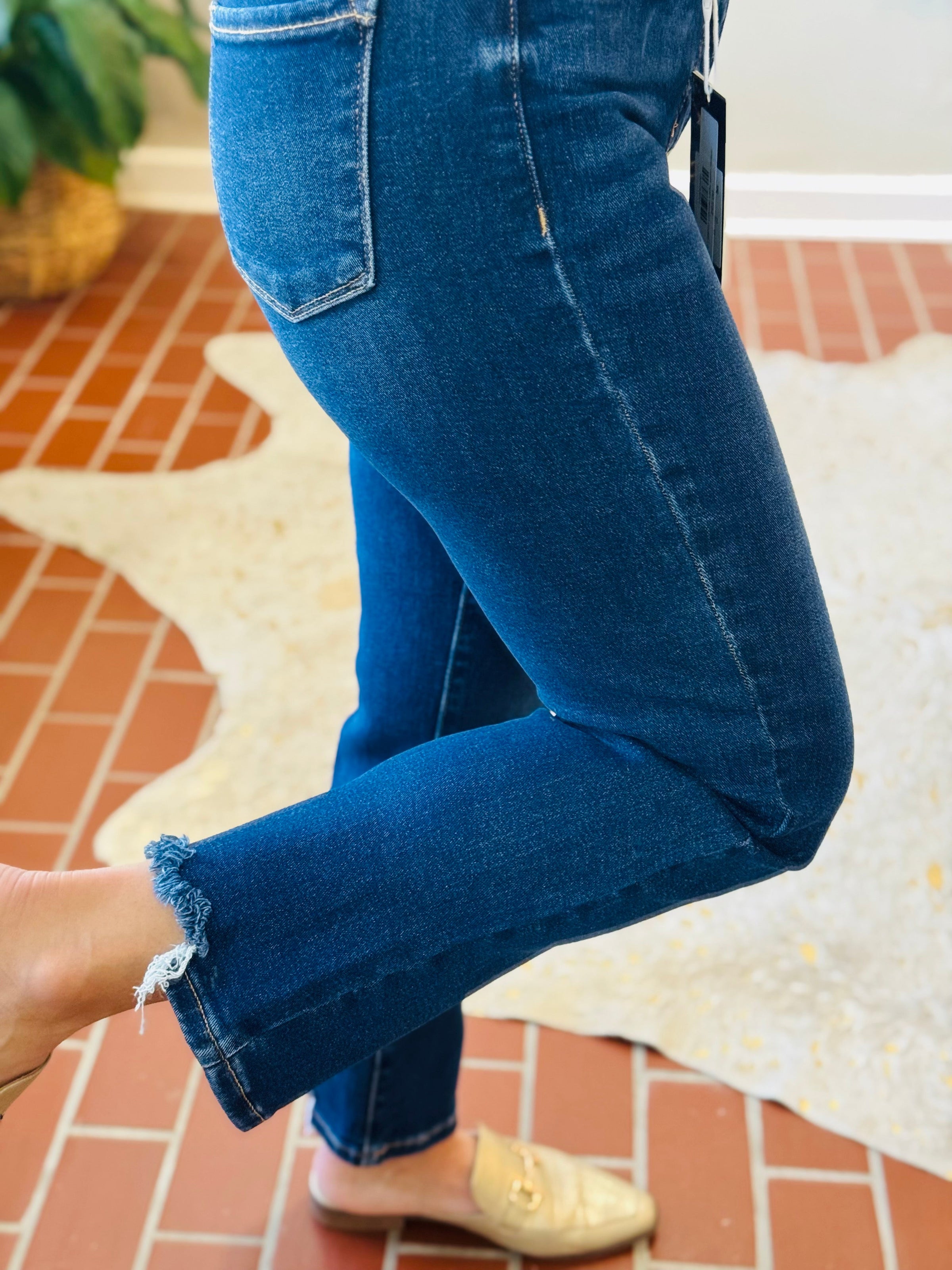 TUMMY CONTROL ELASTIC BAND HIGH RISE CROP STRAIGHT PANTS - Rise 10 3/4" | Inseam 27" in size 3/26 - Model Info: Height 5'8.5" | Waist 24" | Hip 36" - Model is wearing size 1