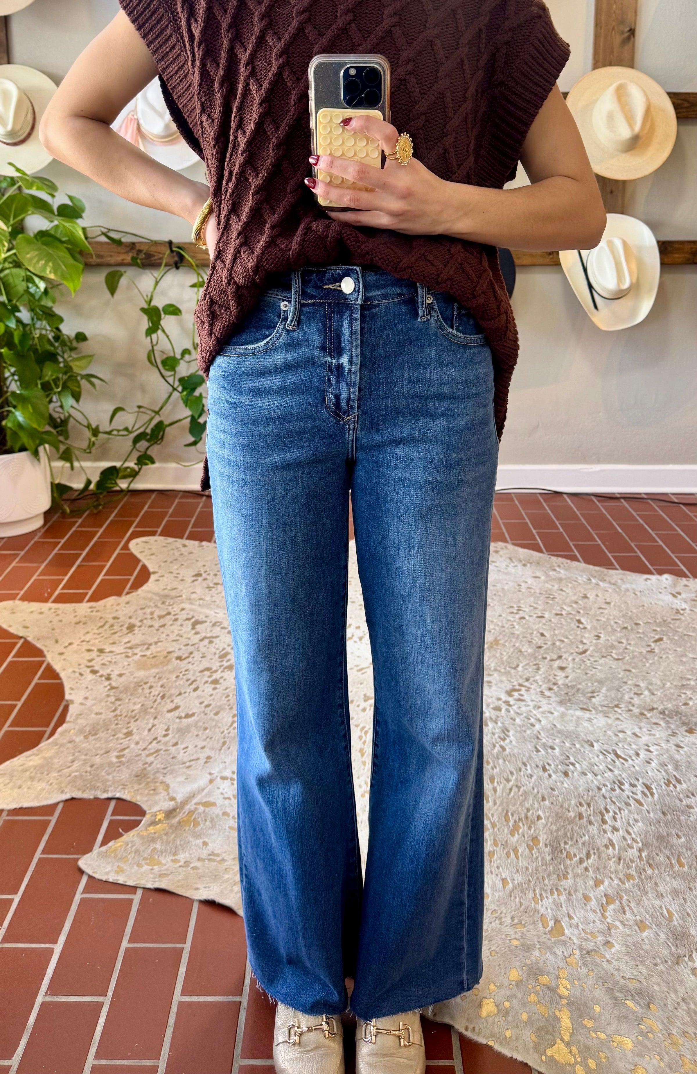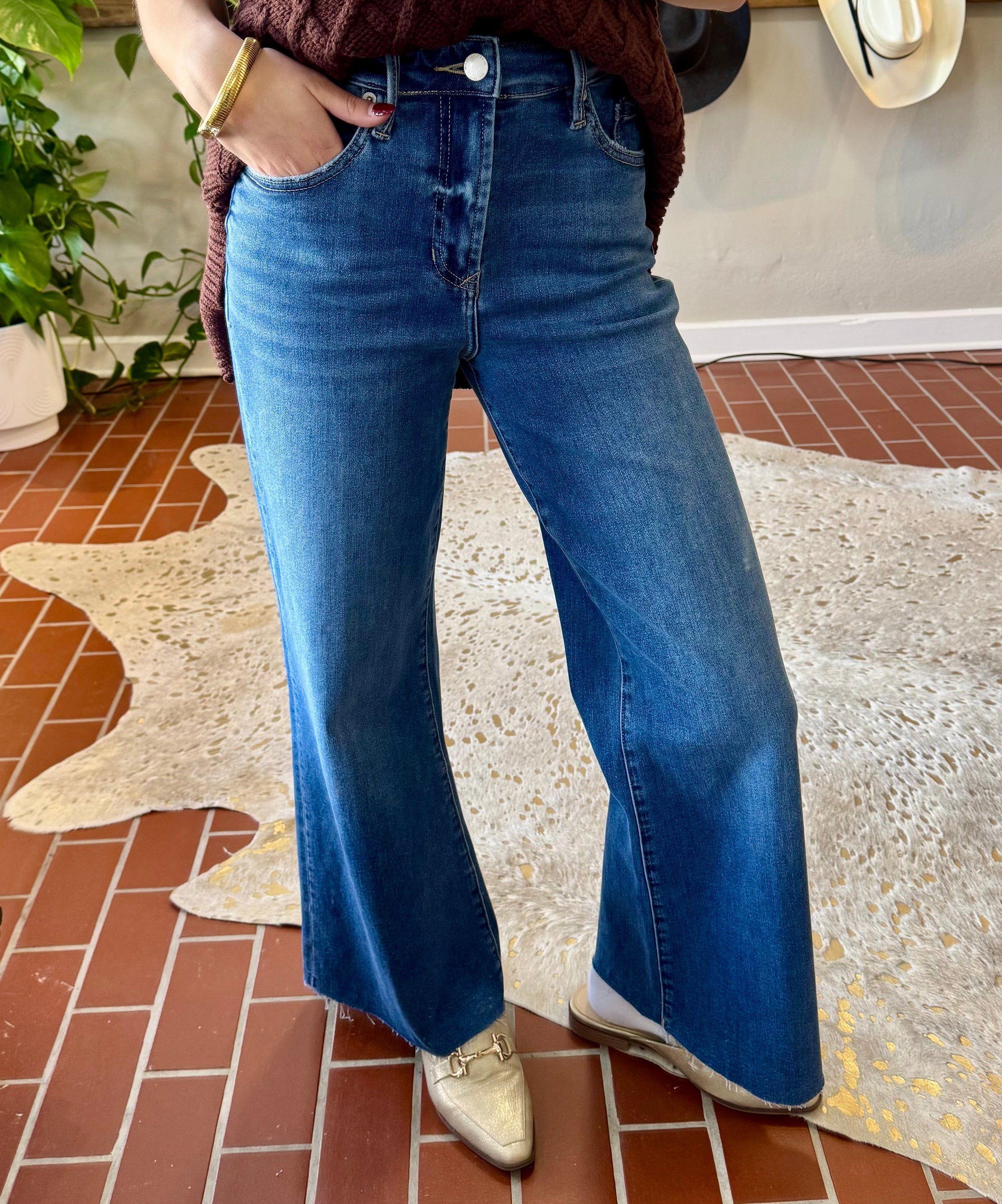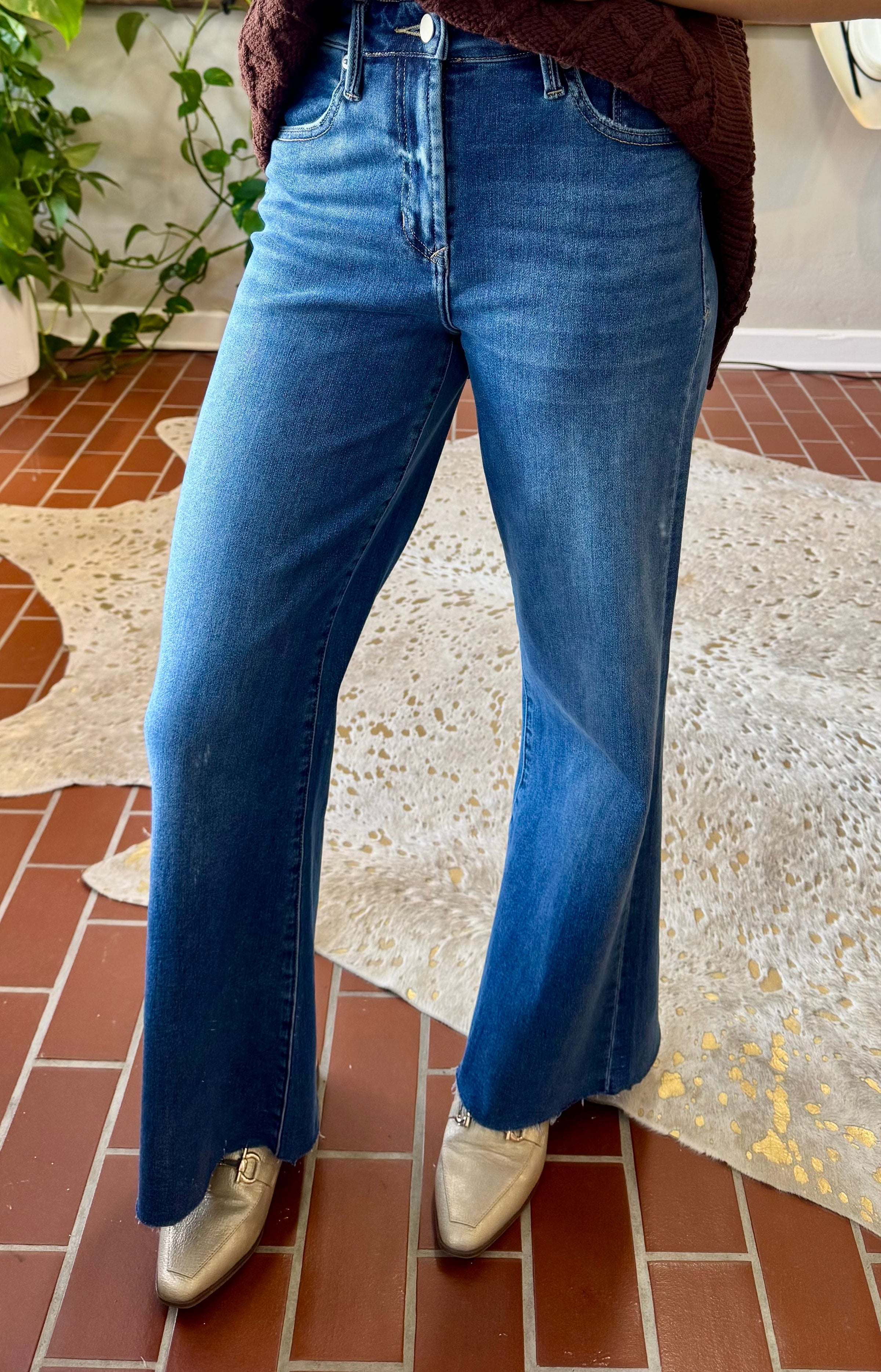 These wide-leg jeans feature a high-rise fit with a structured waist and a relaxed silhouette through the leg. The Fog Sky wash offers a soft, lived-in blue that feels easy and wearable while still looking intentional. Classic five-pocket styling and subtle fading add everyday versatility, while the straight, full-length leg creates a flattering, balanced shape. Designed to pair effortlessly with fitted tops or flowy layers, these jeans work well for both casual days and dressed-up looks.