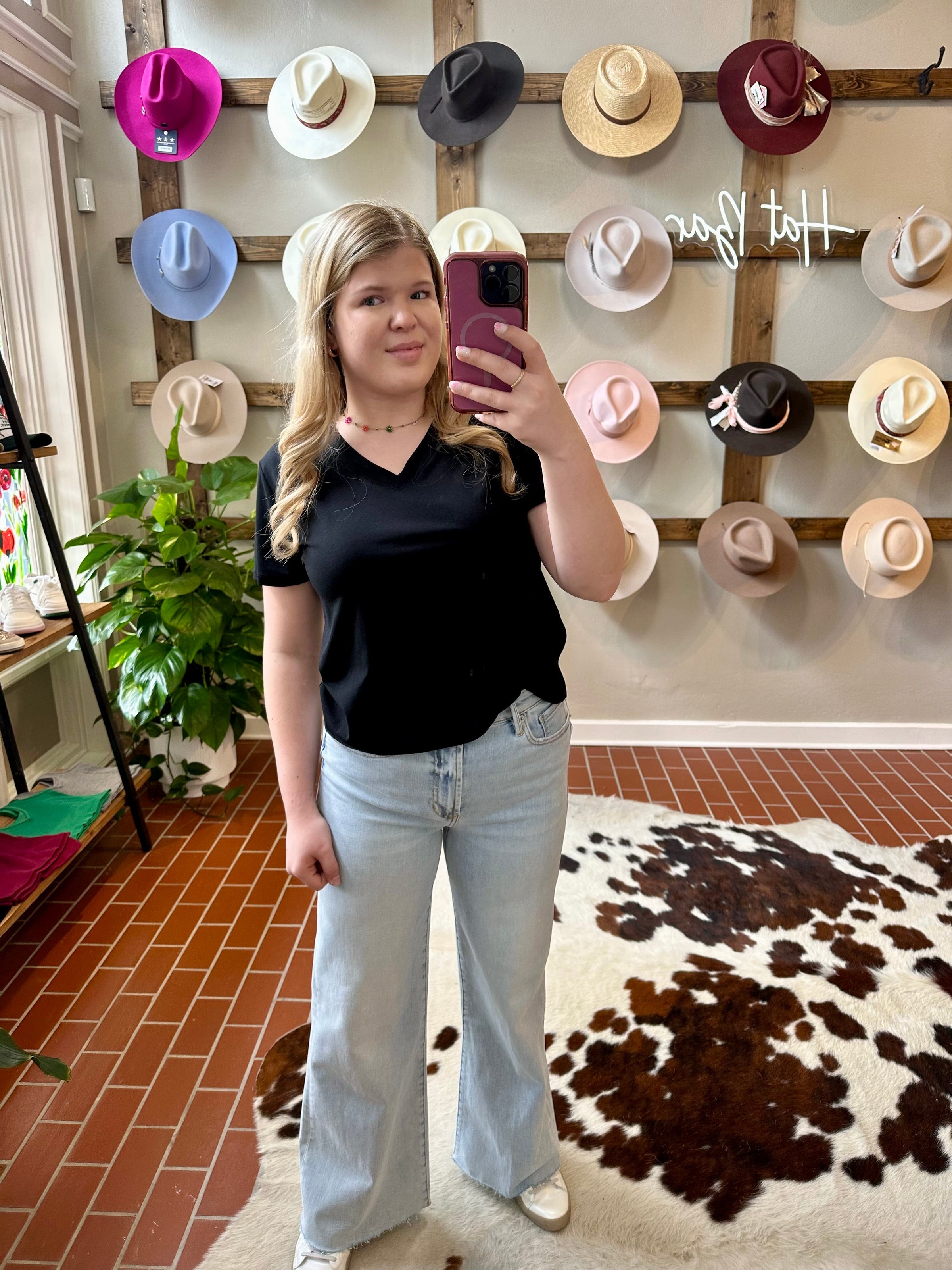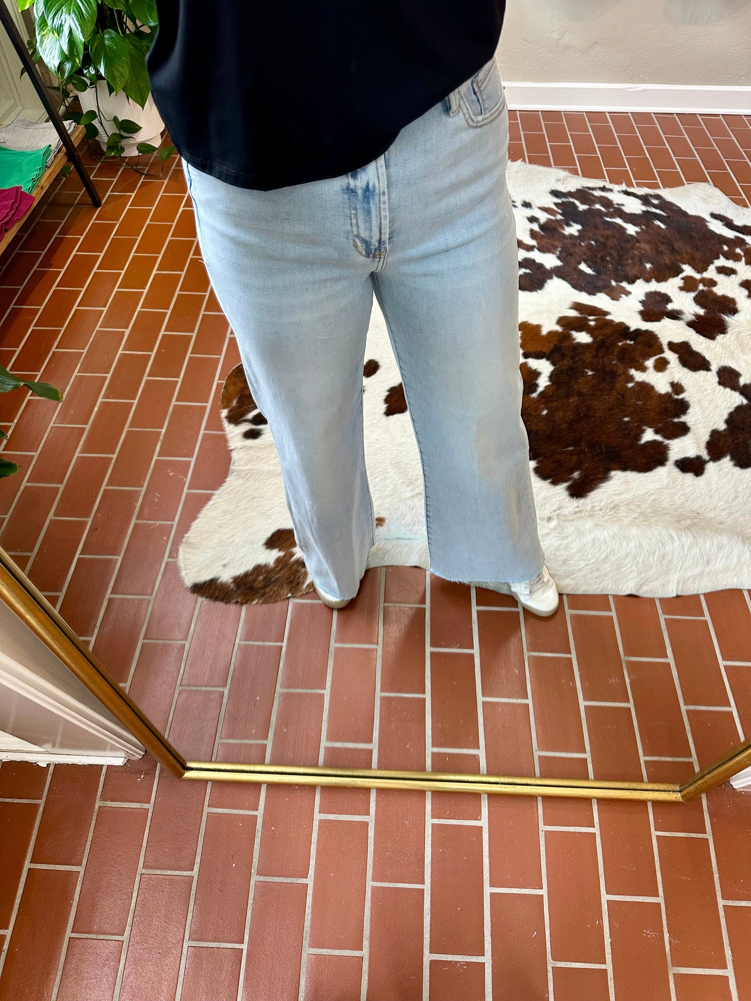 High rise wide leg jeans. It's cozy fit that sits at natural waist, embraces your natural curves and accentuates your hips and thigh. Full inseam on comfort stretch denim accented with hand sanding hip whiskers, grindings & abrasions, washed in effortless light shade for any outings with buttery softness, cut-off hem opening.