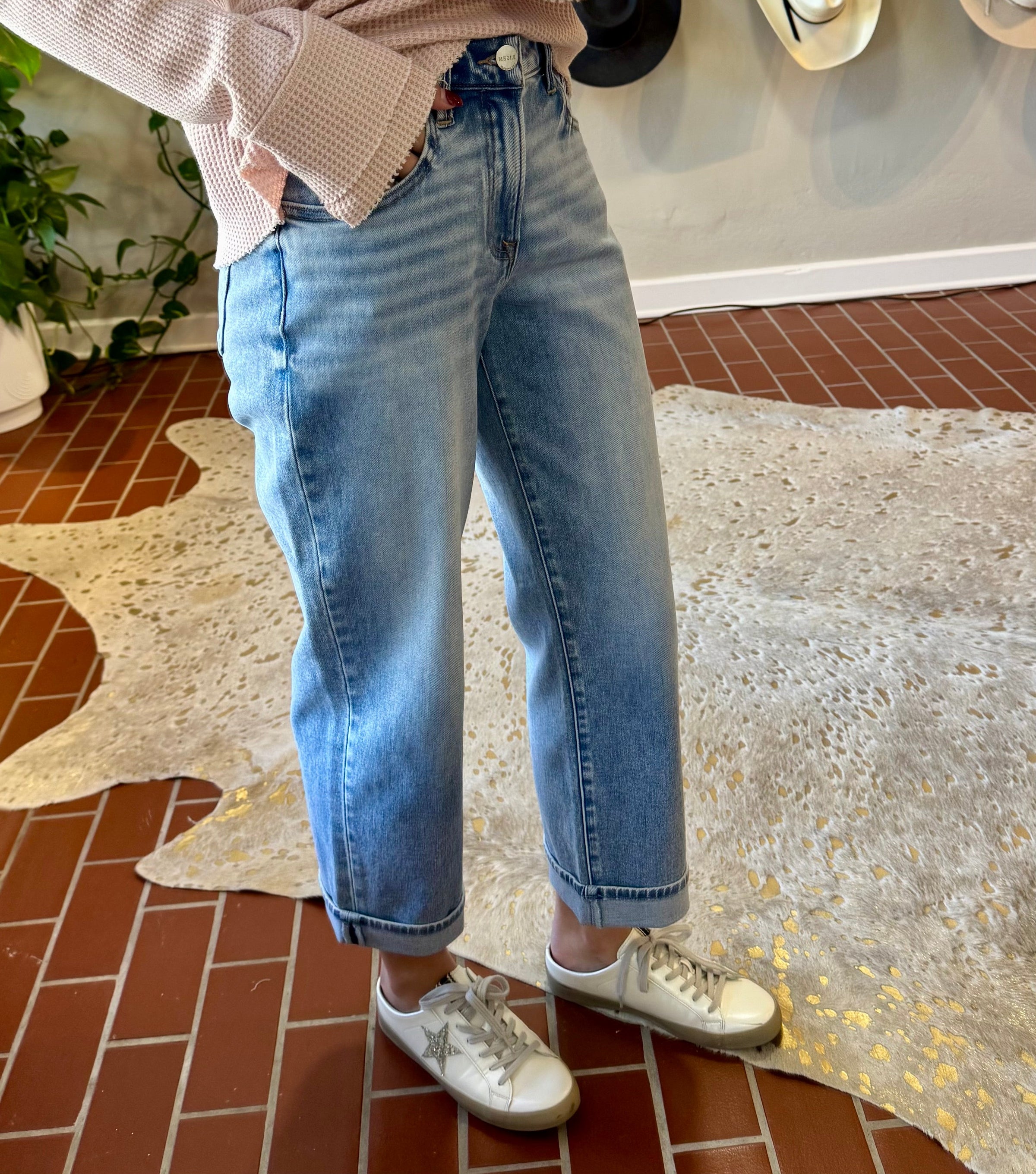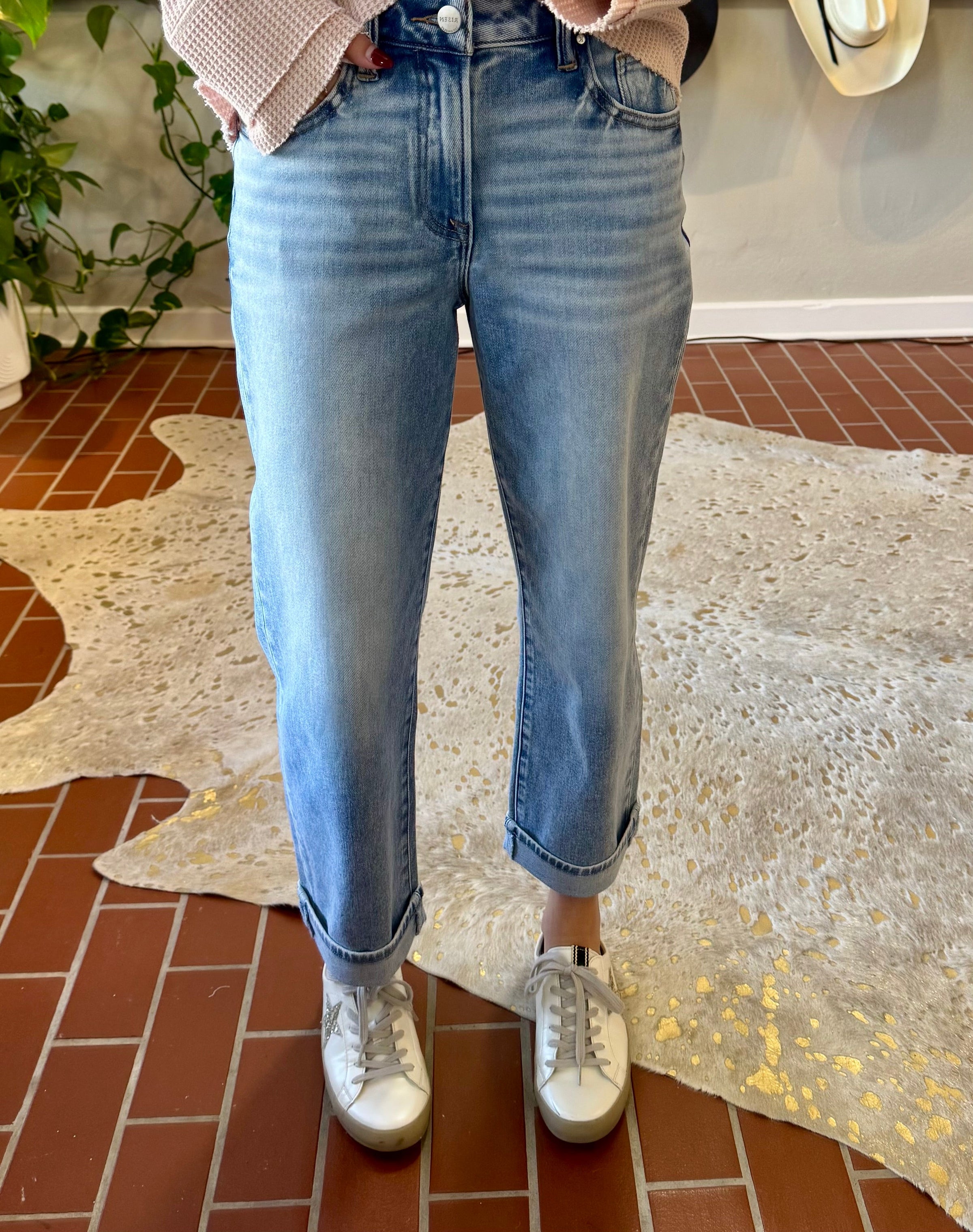 Elevate your spring rotation with this essential high-rise boyfriend jean that delivers effortless style and comfort. The 10½" rise pairs perfectly with a releasable ankle cuff for versatile styling—wear it cuffed for a polished look or release it for a relaxed vibe. Crafted from a premium cotton-blend fabric (93% cotton, 5% polyester, 2% Lycra), this jean offers the structure you want with just enough stretch to move with you. The boyfriend silhouette flatters every frame while the quality construction ensures this piece becomes a go-to favorite season after season