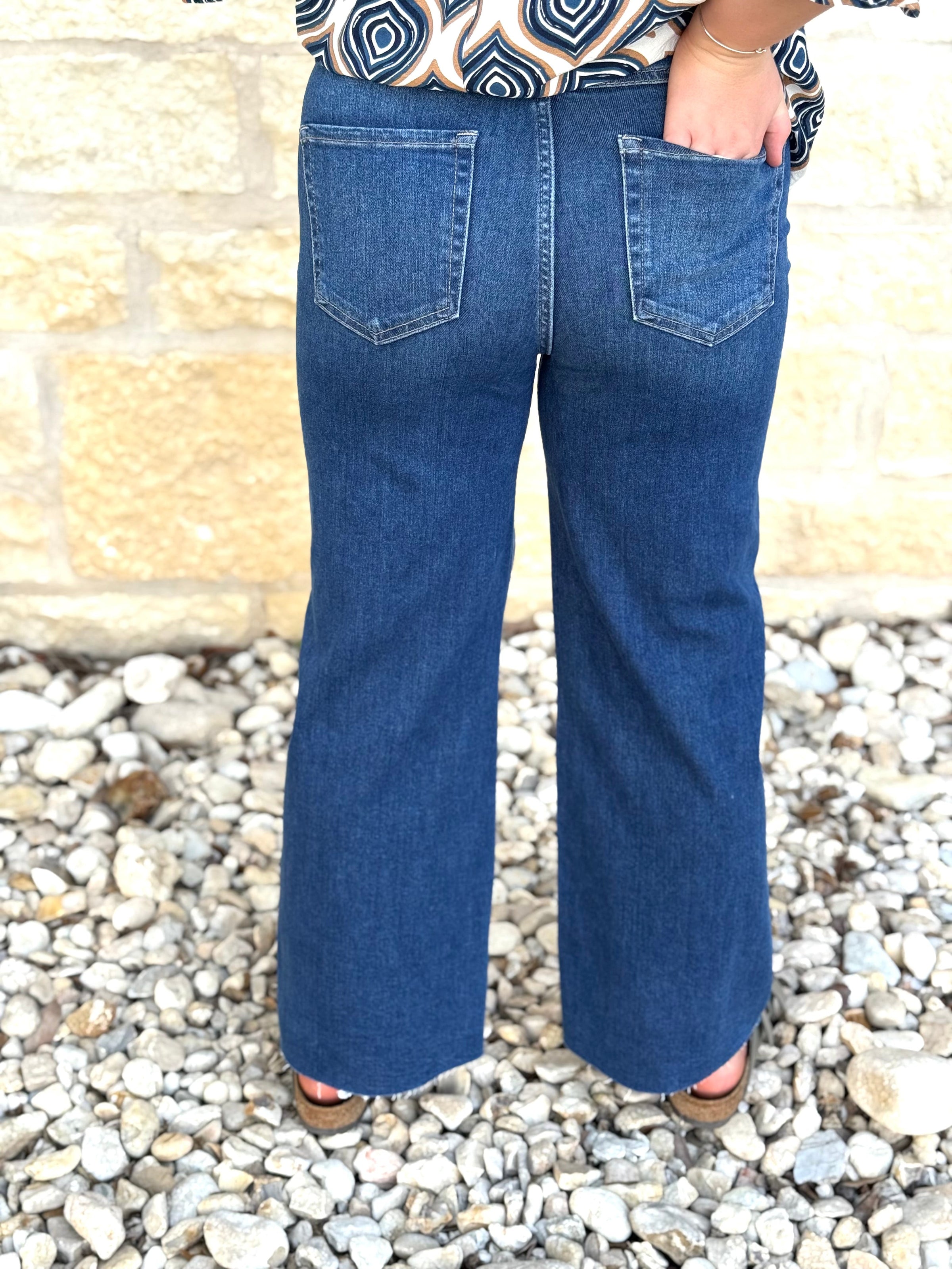 Elevate your denim game with our Risen Holly Wide Leg Crop Jeans. Perfect for any occasion, these non-distressed jeans feature a raw hem that can be easily tailored to your height. The tummy control panel smooths and flatters while the dark wash is perfect for the Fall season. Look and feel confident in these figure-flattering jeans.