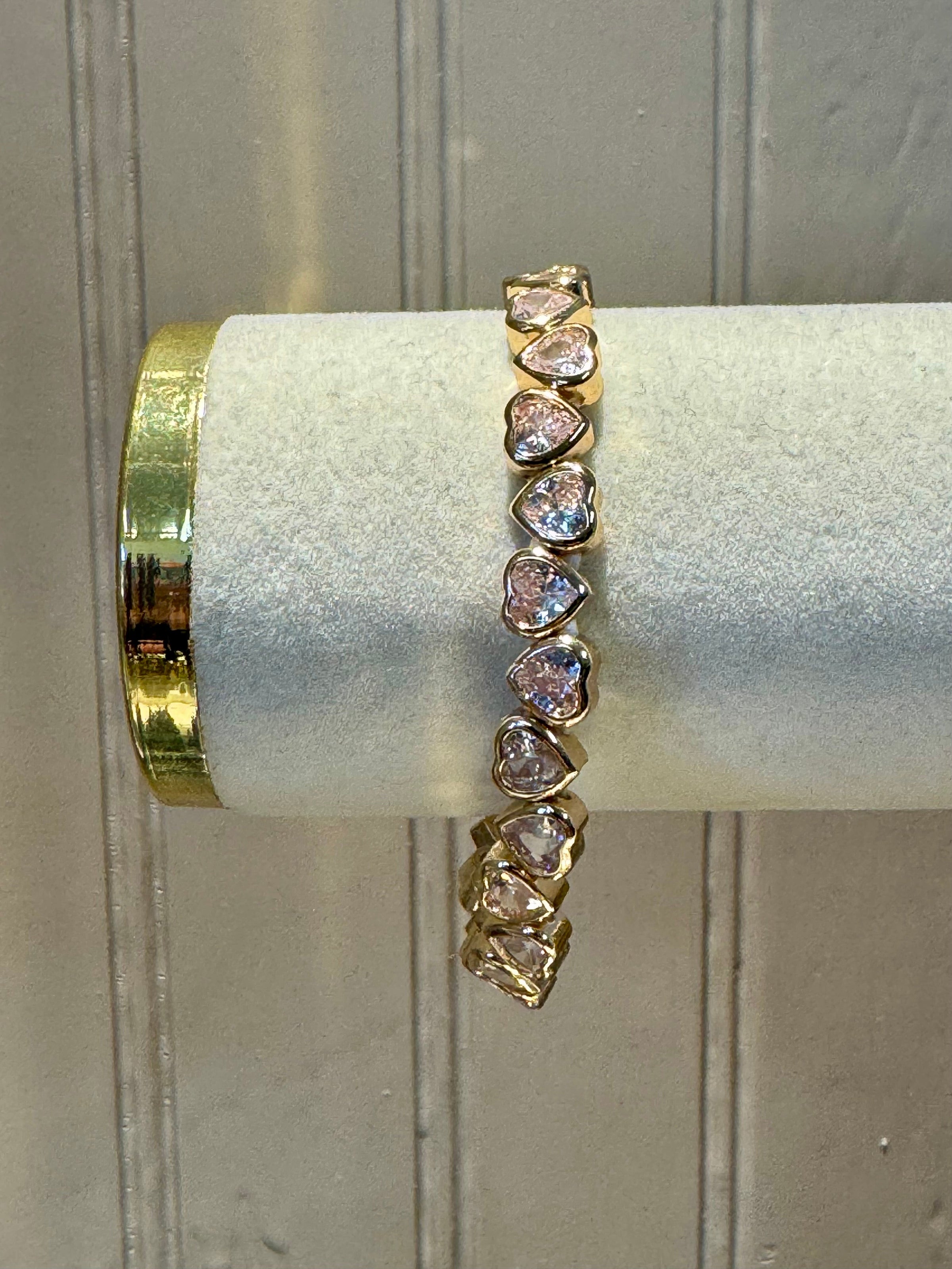 Build your signature stack with this versatile gold heart stretch bracelet. Delicate heart cutouts showcase sparkling clear stones that catch the light beautifully, while the one-size-fits-all stretch design slips on effortlessly and adjusts to your wrist. Layer it solo or combine with other pieces for an elevated, personalized look that feels uniquely yours.