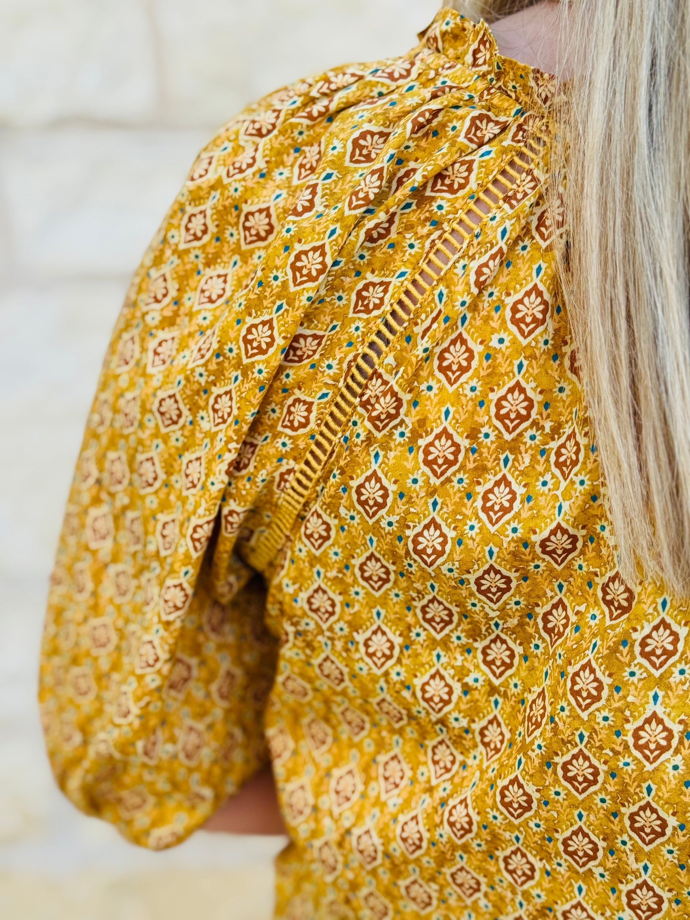 Effortless elegance with the Costa poet's blouse featuring intricate ladder trim detailing.