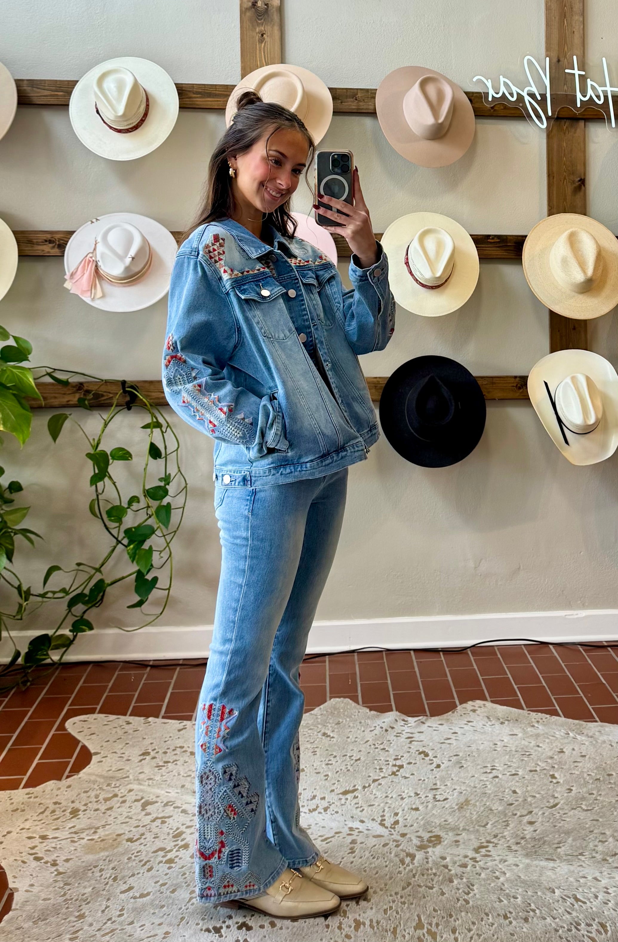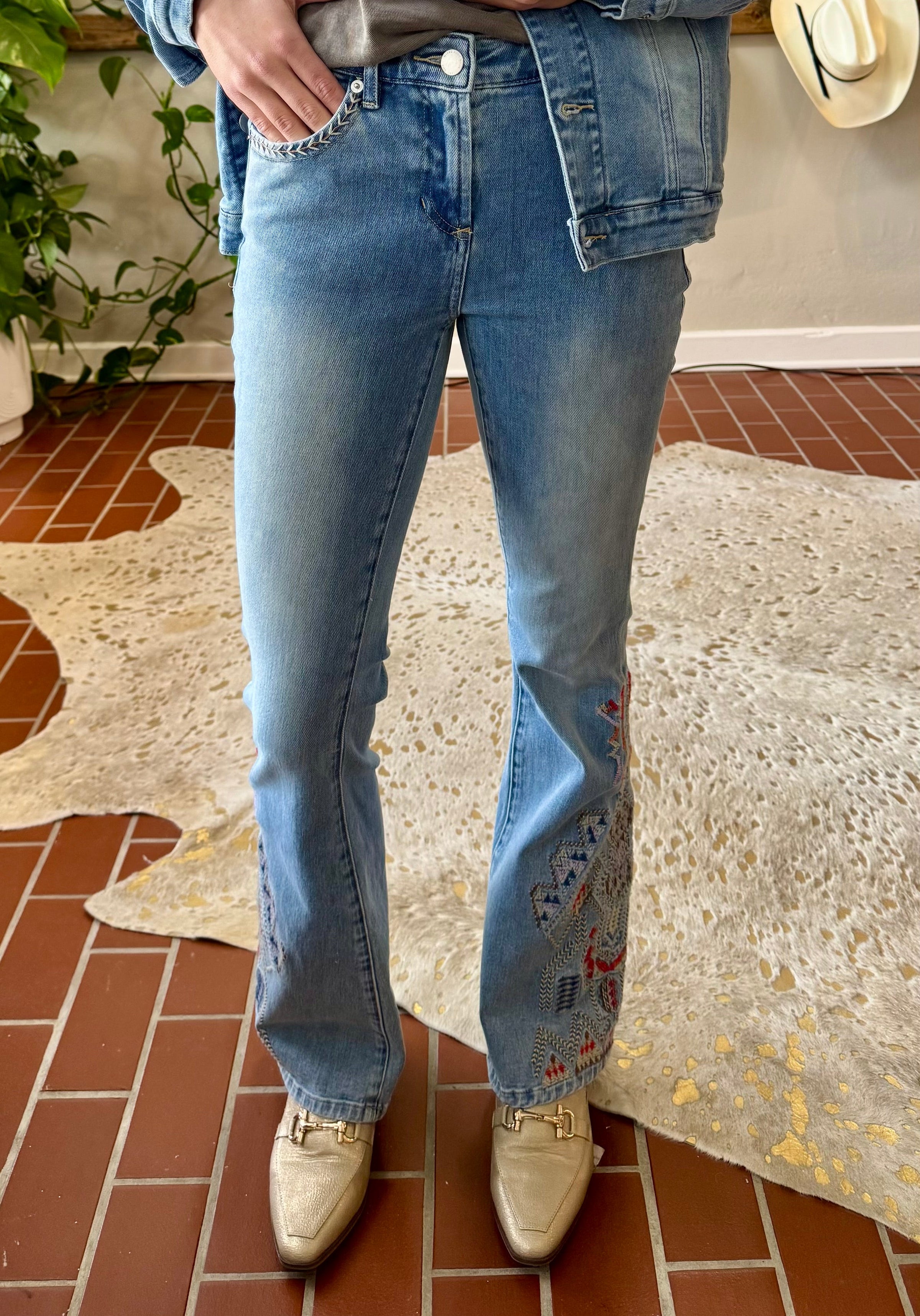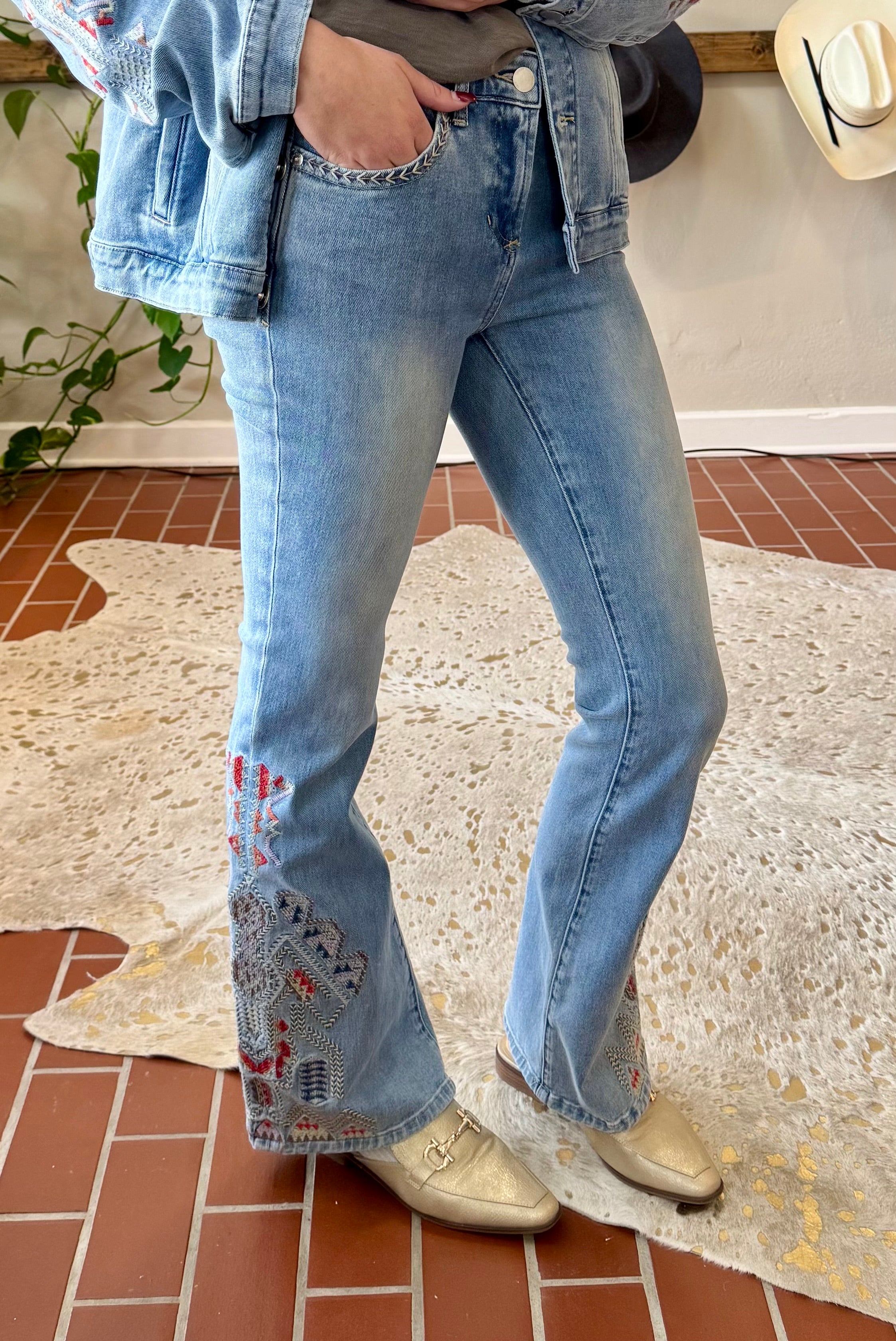 Light wash denim meets southwestern flair in these Dear John Jaxtyn Jeans. The mid-rise bootcut silhouette flatters and moves with you, while intricate Santa Fe embroidery adorns the flares for an eye-catching finish. A customer favorite that effortlessly transitions from casual to statement-making style. Pair with our Dear John Santa Fe Denim Jacket.