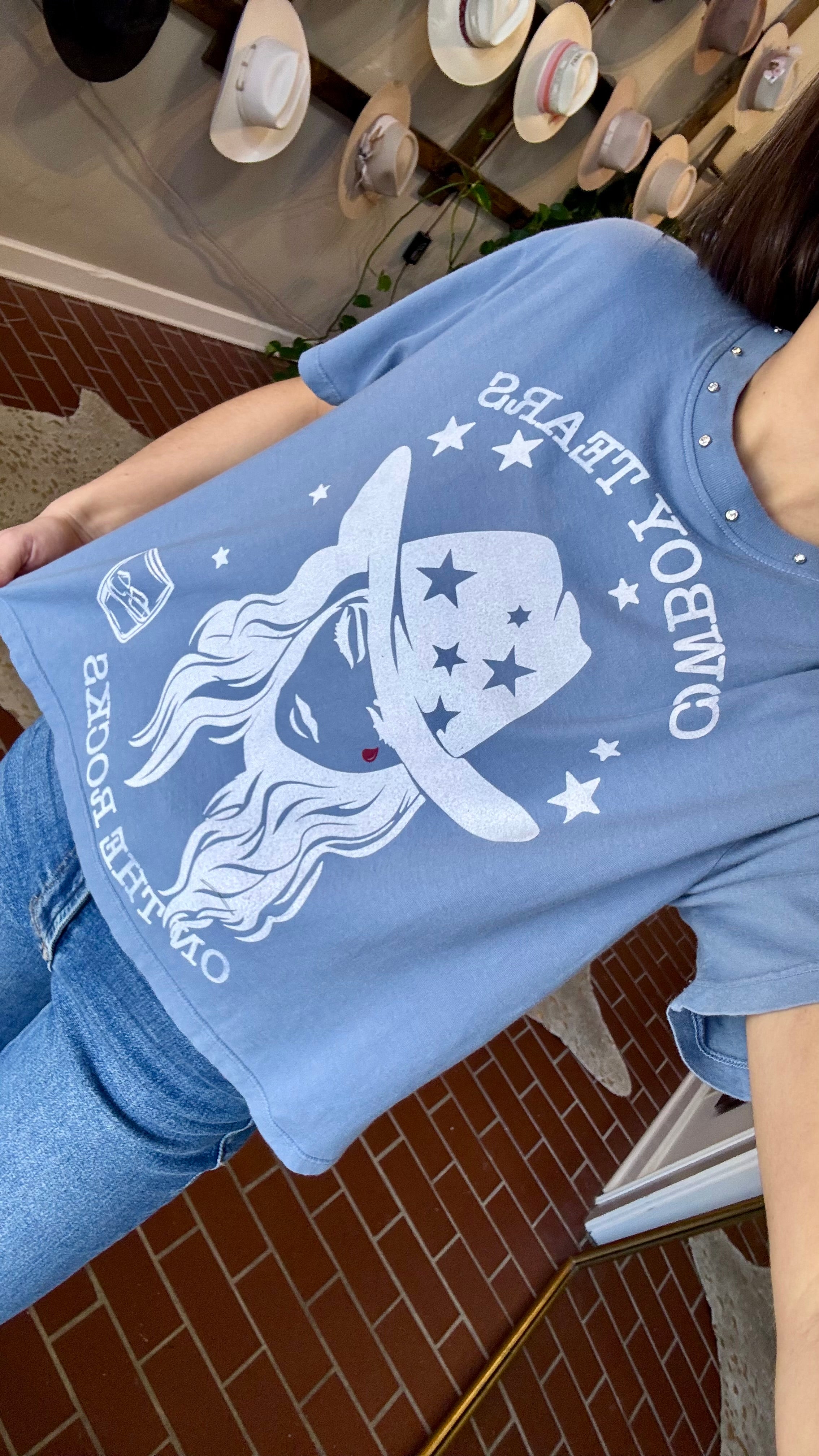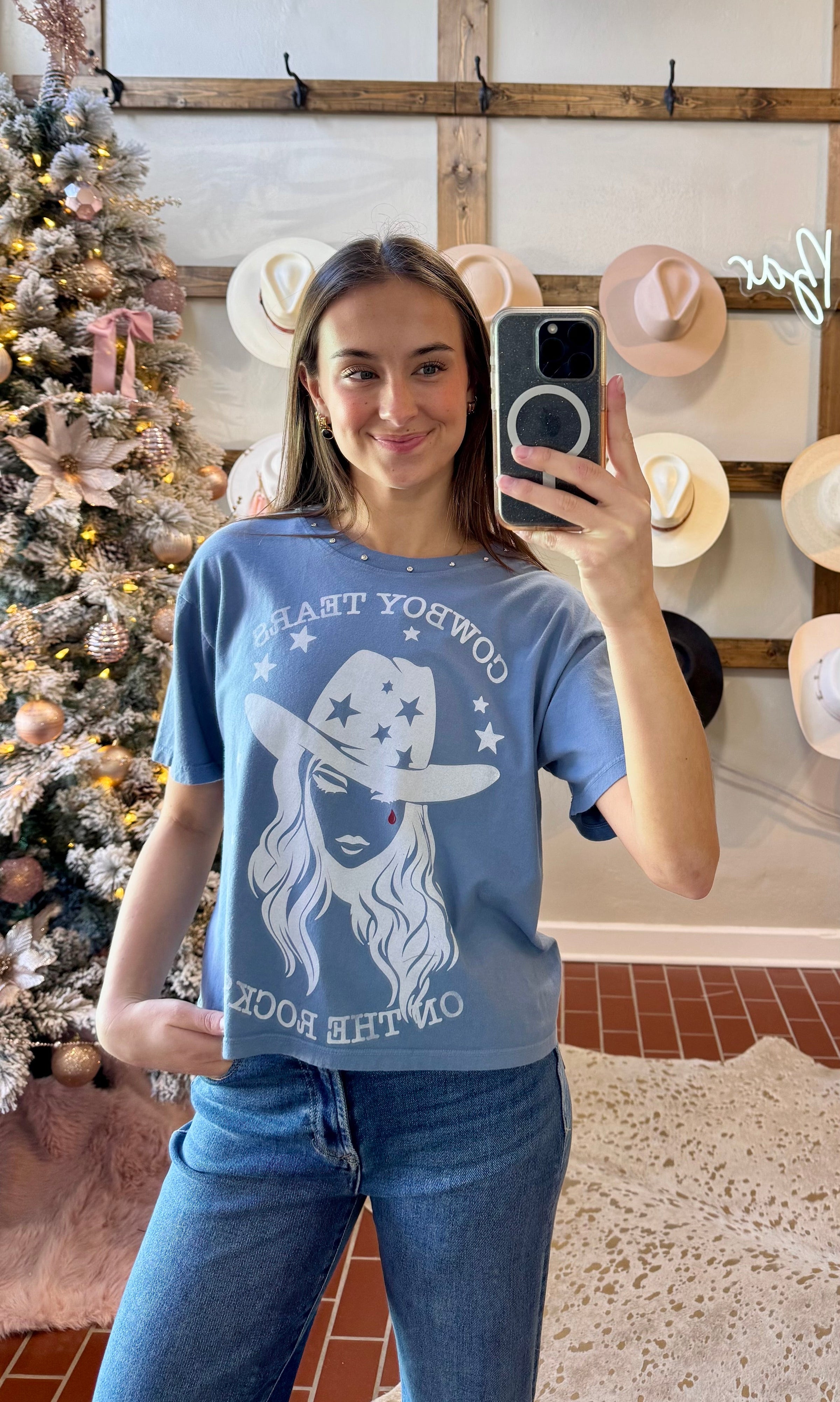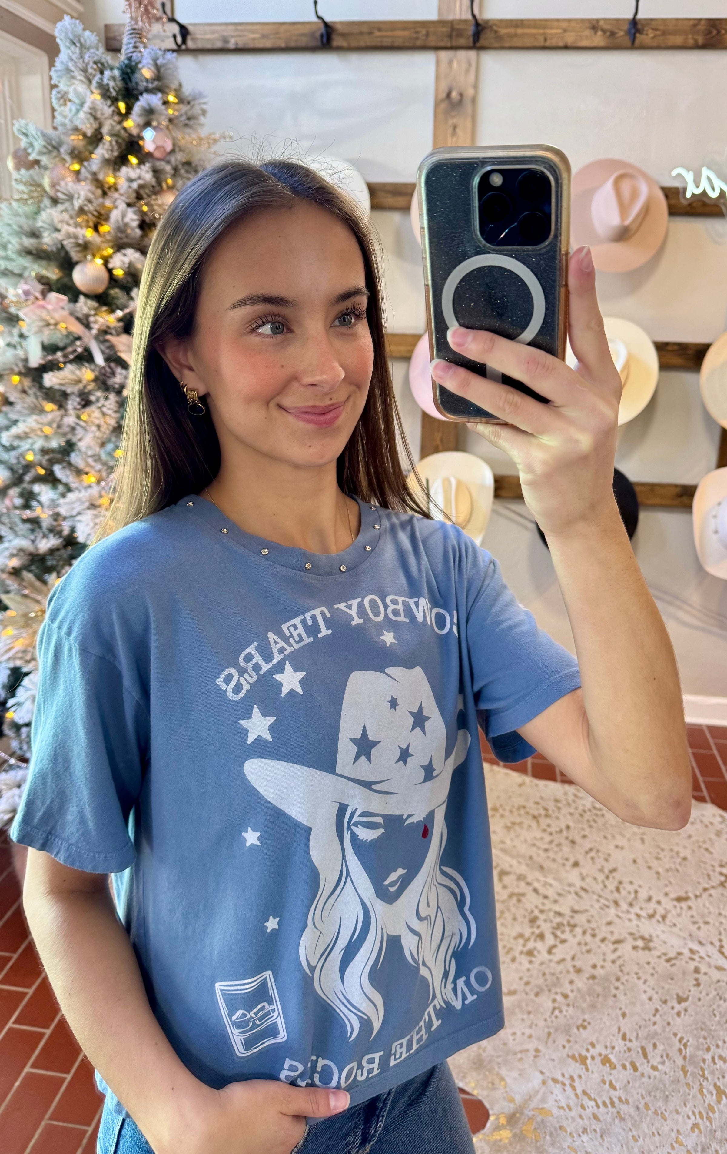 Make a statement at your next country concert with the Cowboy Tears Tee. This vintage baby blue crop tee combines laid-back style with a touch of sparkle thanks to rhinestone brads adorning the collar. Its unique design and comfortable fit make it the perfect choice to stand out while enjoying your favorite country tunes.