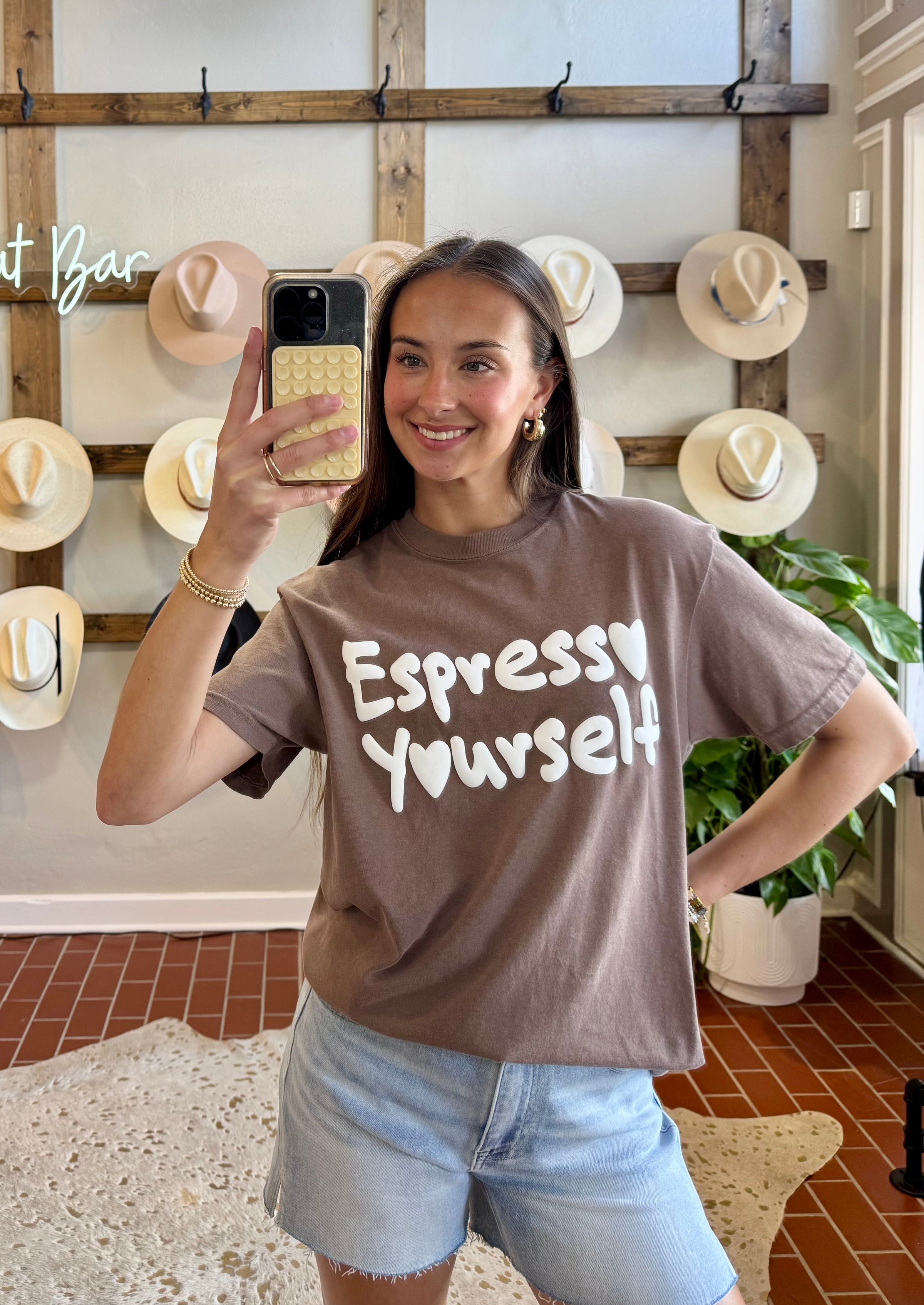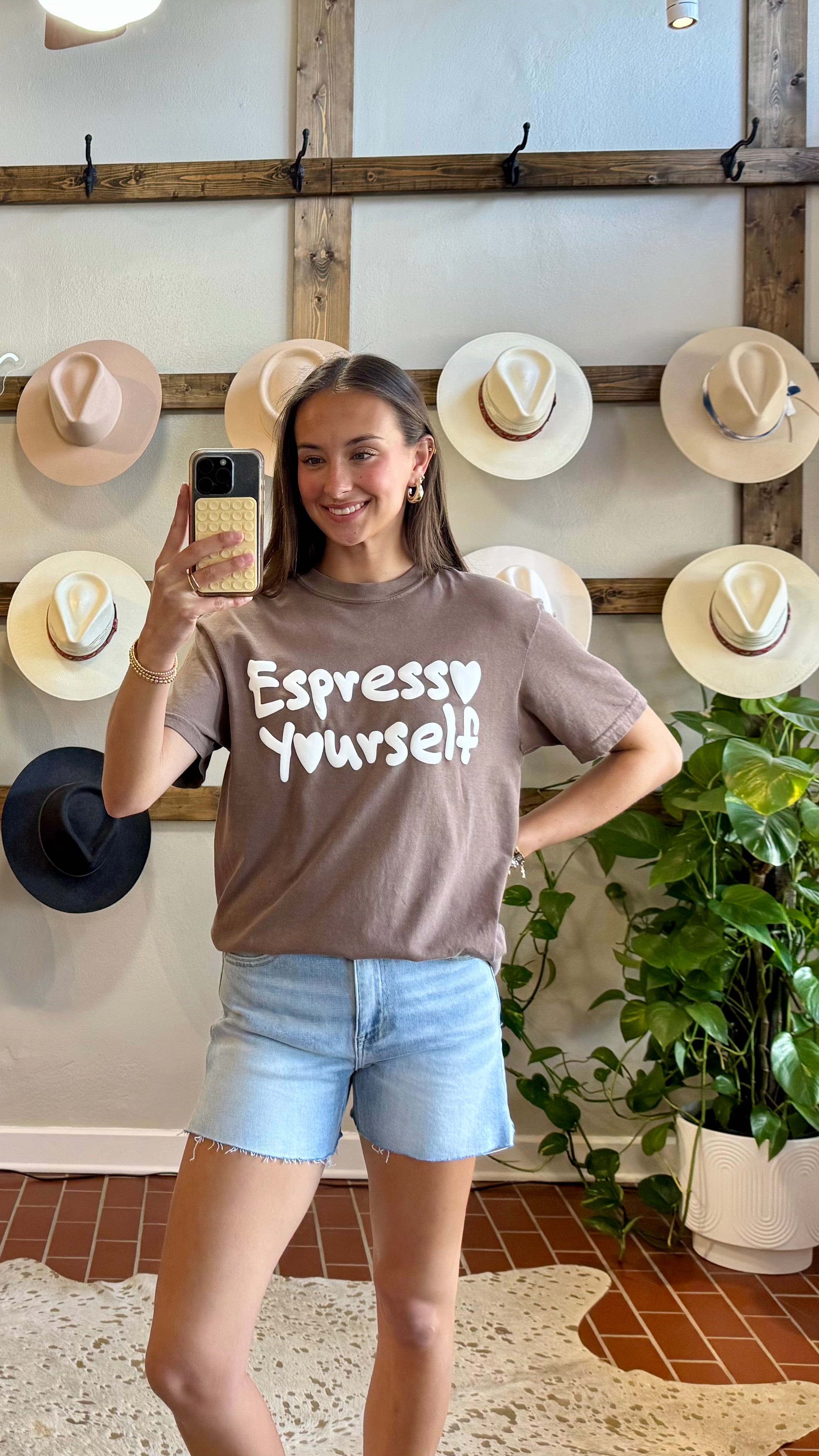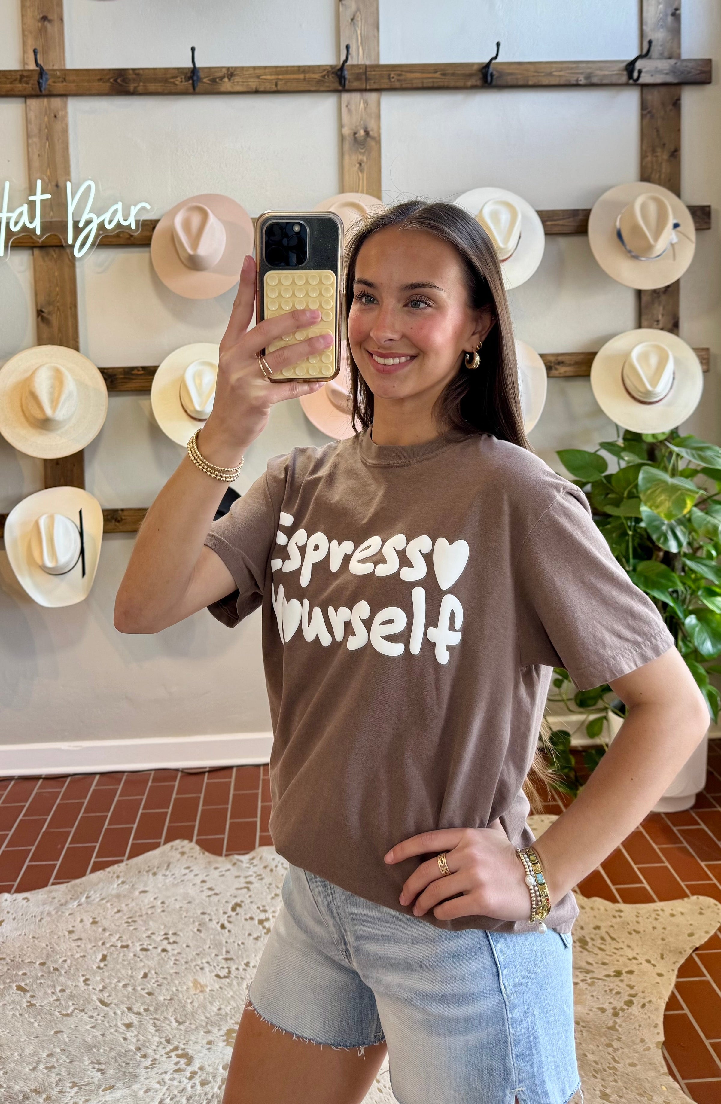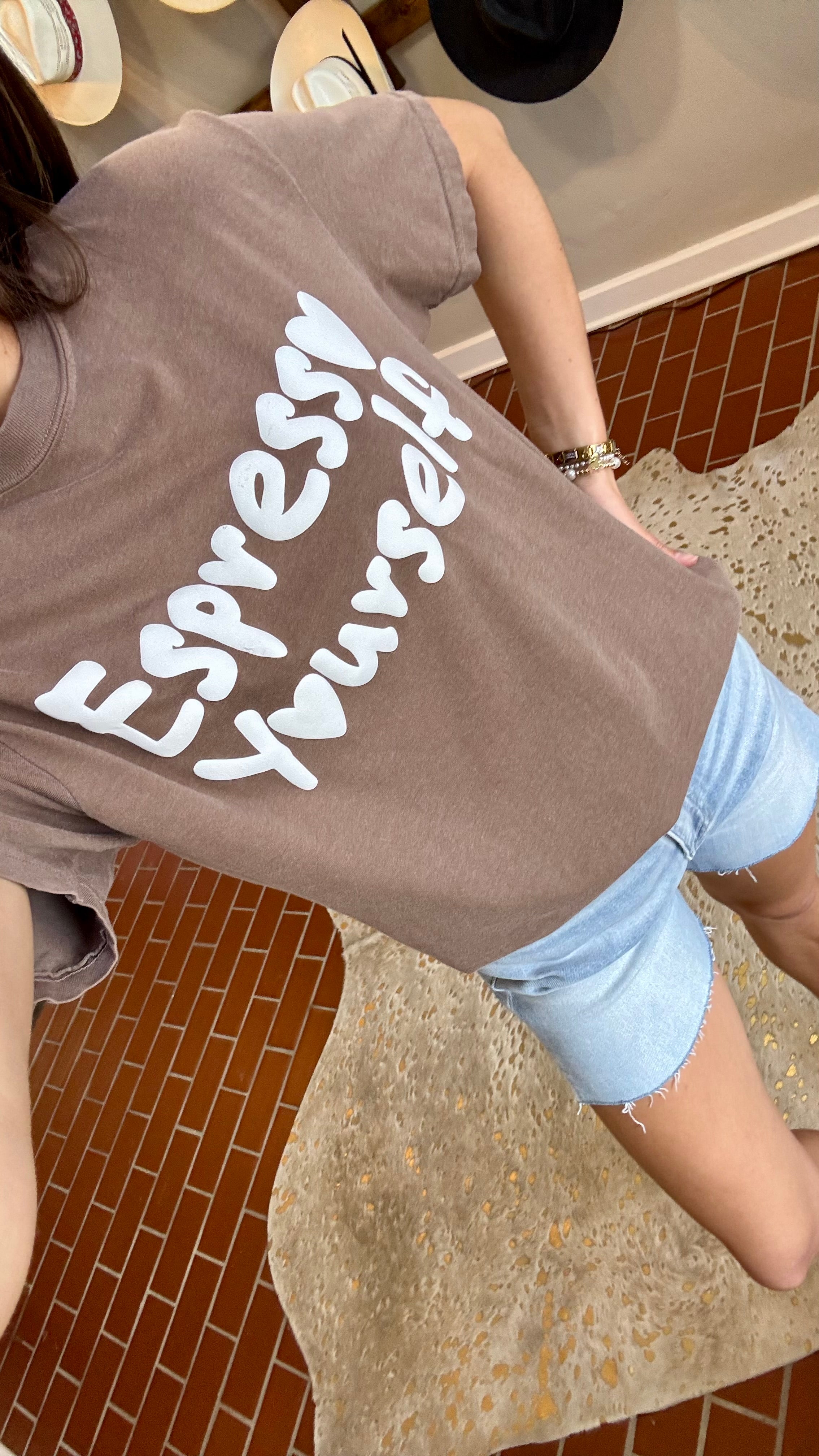 Espresso Yourself Tee Wake up and smell the charm with this delightful chocolate brown tee featuring an adorable puff print design that brings personality to your everyday wardrobe. The raised, tactile print adds dimension and visual interest, making this piece a conversation starter whether you're grabbing your morning coffee or heading out for the day. Soft, comfortable, and undeniably cute, this tee pairs effortlessly with your favorite jeans or casual bottoms for a look that's both playful and put-together.