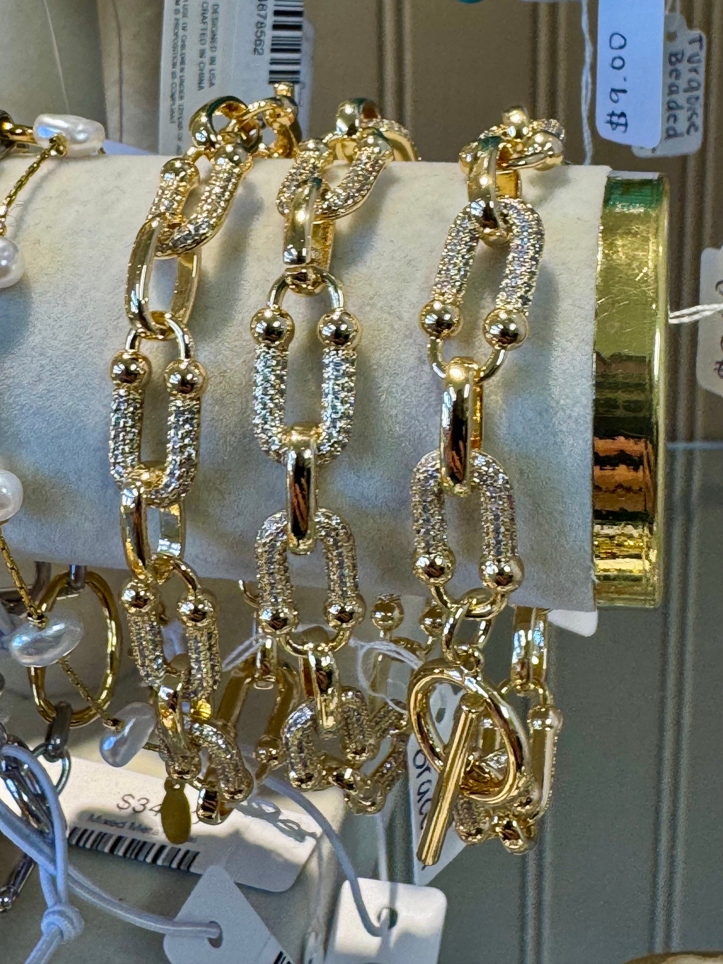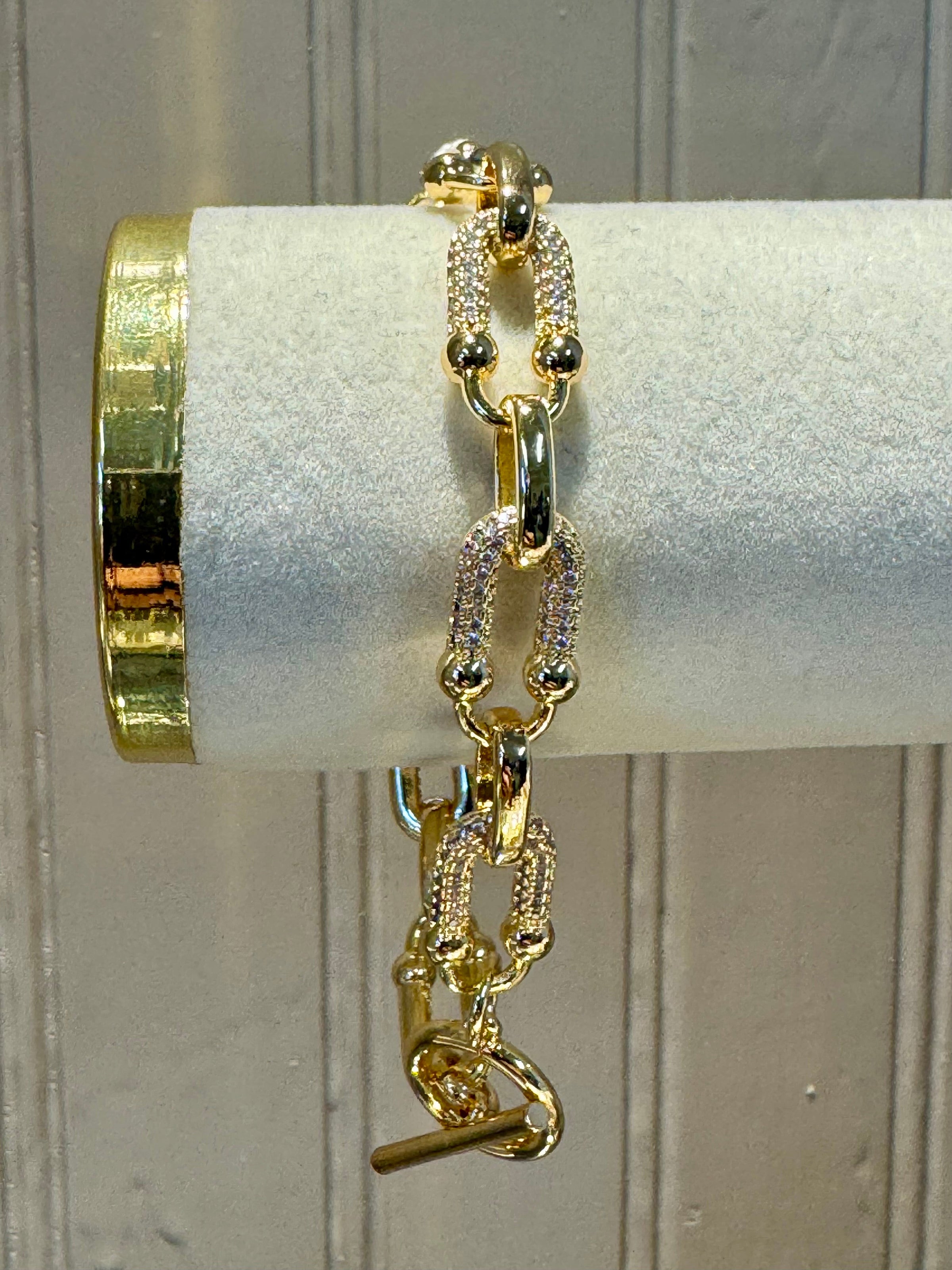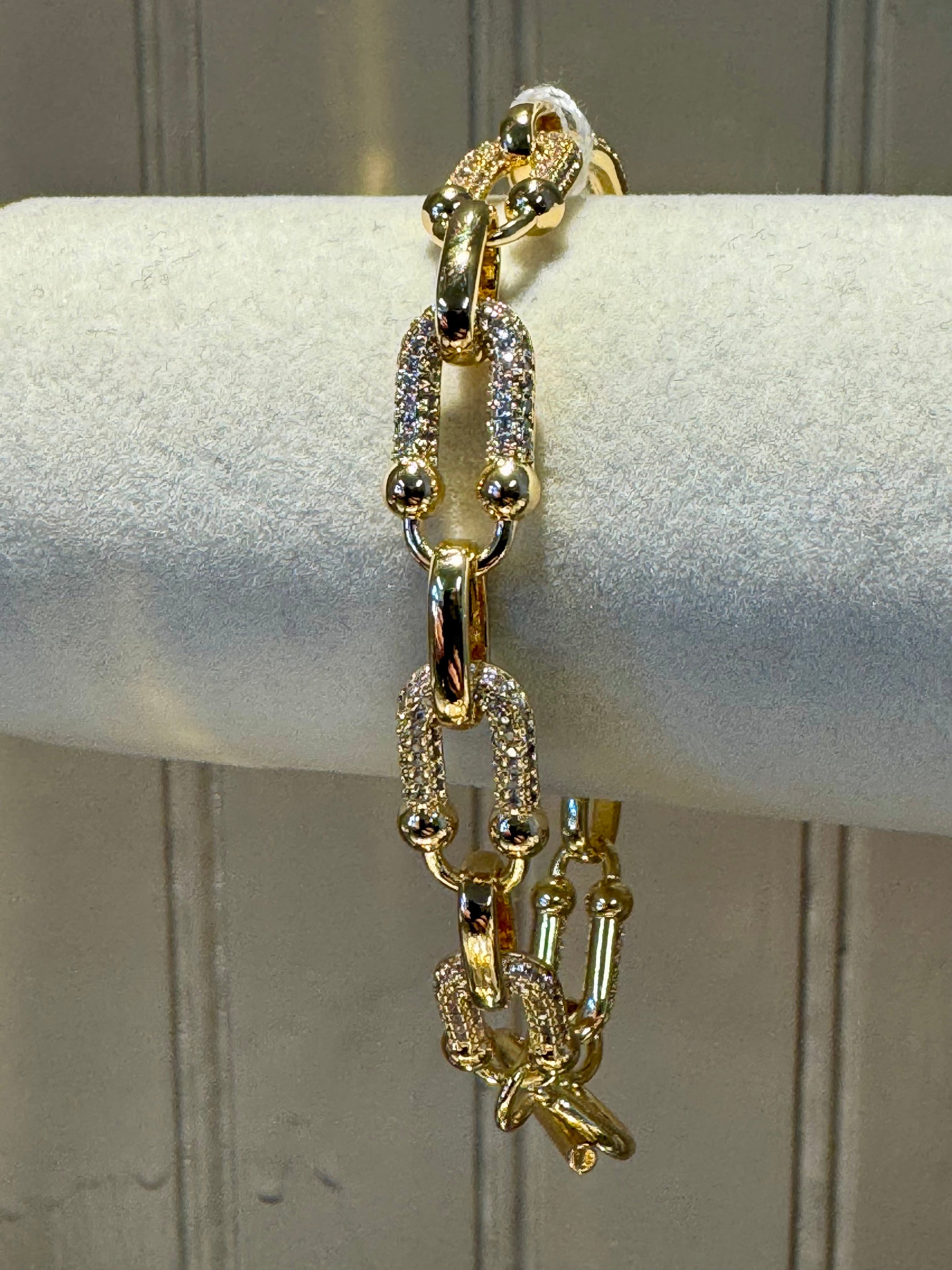 This chunky chainlink bracelet delivers instant glamour to any wrist. Crafted with cubic zirconia and gold-dipped detailing, it strikes the perfect balance between bold and versatile—layer it with your favorite pieces or let it command attention on its own. A statement-making essential that elevates both casual and dressed-up looks.