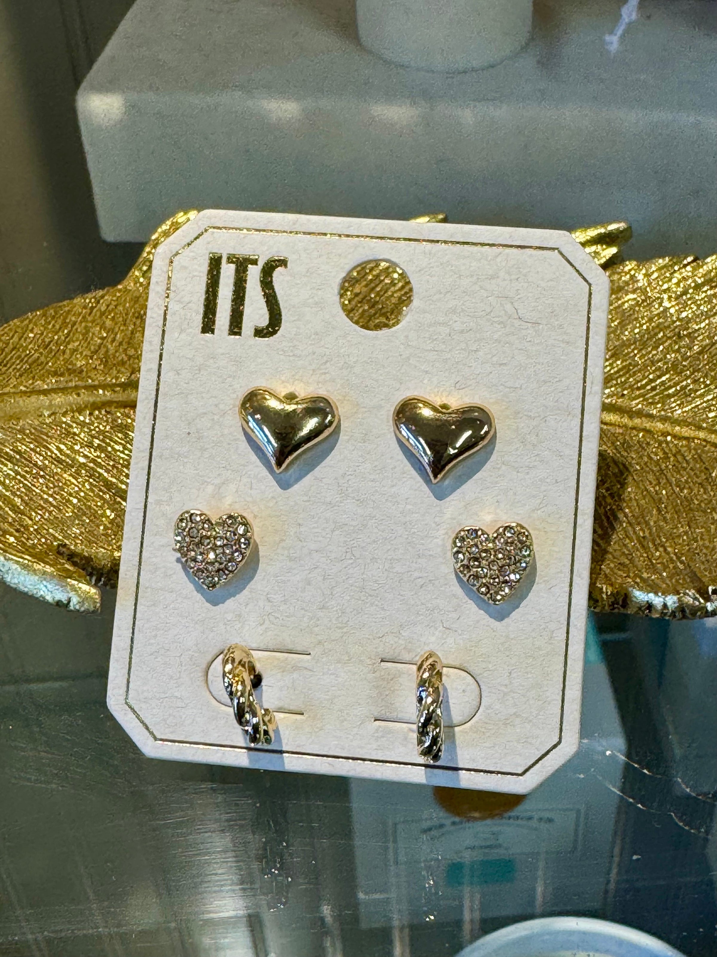 Introduce her to timeless elegance with this charming Sweetheart Earring Set—the ideal gift for any young jewelry lover. This curated trio includes two pairs of delicate heart studs and one pair of classic gold hoops, offering versatile styling options for everyday wear and special occasions. Crafted with safety in mind, each piece is lead and nickel compliant, ensuring peace of mind for sensitive skin. Perfect for building her jewelry collection with pieces she'll treasure for years to come.