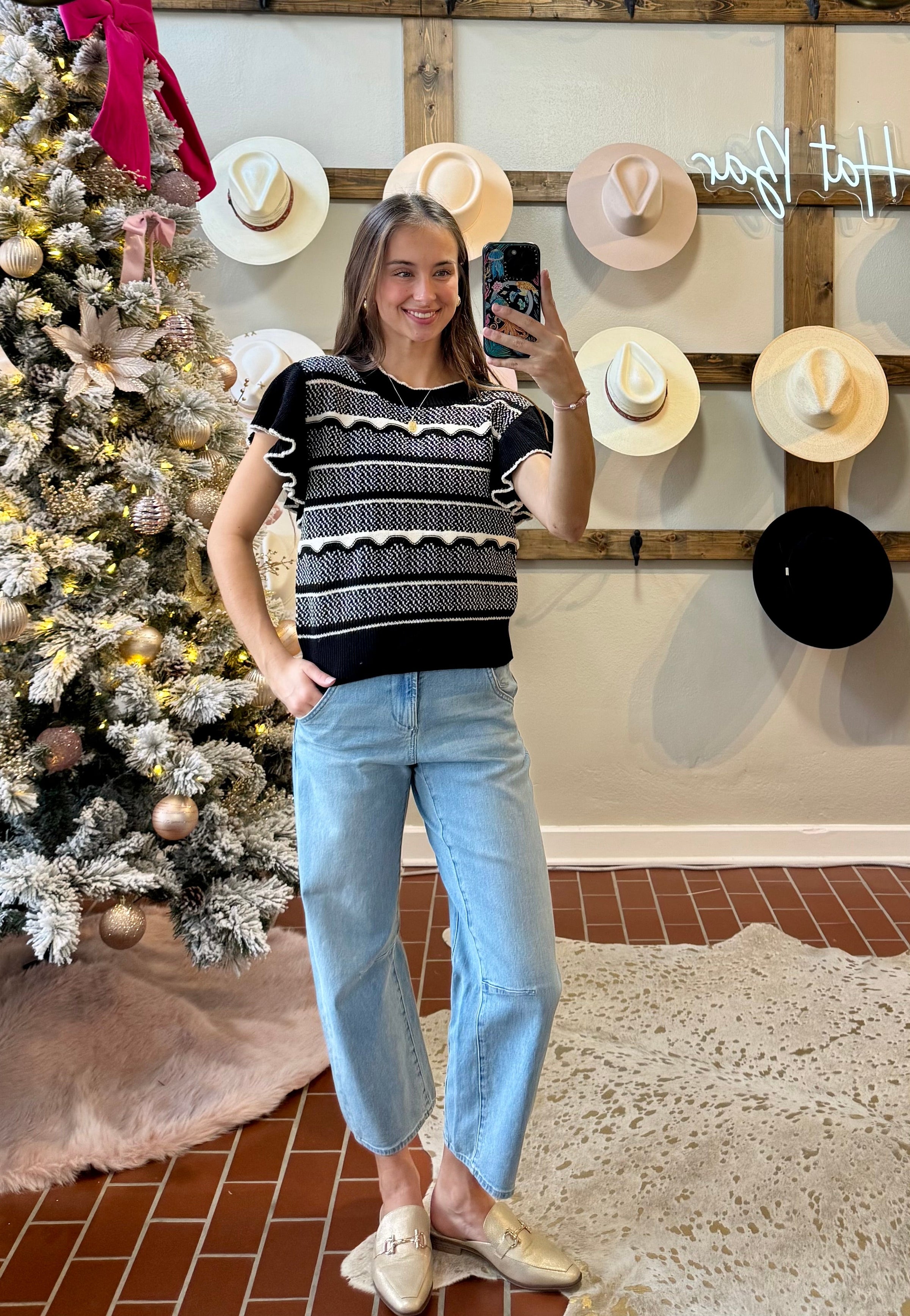 Experience the perfect blend of style and comfort with Another Love's Bethany Top! This black and white knit top features ruffled sleeves and a round neck design, adding a fun and trendy touch to any outfit. Elevate your wardrobe and let your unique personality shine through with this must-have piece!