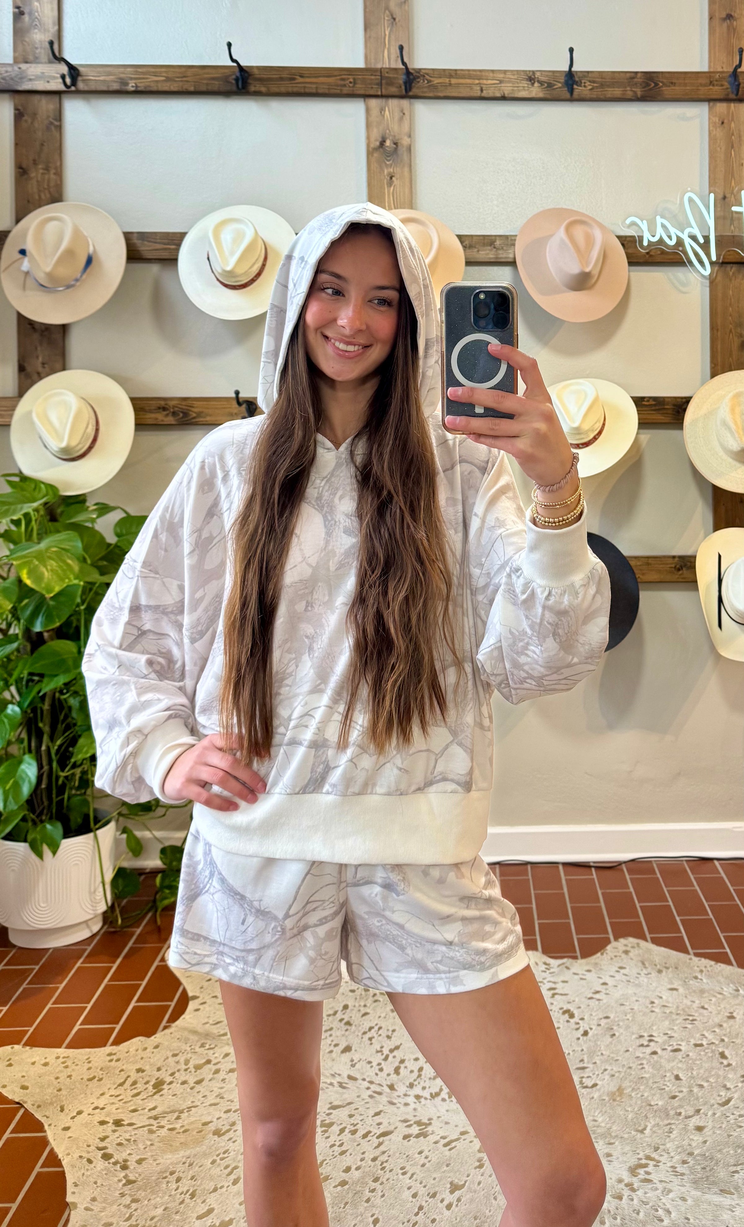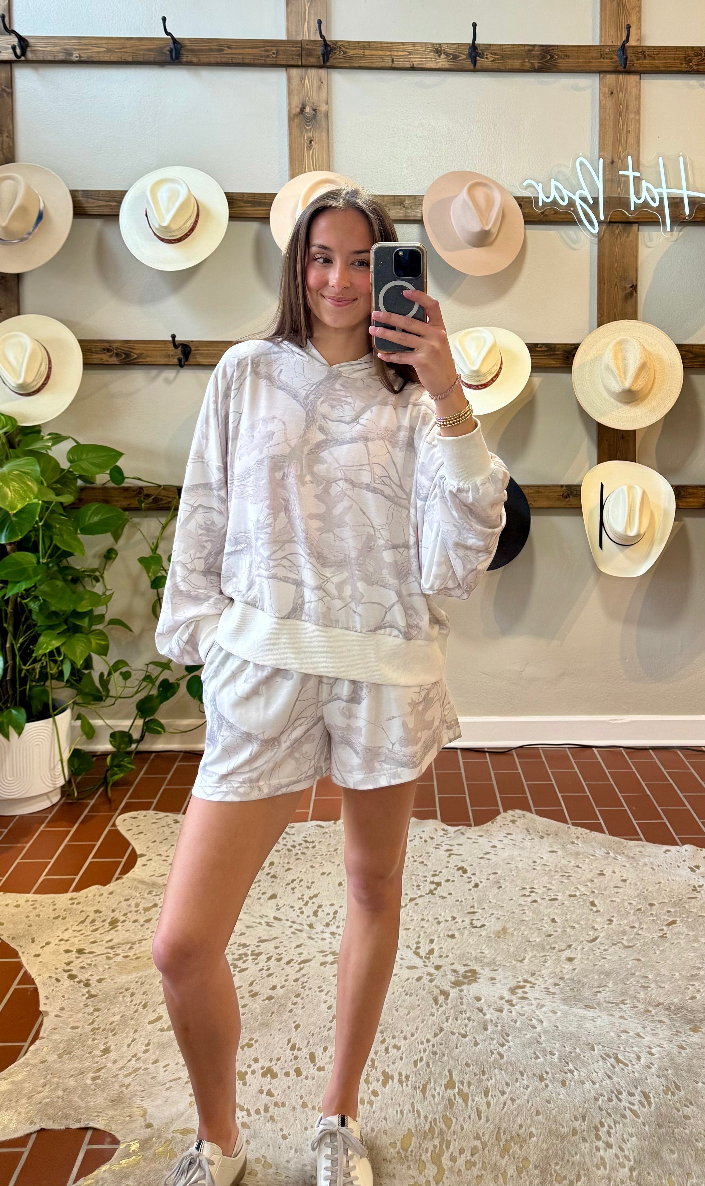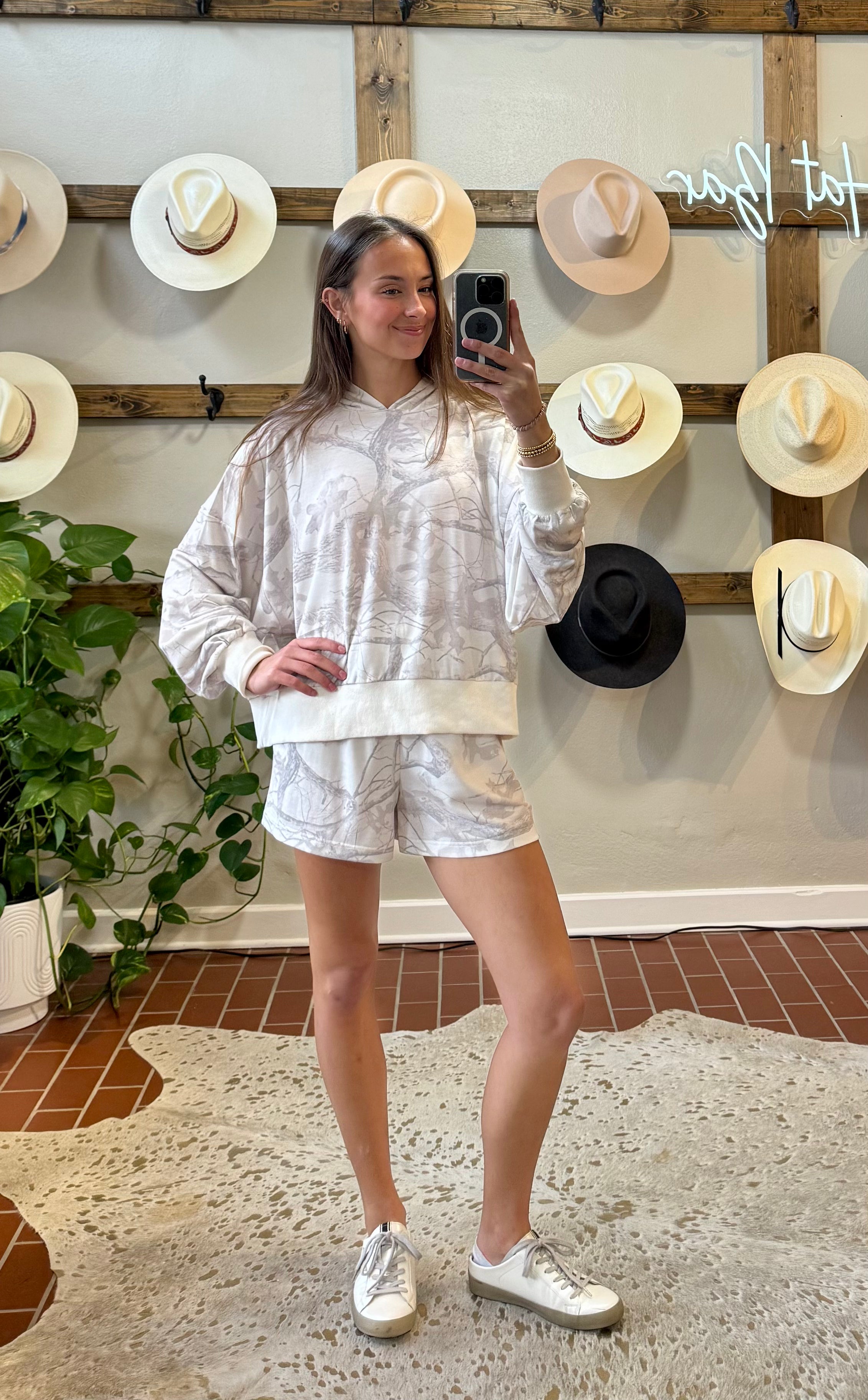 Embrace effortless style with this lightweight camo hoodie and shorts set. The allover camouflage print delivers contemporary edge, while ribbed hems and cuffs ensure a refined fit that moves with you. Crafted from a breathable cotton-blend fabric with just enough stretch, this duo transitions seamlessly from casual outings to relaxed weekends. The elastic waist shorts pair perfectly for coordinated comfort. At 21½" (top) and 16" (shorts), this set offers versatile layering potential. Ideal for those who value both visual impact and wearability.