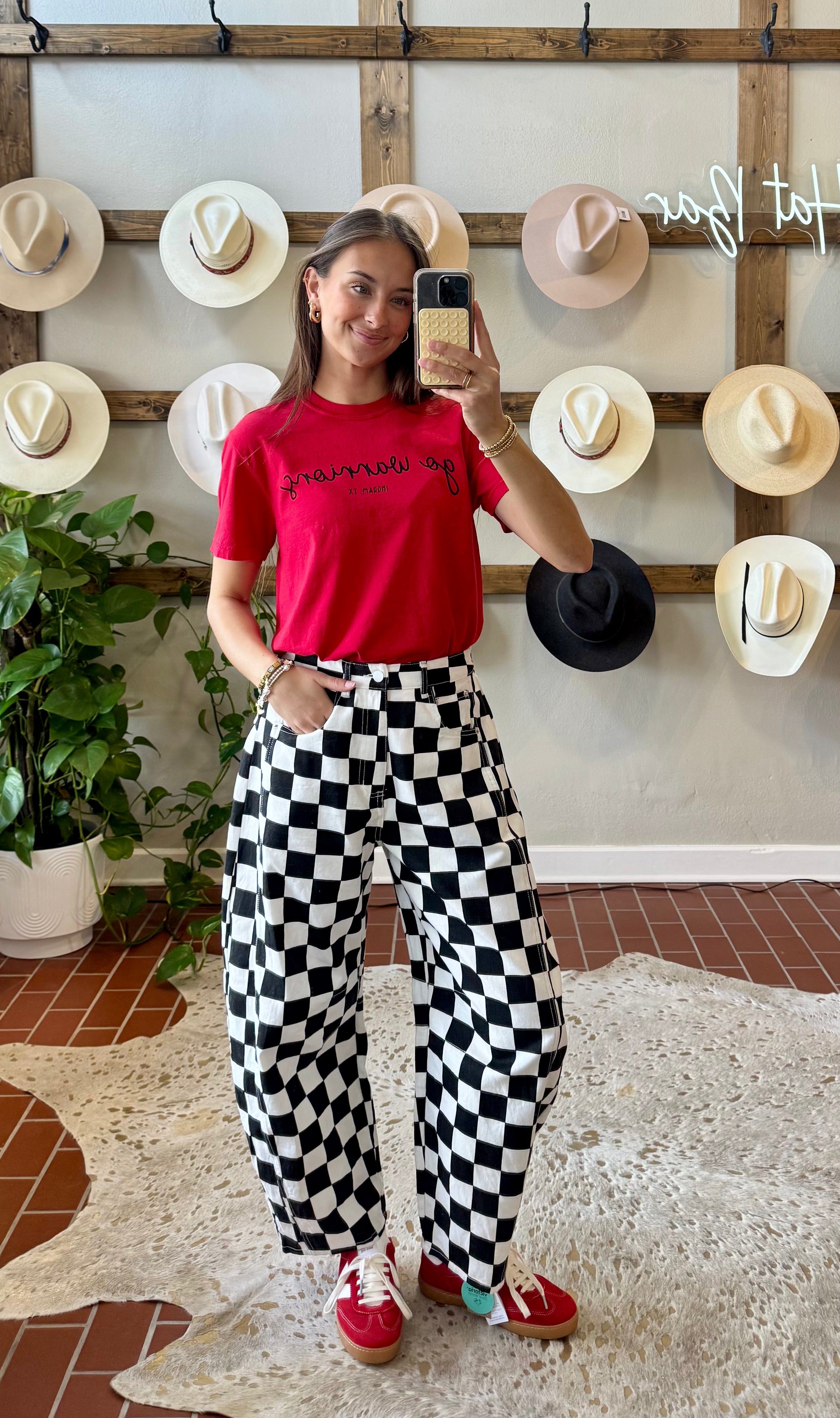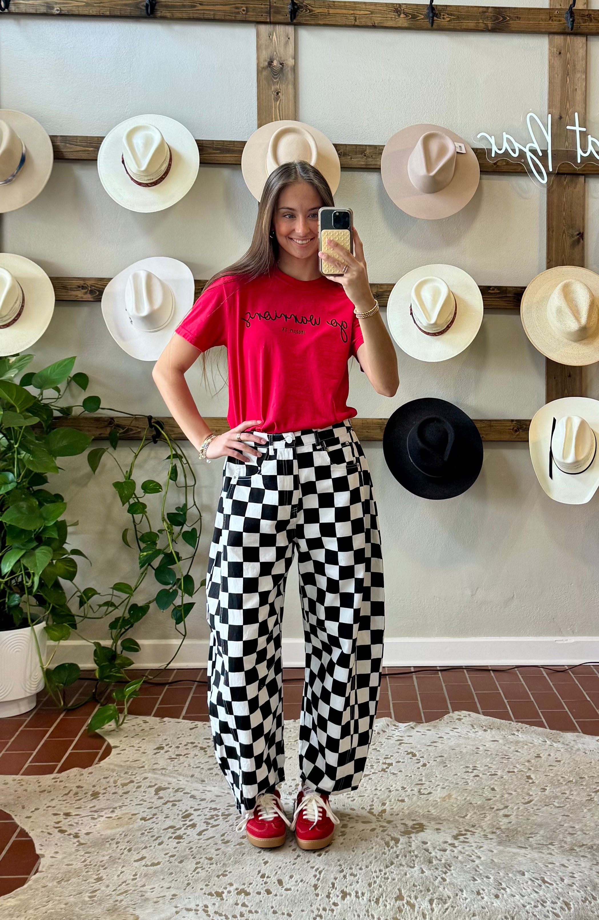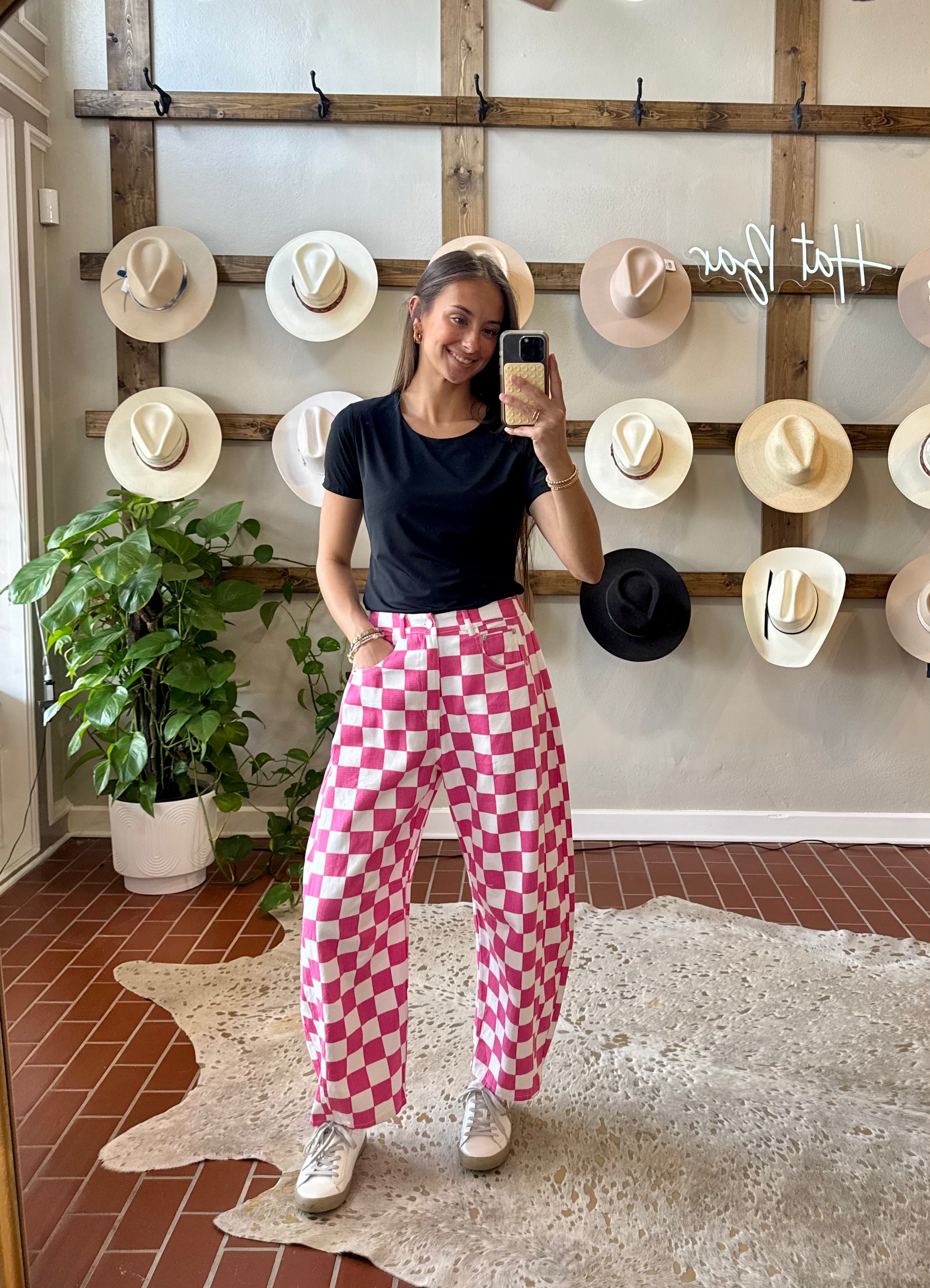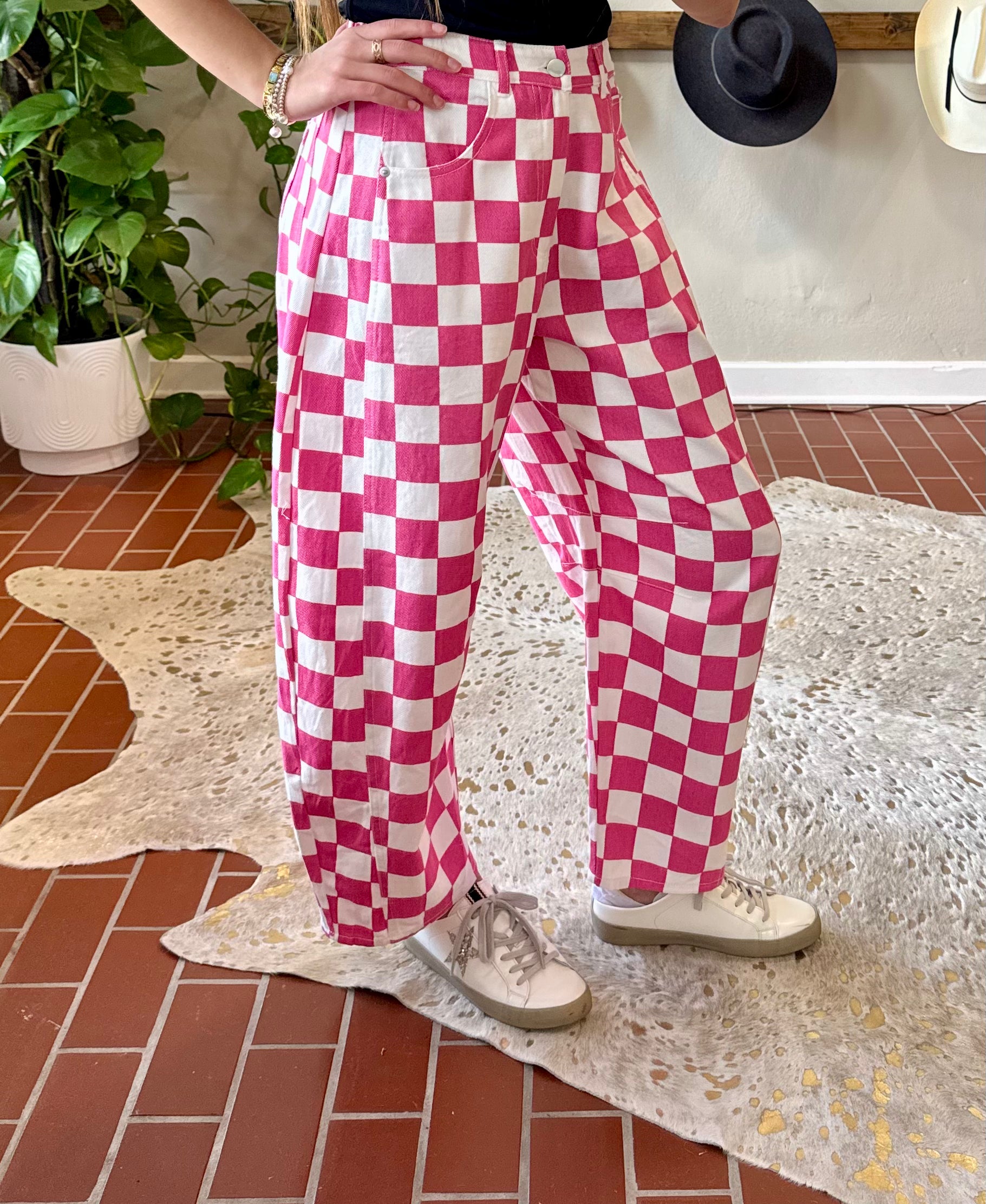 Elevate your seasonal wardrobe with these charming checkered barrel jeans. The playful pink hue brings a fresh, vibrant touch perfect for spring and summer adventures. Style them with a game day tee for spirited weekend vibes or pair with a western graphic tee for that effortless, trendy look. The barrel silhouette offers a modern twist on a classic denim staple, making these jeans versatile enough for casual outings or laid-back gatherings. A fun essential that captures the carefree spirit of the season. Features an elastic panel on the back of the waistband .
