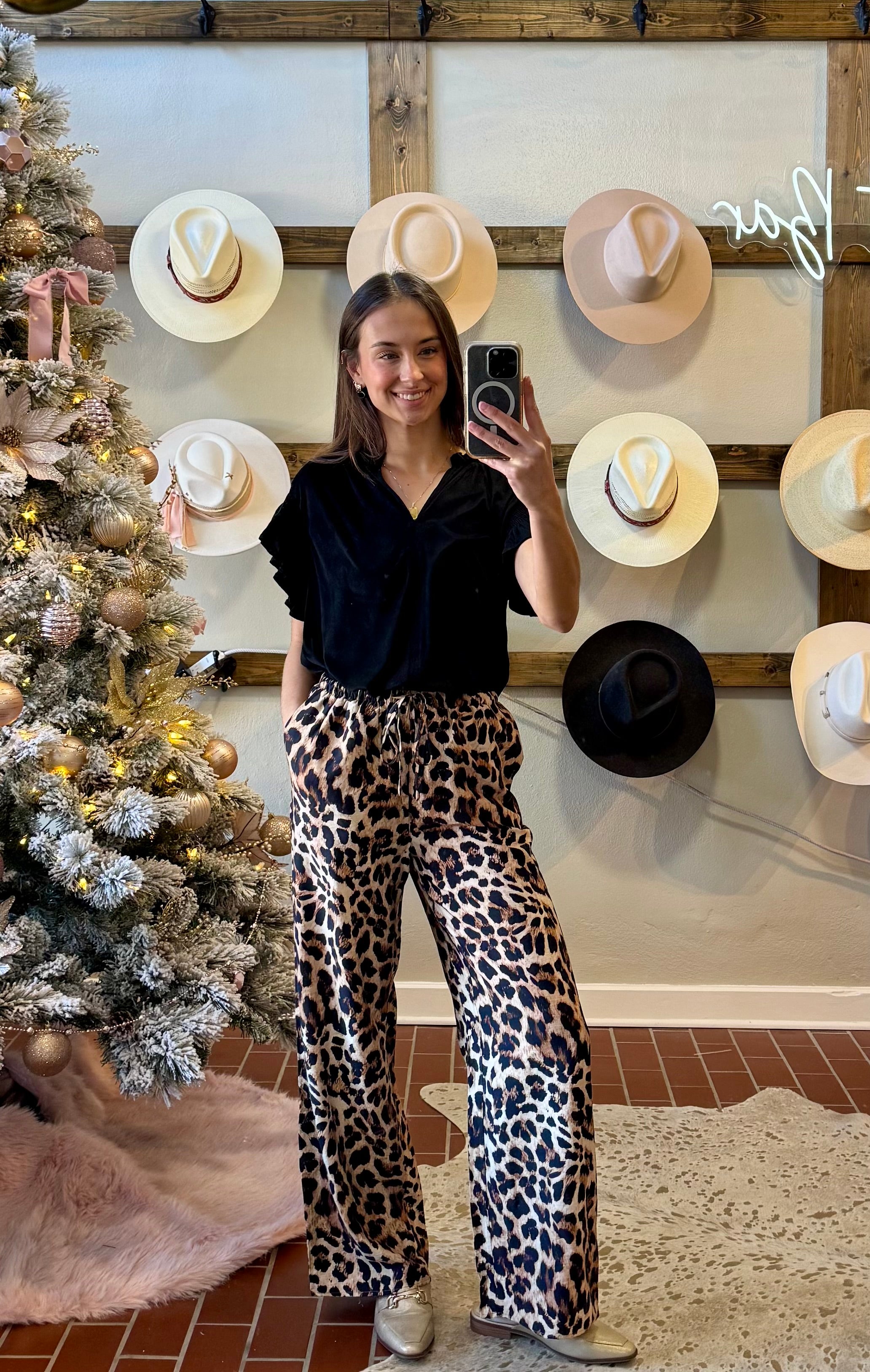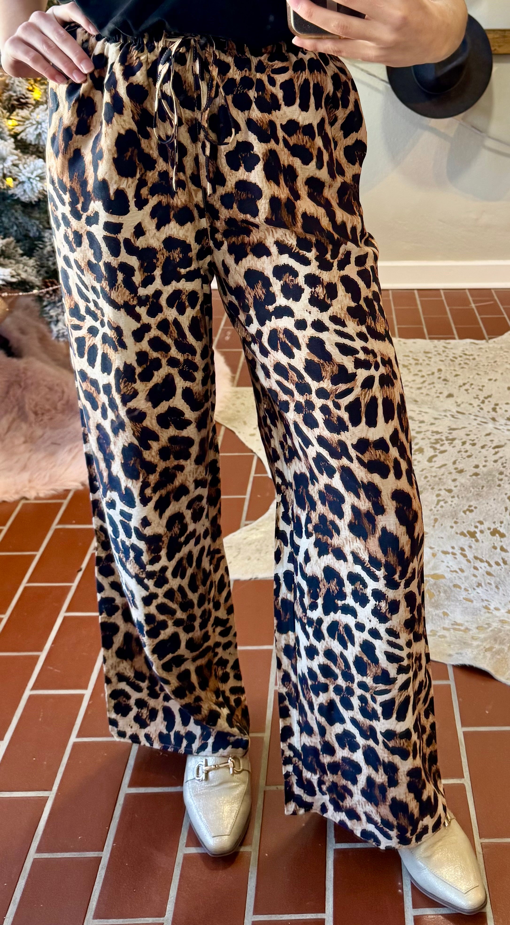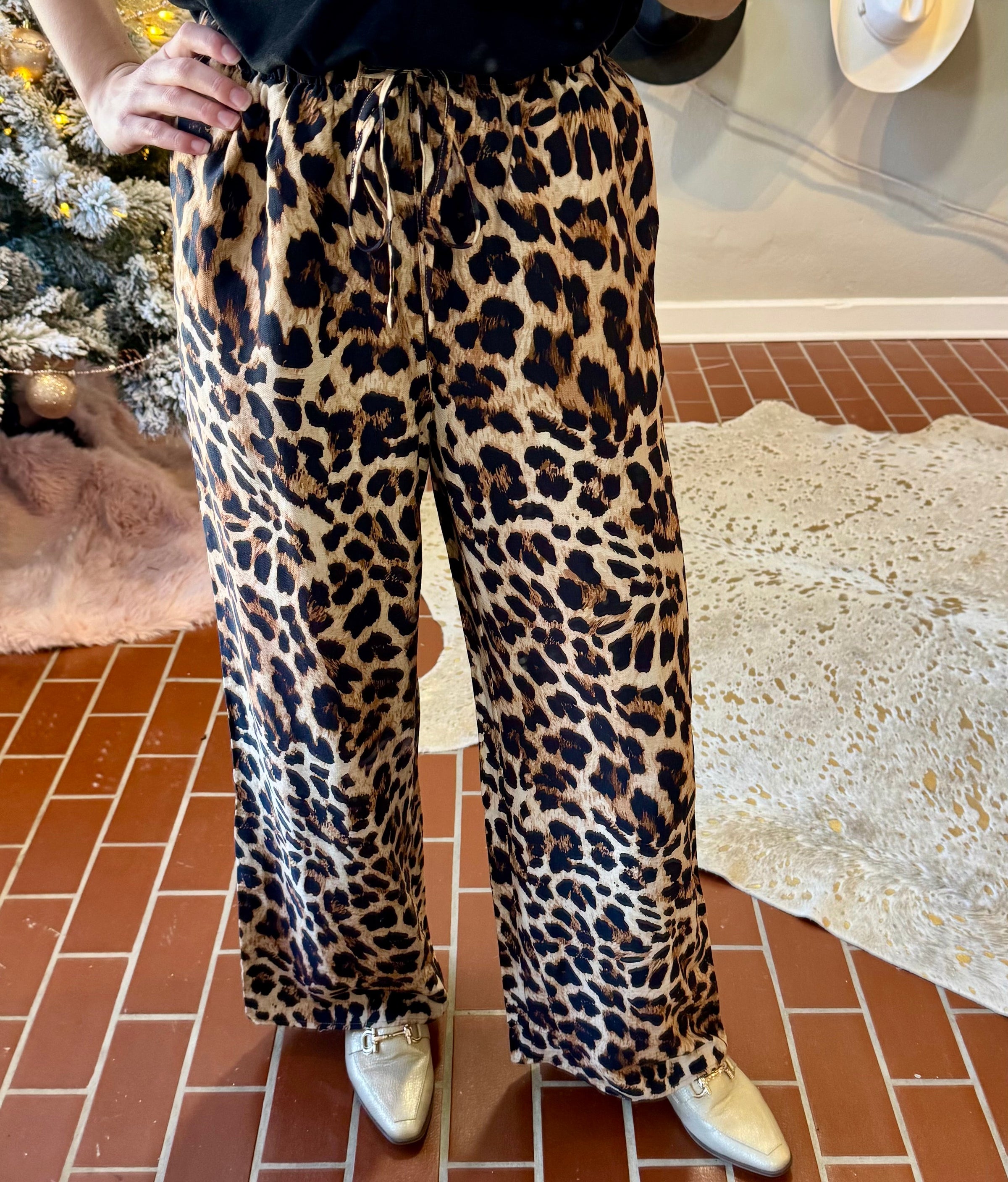 Embrace wild style with these Cheetah Love Pants, featuring an eye-catching cheetah print that instantly elevates any outfit. The adjustable drawstring waist ensures a comfortable, customizable fit for all-day wear. Pair these statement wide-leg pants with a sleek black top to create an effortlessly chic fall ensemble that balances bold pattern with timeless sophistication. Perfect for those who dare to stand out while maintaining an air of elegance.