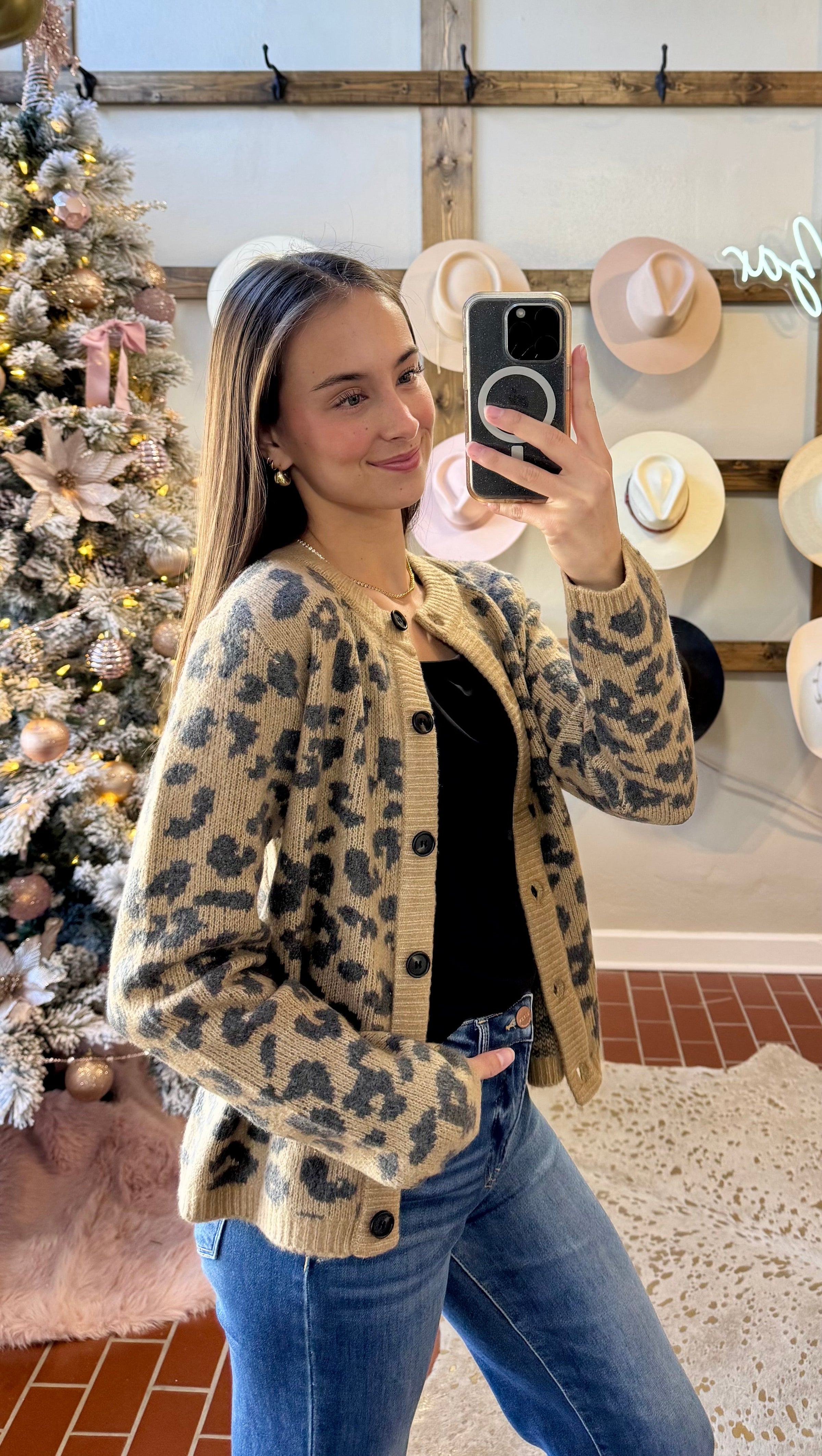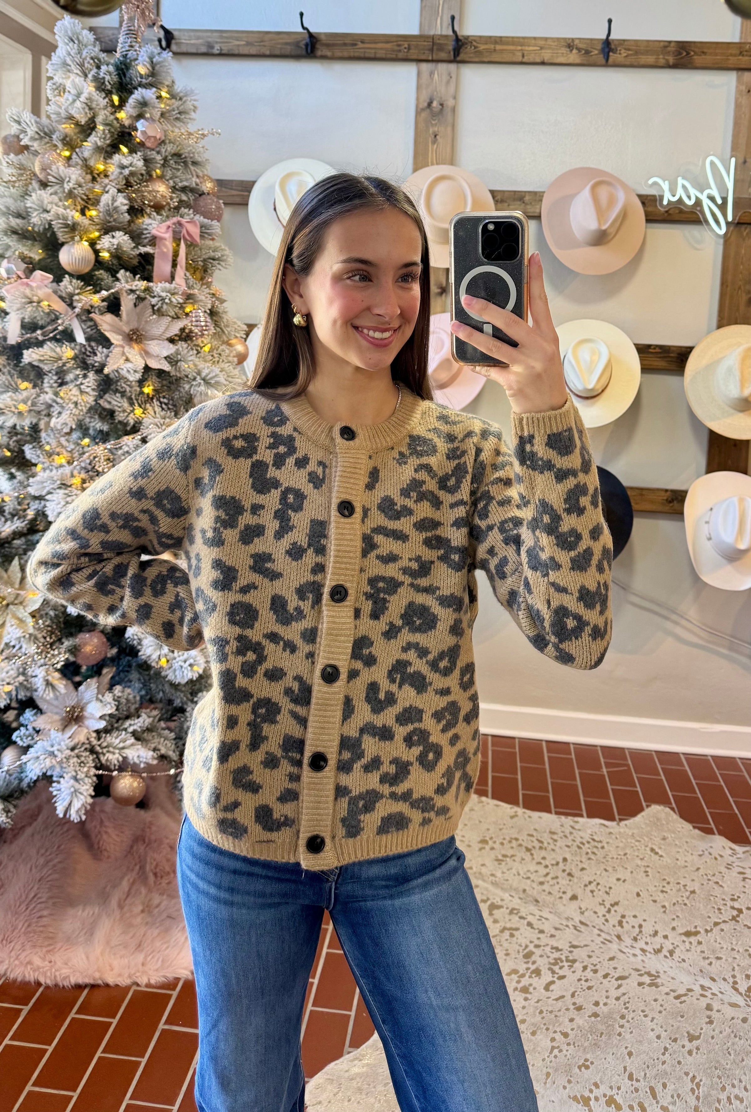 Amina cardigan sweater in long sleeve jacquard featuring a striking leopard print, offers a classic fit that is perfect for layering or wearing on its own.