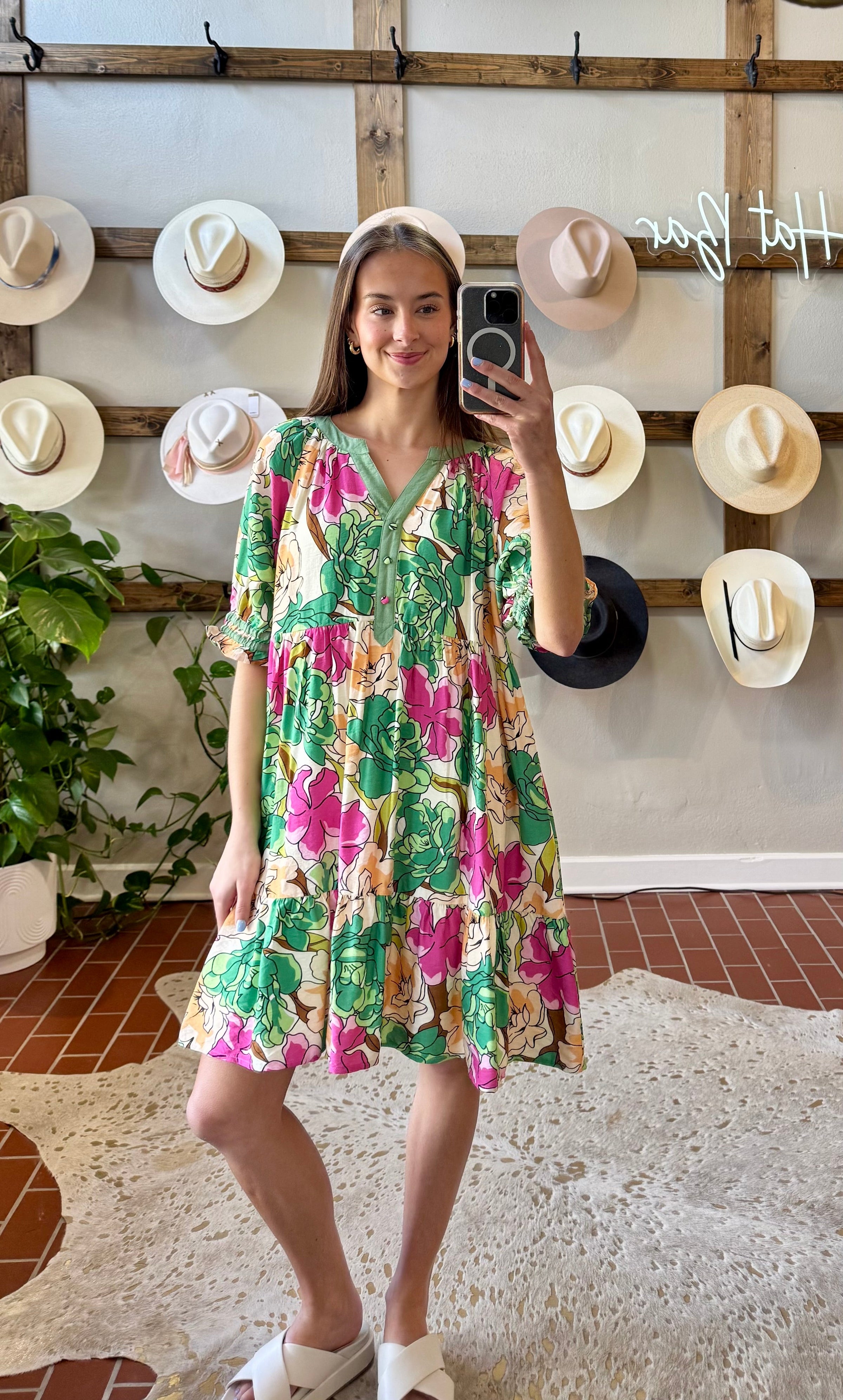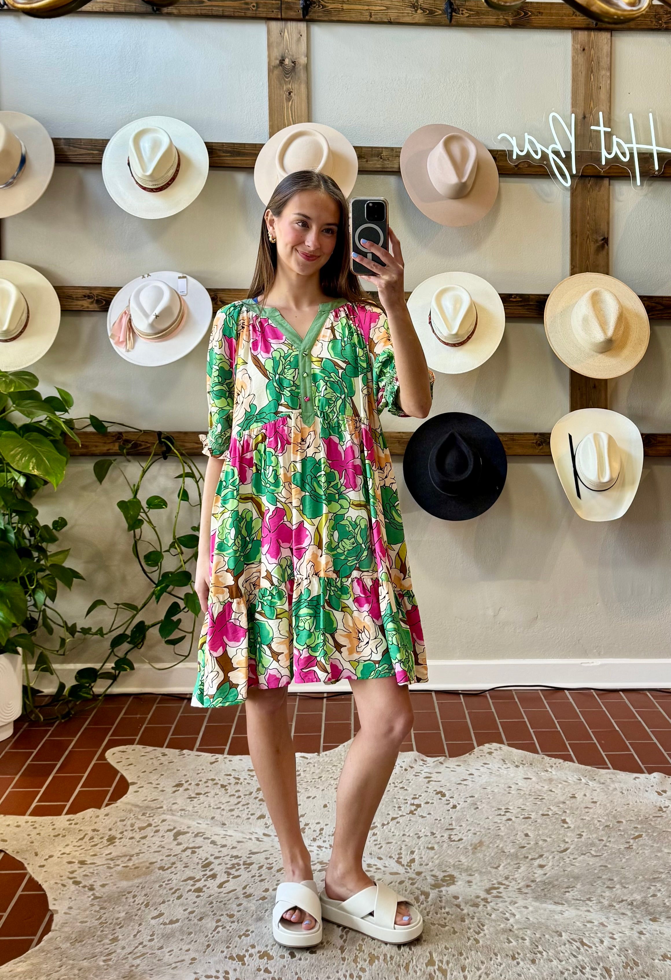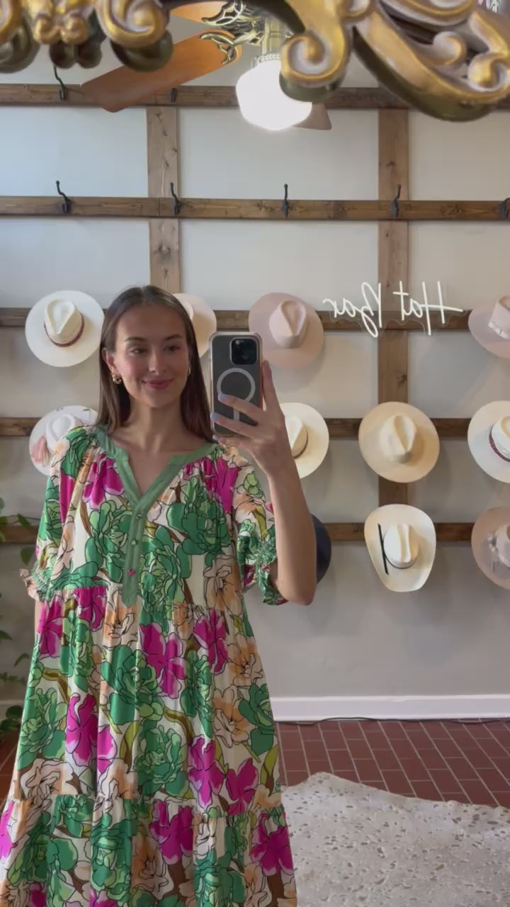 Harlie Floral Dress features a charming henley neckline with solid contrast detailing that frames the face beautifully. The babydoll silhouette with tiered layers creates effortless movement and flattering dimension, while functional side pockets add everyday practicality. Lined construction ensures comfort and confidence. Rendered in a stunning green and pink floral print, this piece transitions seamlessly from casual outings to weekend gatherings—a versatile staple that feels both polished and relaxed.