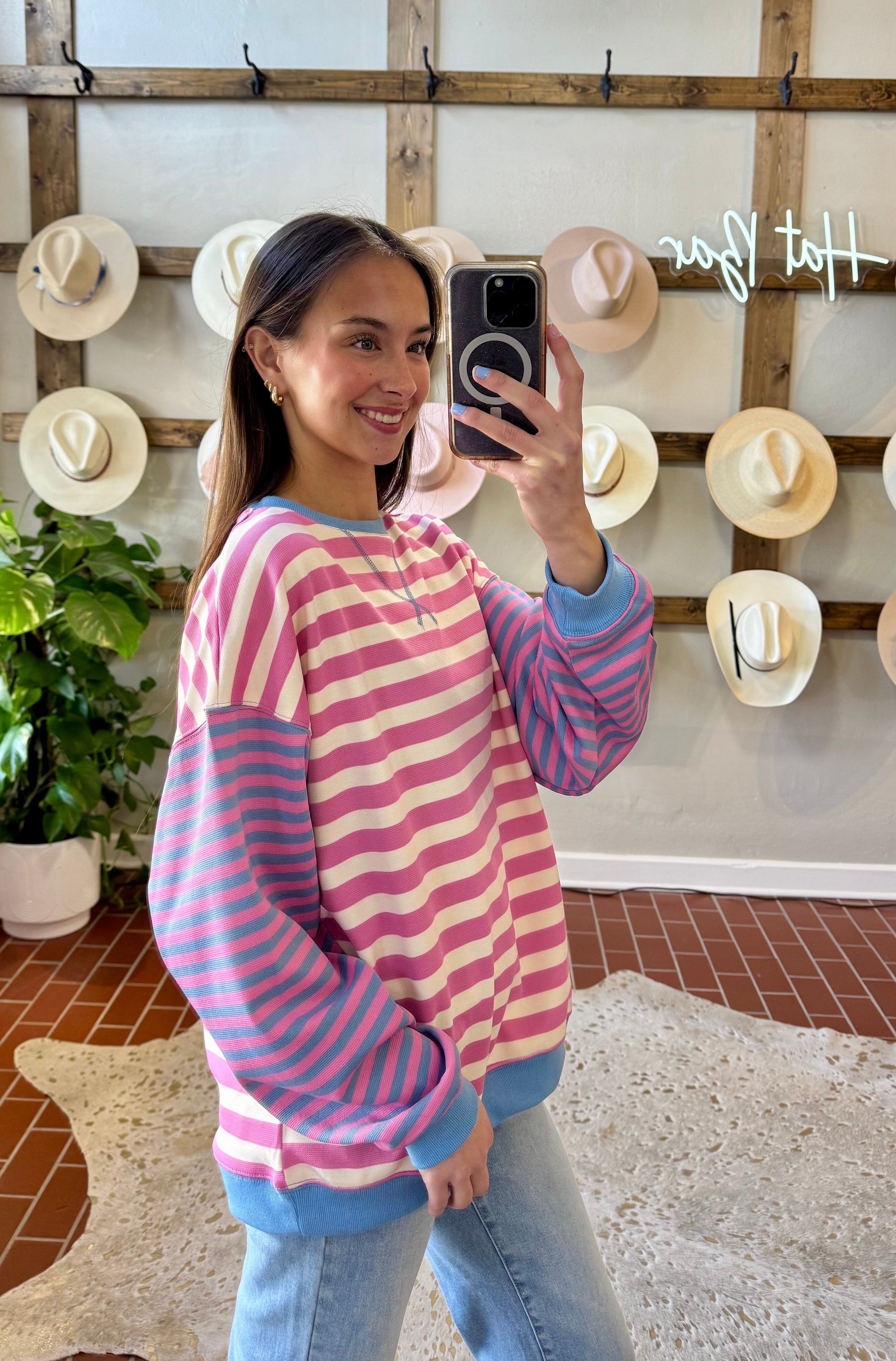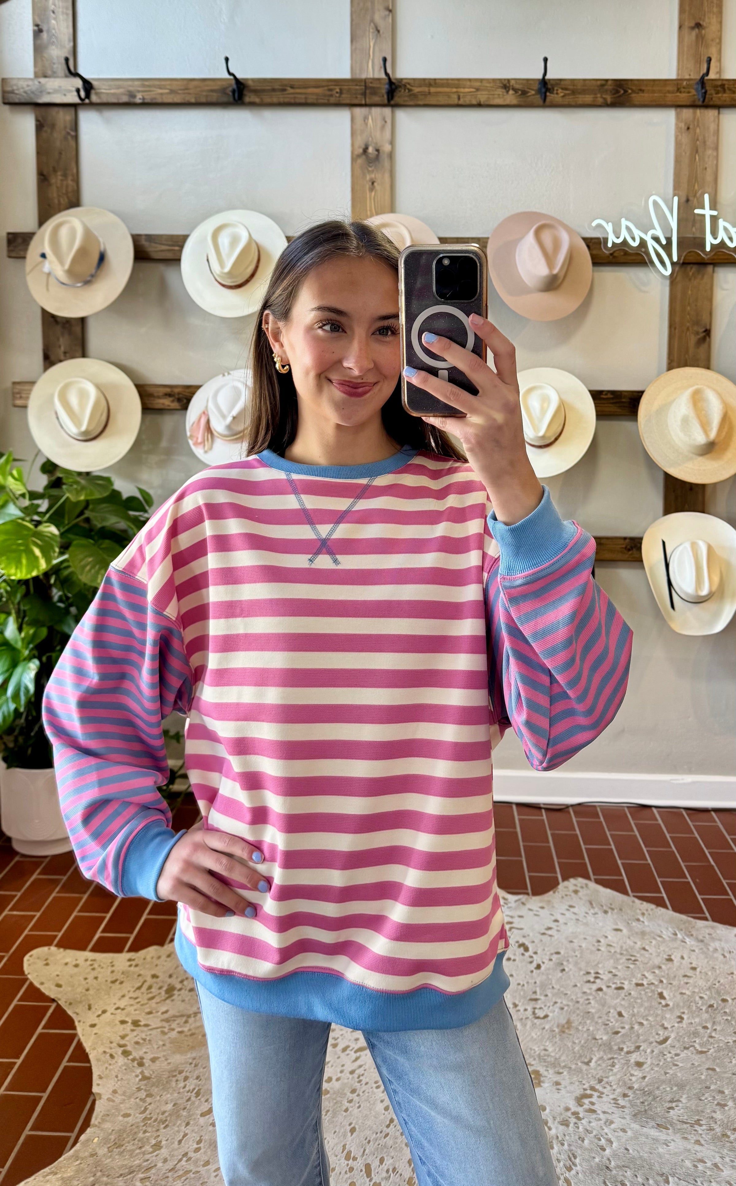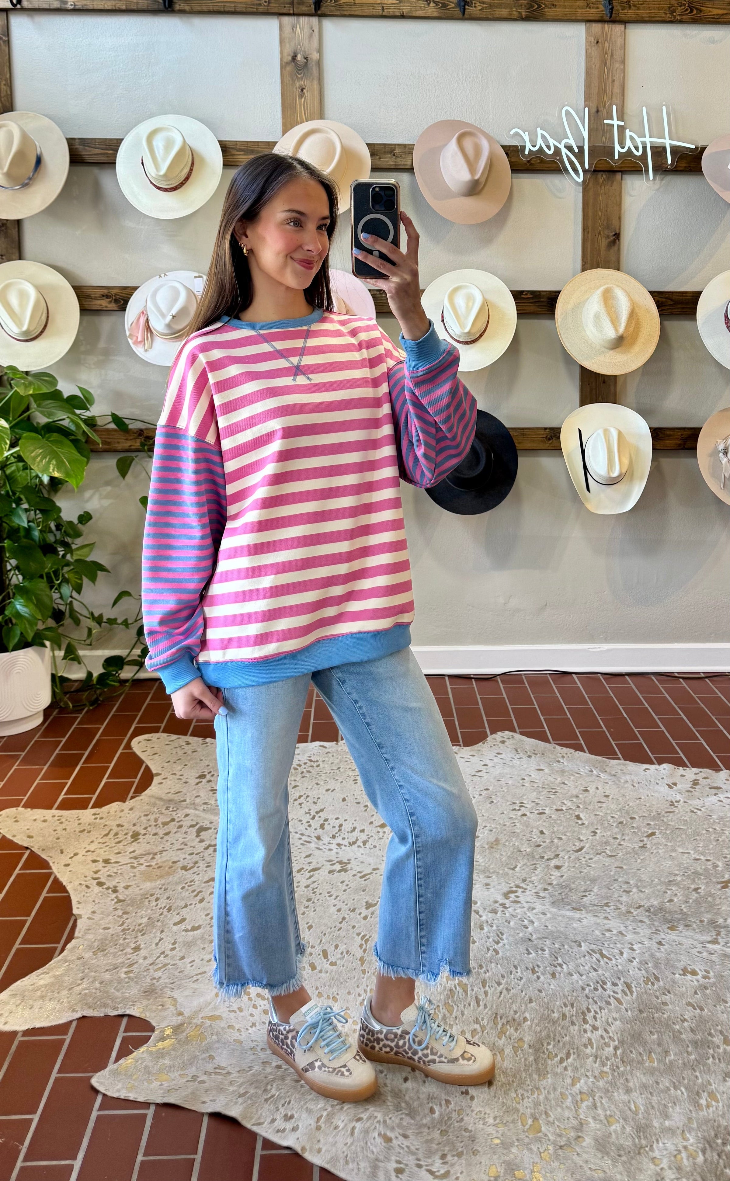 Layer this versatile striped sweatshirt into your year-round rotation. Soft, comfortable fabric pairs effortlessly with jeans, skirts, or loungewear, while the charming color palette—from warm neutrals to playful pastels—complements any season. Perfect for casual days, weekend outings, or cozy evenings at home. A wardrobe essential that works as hard as you do.