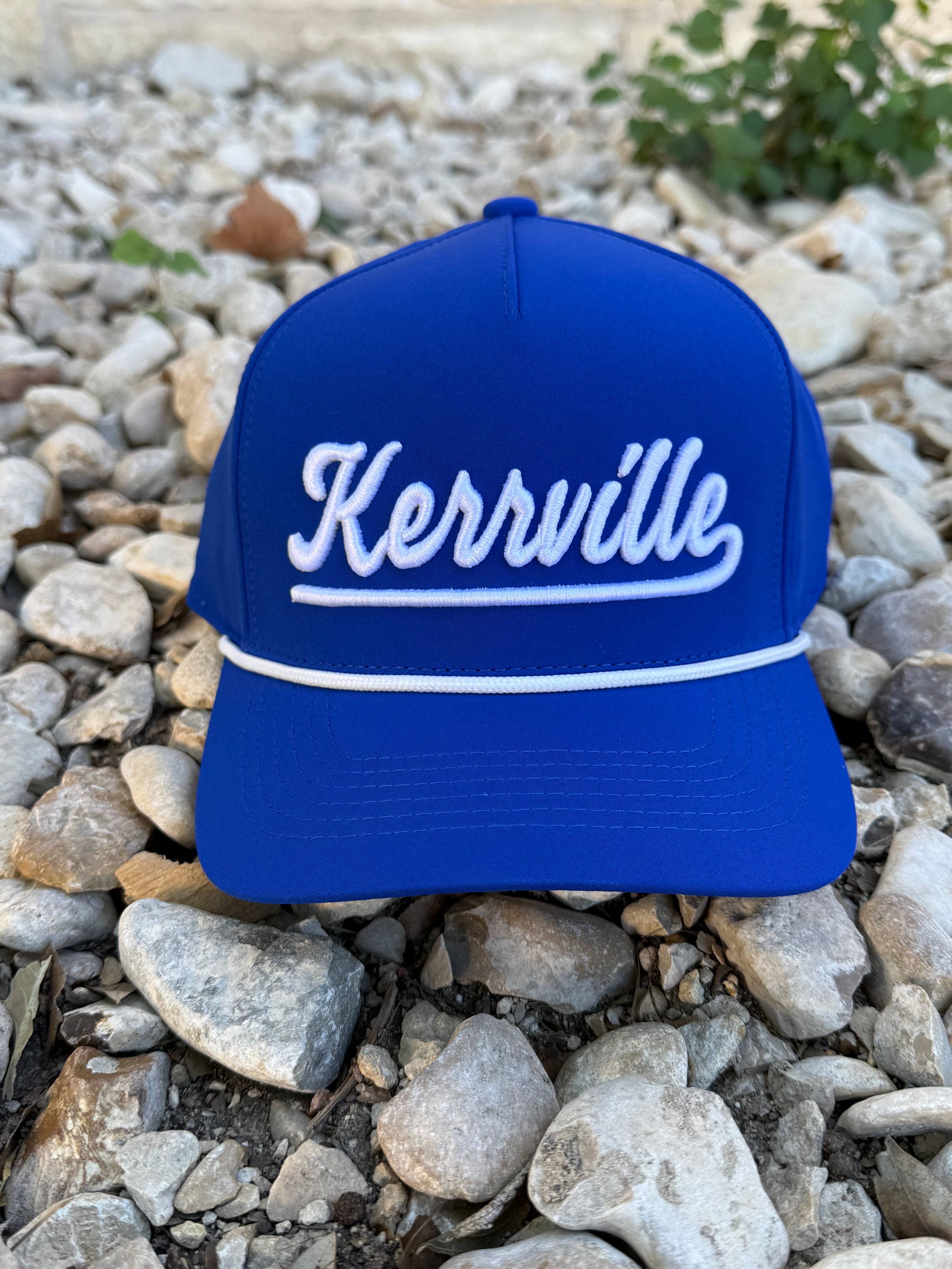 The Kerrville Royal Blue Hat is a great quality hat perfect for outdoor activities. The snap back design ensures a secure fit, while the royal blue color with white puff print and rope detail adds a touch of style. Stay comfortable and stylish with this hat.