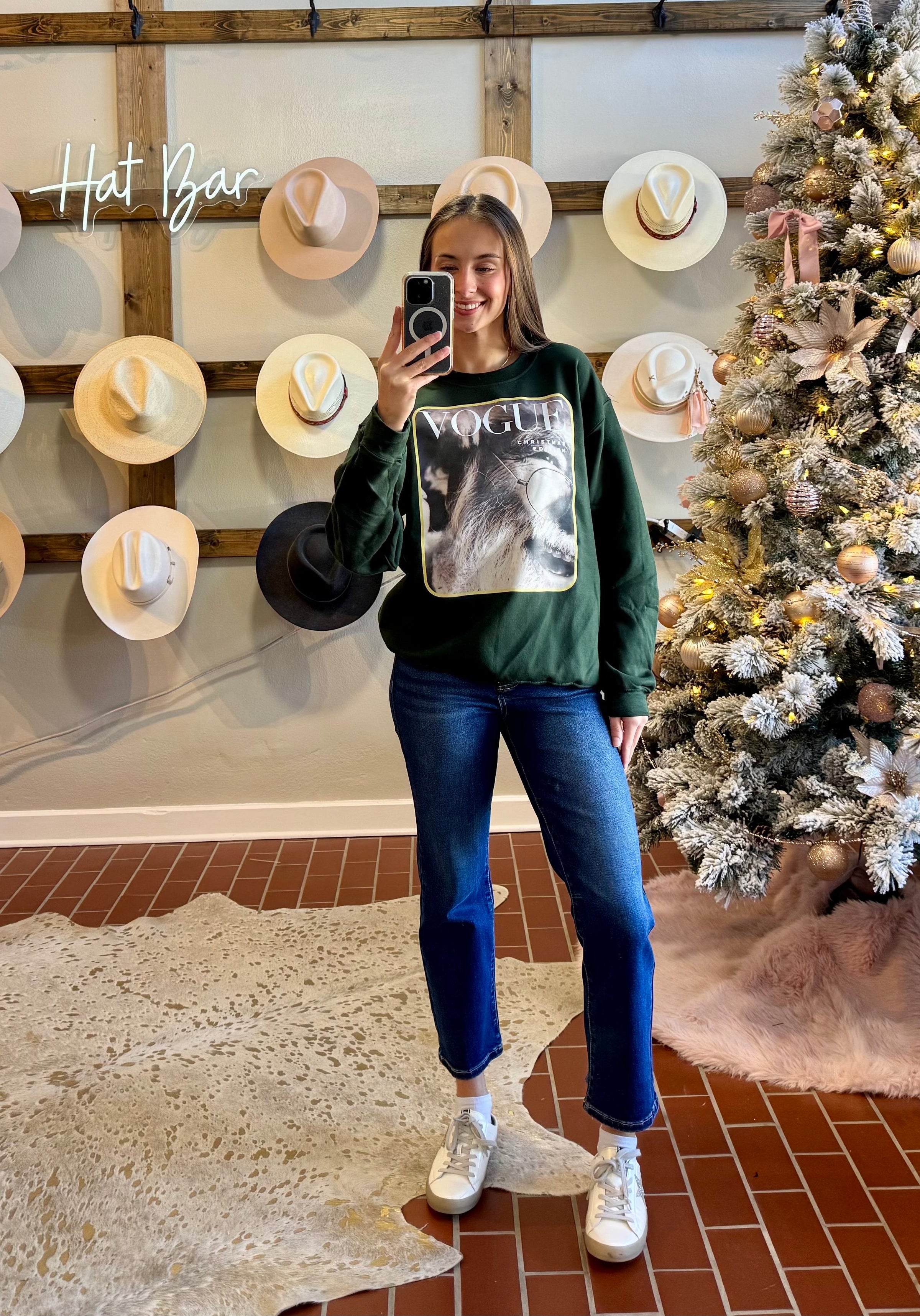 Get ready to turn heads this holiday season with our Vogue Santa Sweatshirt! This eye-catching piece features a bold Santa design printed on a luxurious hunter green sweatshirt with golden accents. Style it casually with your favorite denim and sneakers for an effortless festive vibe, or elevate the look by pairing it with one of our corporate collars and Dear John leather pants for a sophisticated holiday statement. Whether you're keeping it laid-back or dressing it up, this sweatshirt is your go-to piece for spreading holiday cheer with personality and flair.