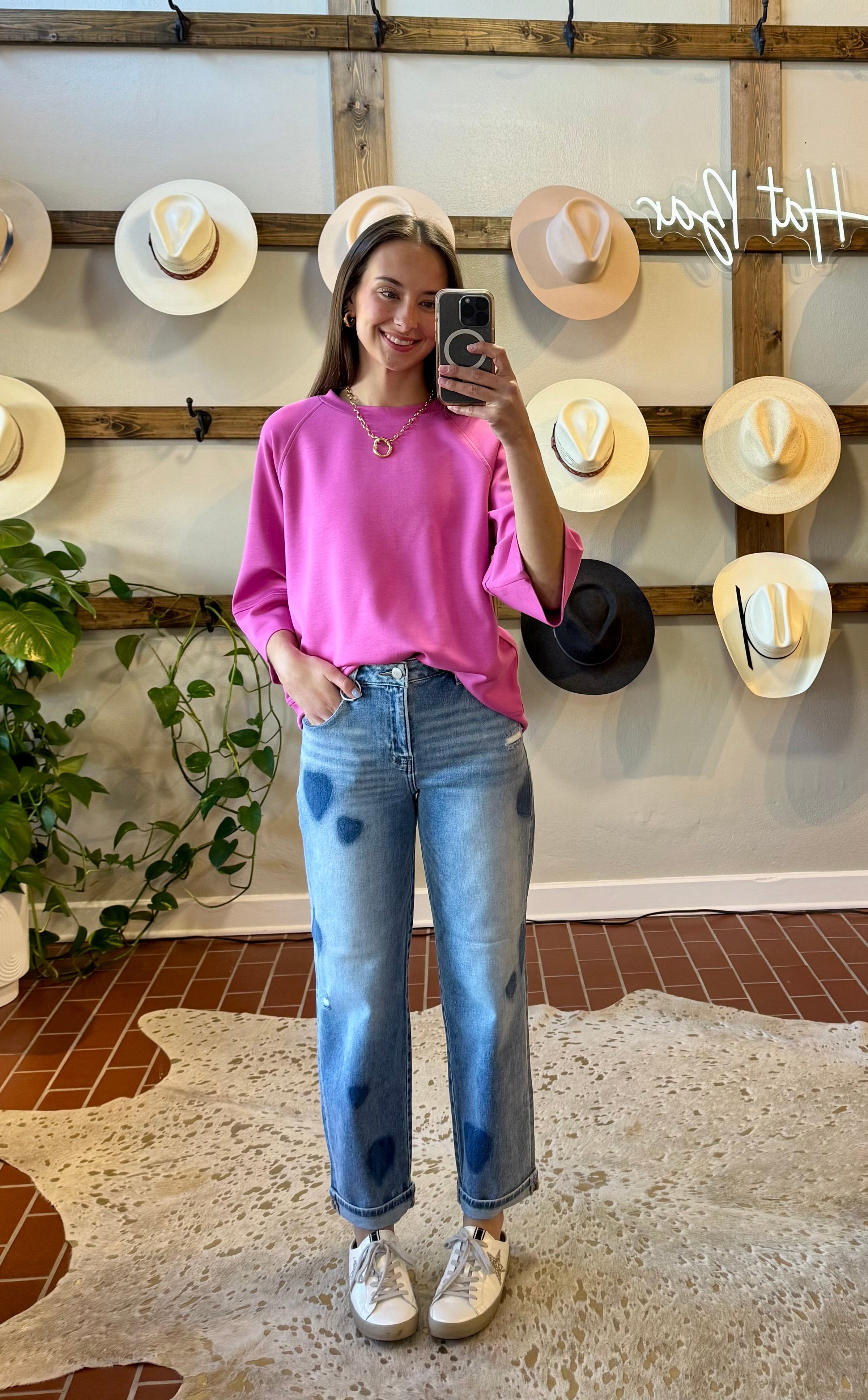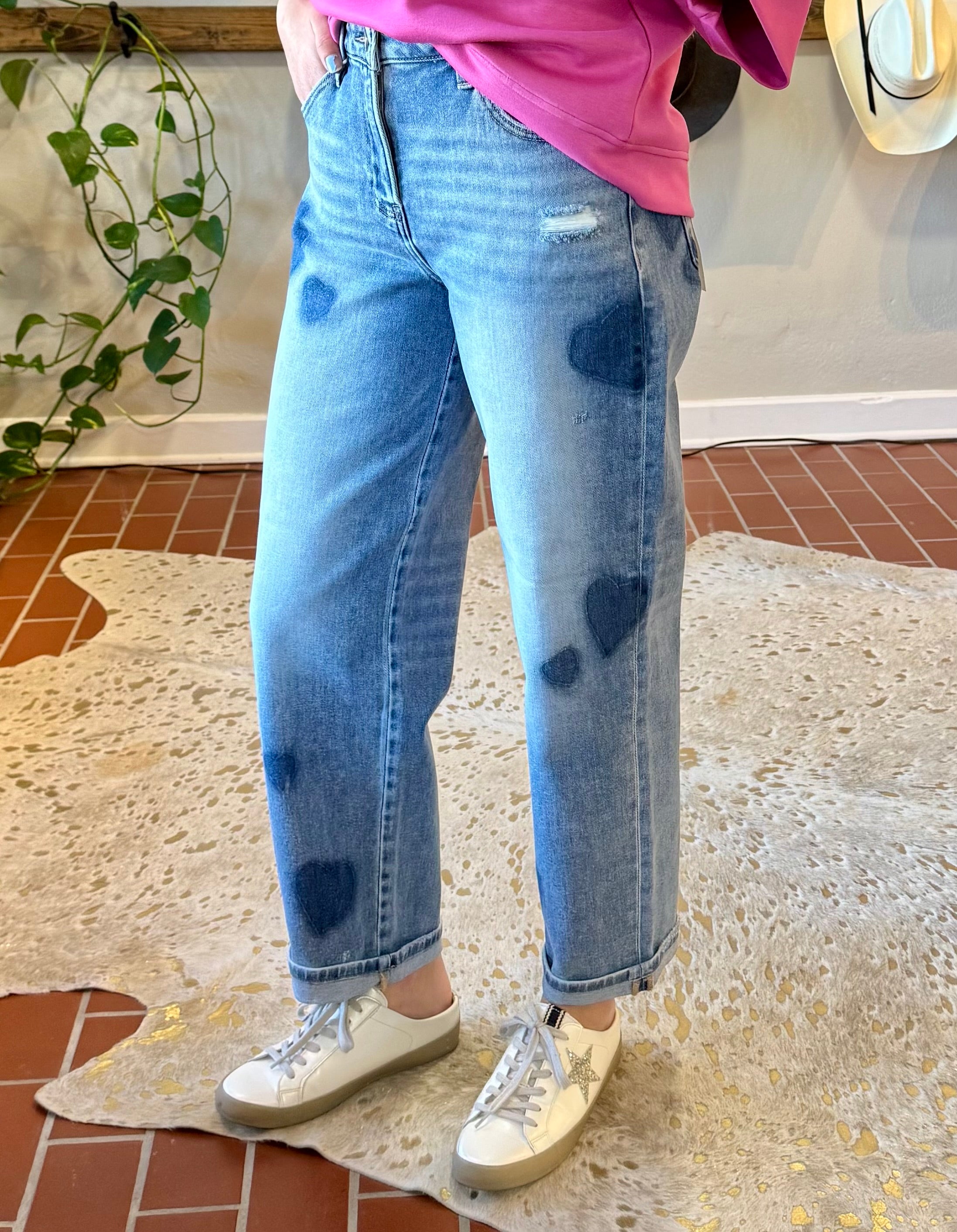 Risen Heartbreaker Boyfriend Jeans bring playful charm to your warm-weather wardrobe. Adorned with heart-shaped patches throughout, these denim staples deliver the perfect blend of comfort and style. The generous stretch fabric moves with you, while the slouchy silhouette flatters every frame. Wear them true to size for a relaxed fit or size down for an extra-baggy vibe—either way, you'll love how effortlessly cool they feel. Perfect for spring and summer adventures.