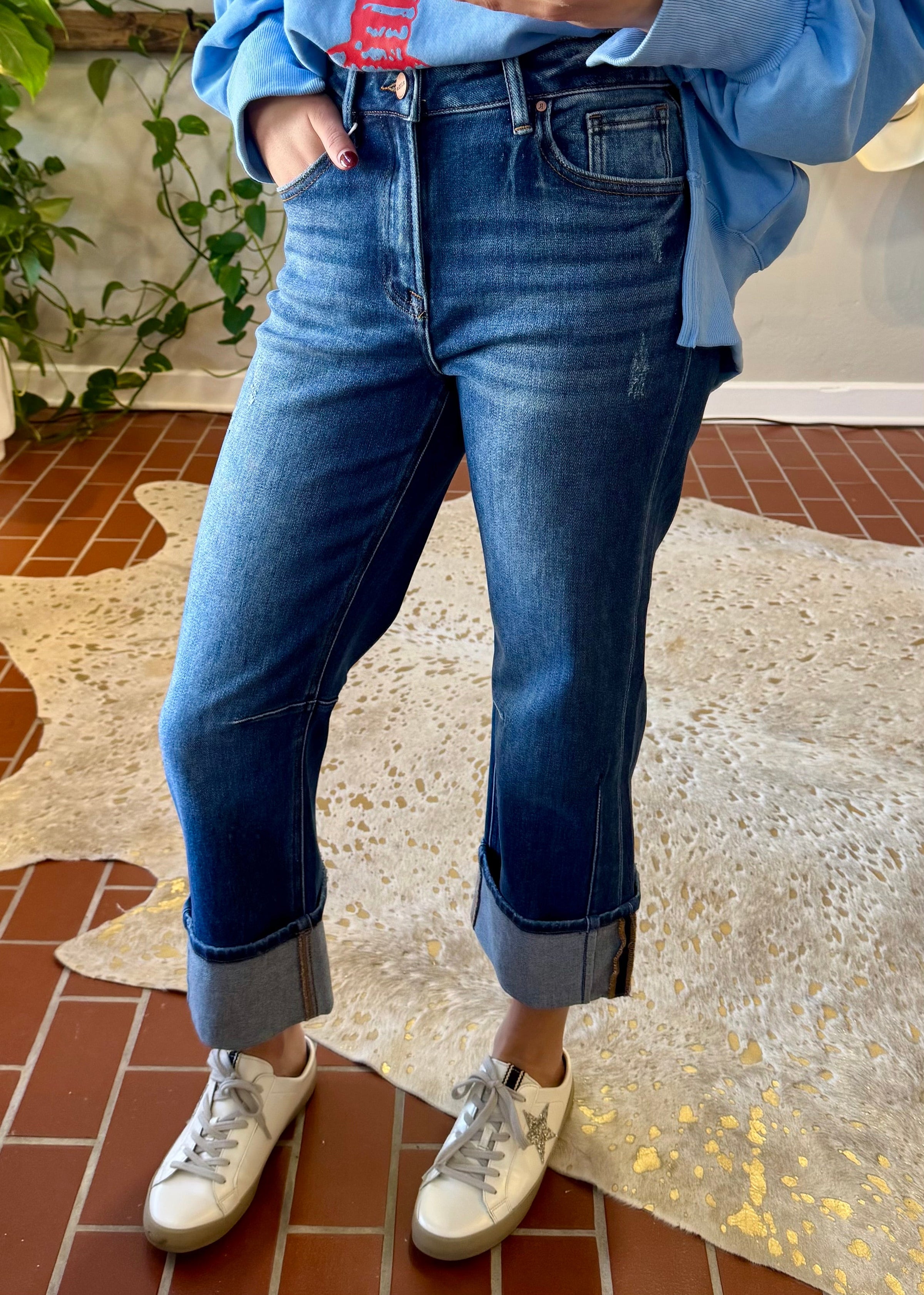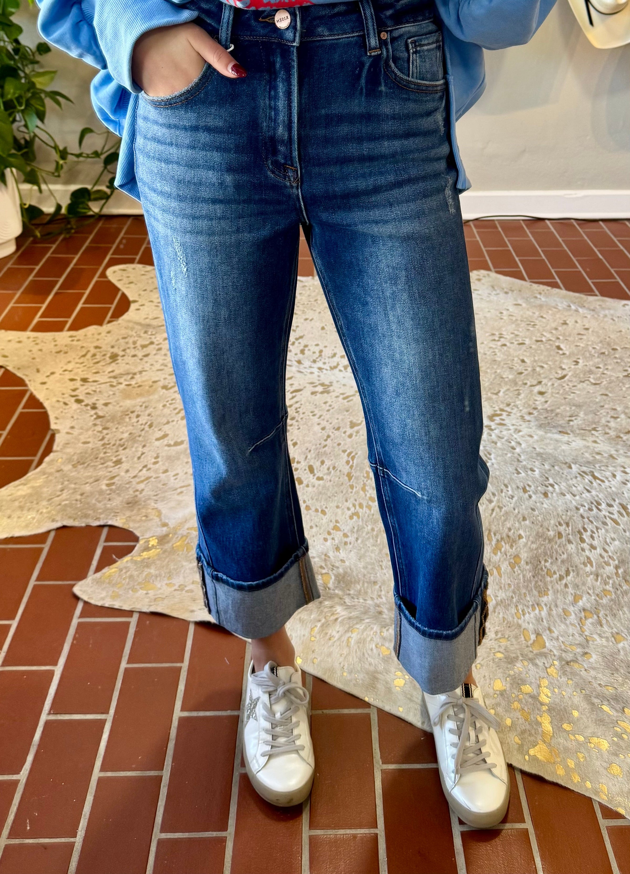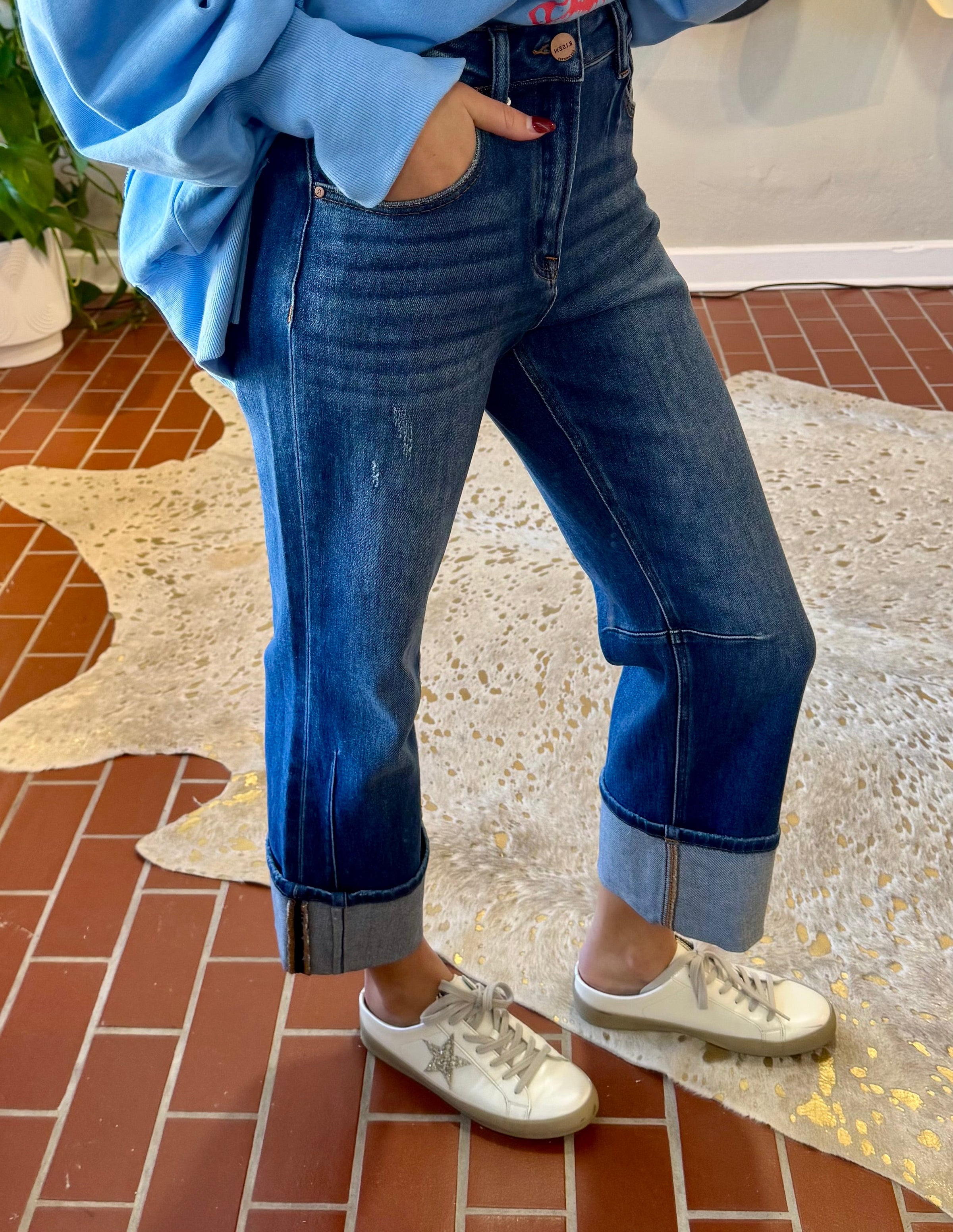 Discover versatile style with Risen Mercy High Rise Strait Jeans, featuring an innovative releasable cuff that transforms your look in seconds. The 10½" rise flatters and elongates, while a strategic knee dart adds contemporary edge. Distressed detailing and the convertible hem—wear it cropped at 26" or extended to 30½"—make this premium denim essential for any wardrobe. Crafted from a comfortable cotton-blend with stretch, these jeans deliver all-day wearability without compromise.
