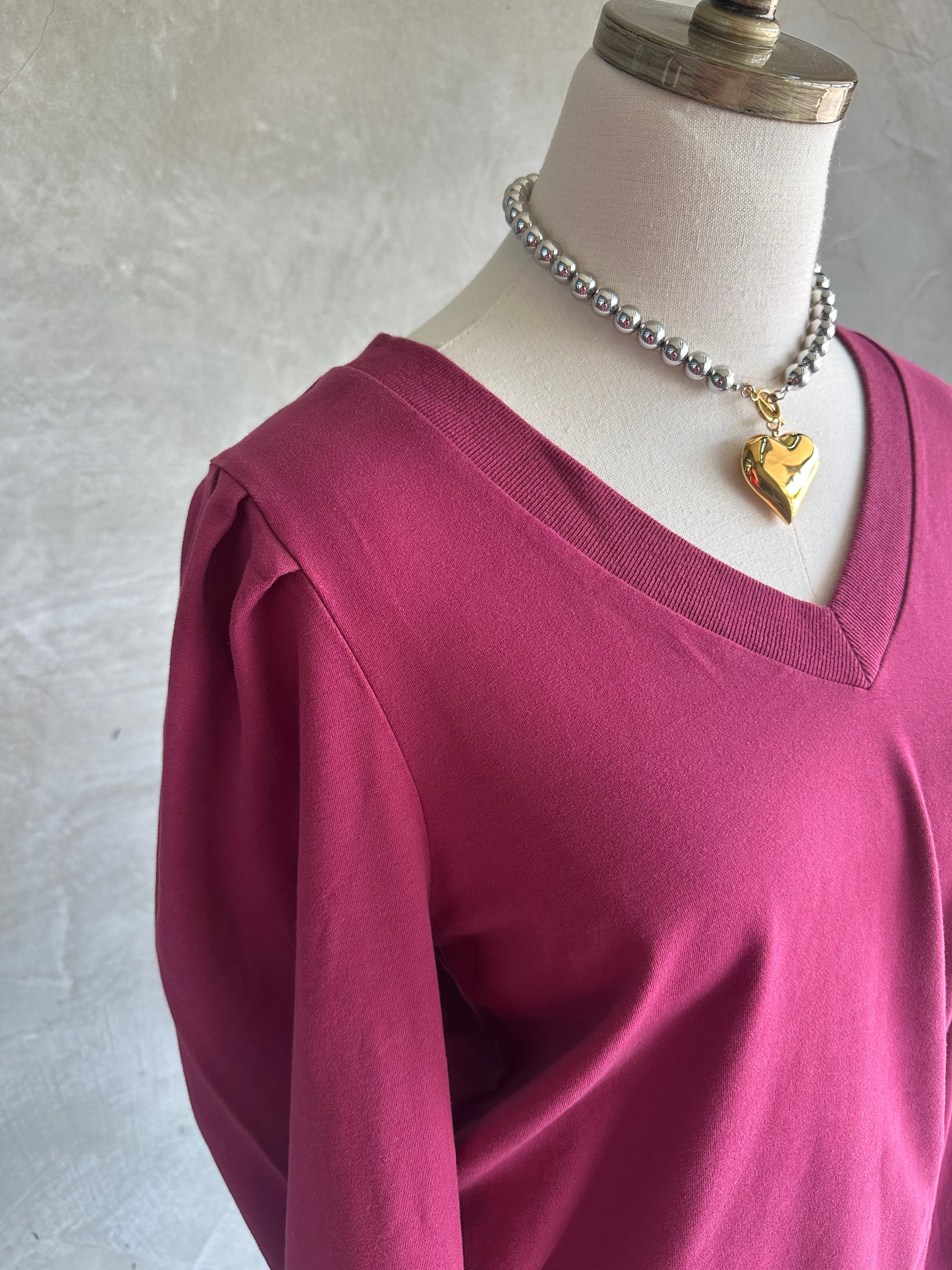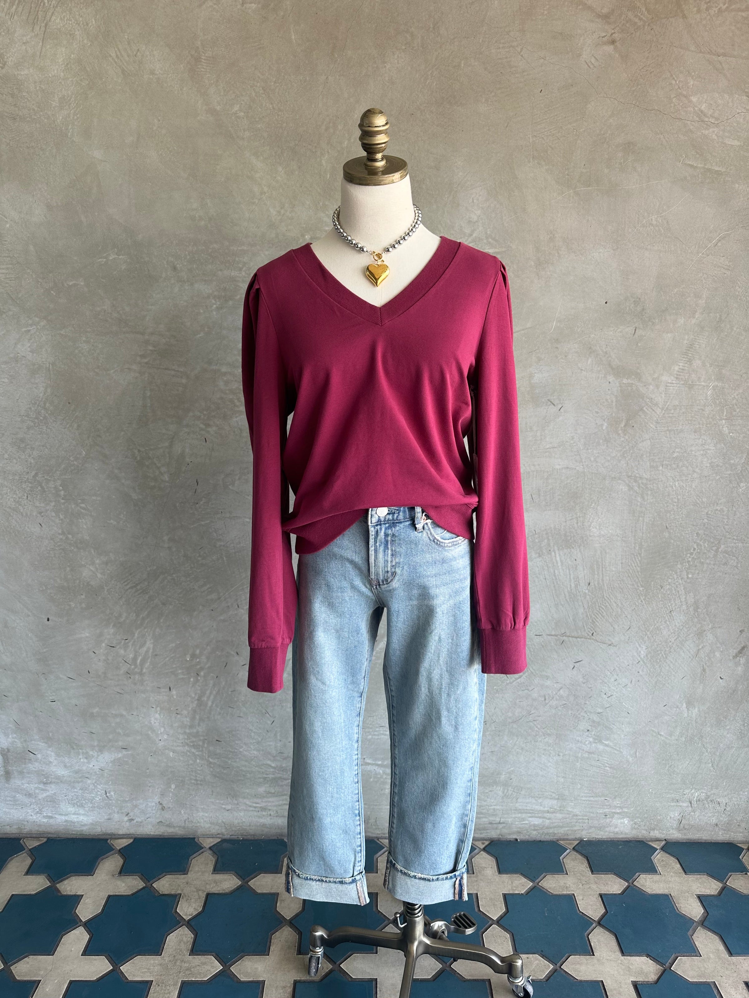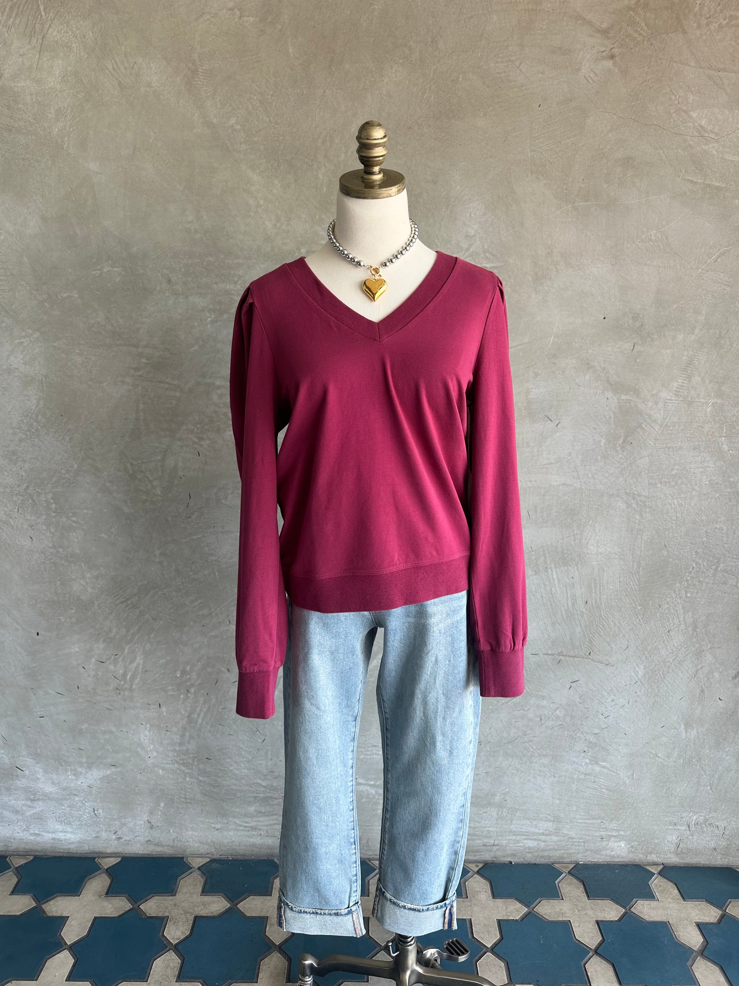 Timeless Sammi v-neck sweatshirt, featuring pleated long sleeve perfectly crafted for unparalleled style. Imbue a chic, elevated touch, ideal for both casual outings and more polished affairs. Its versatile design effortlessly pairs with tailored trousers or your favorite denim for a contemporary yet classic look. Feeling fabulous comes as naturally as looking stunning.