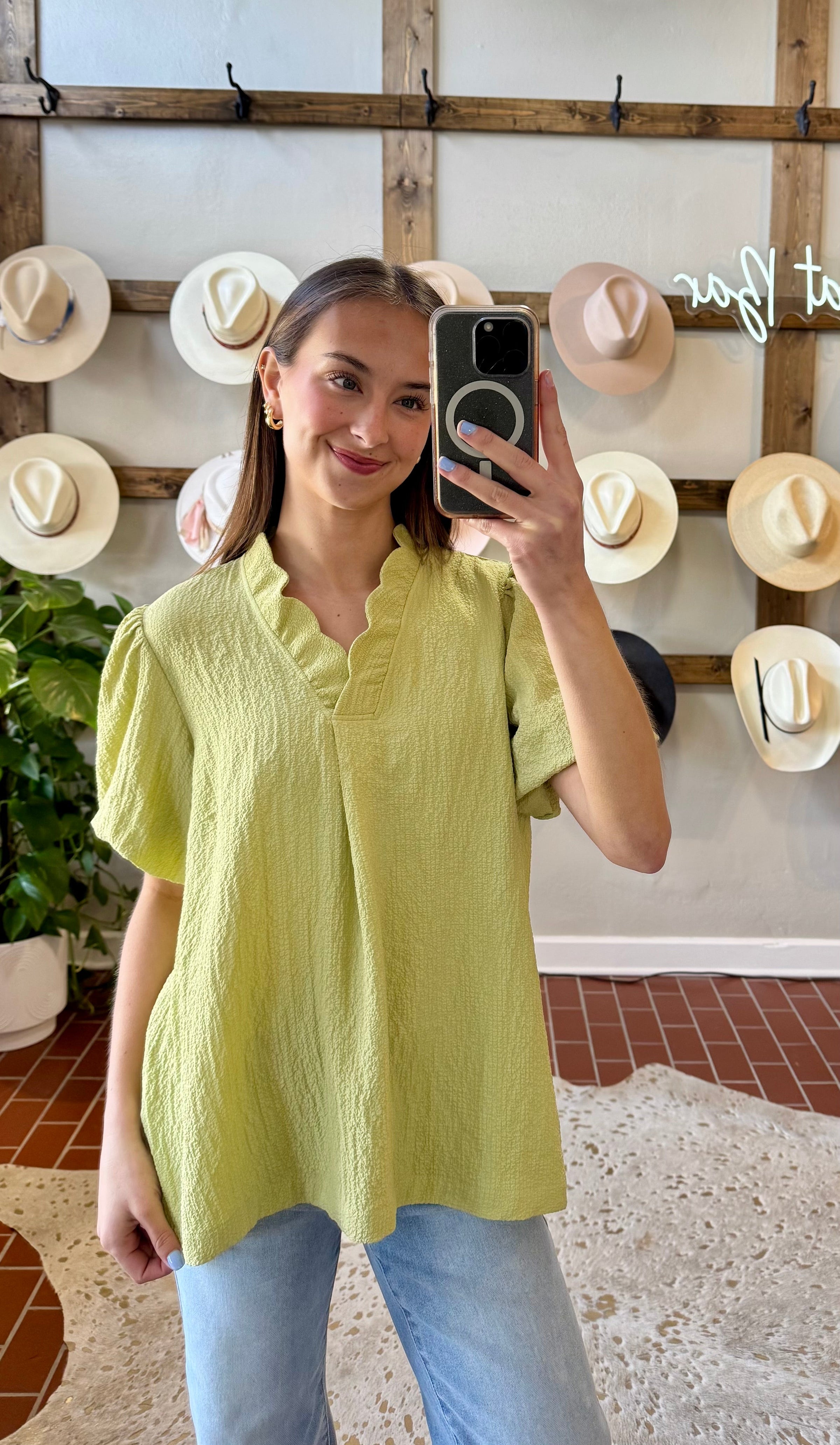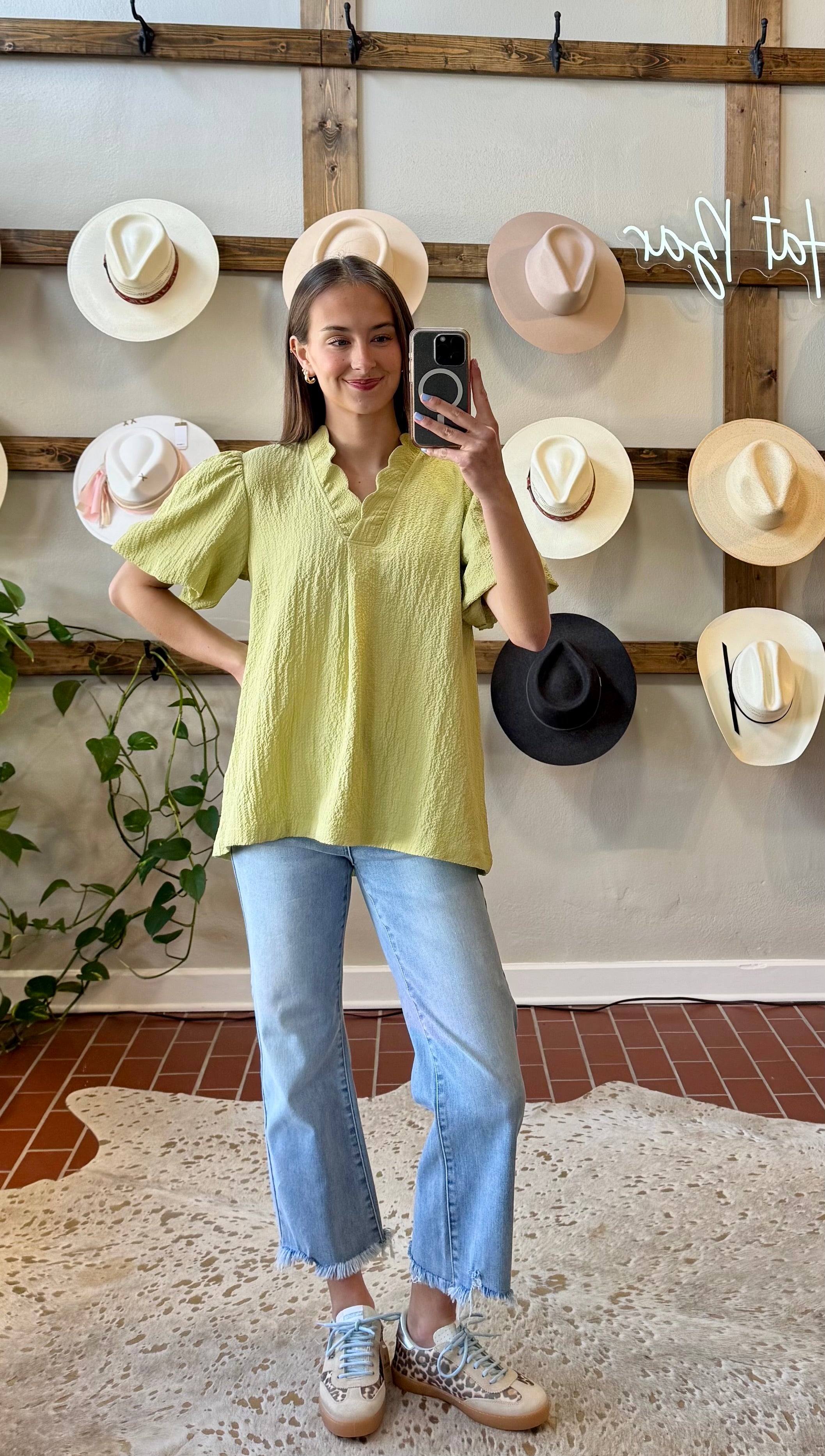 Elevate your warm-weather wardrobe with this striking sage seersucker top. The split V-neckline and delicate puff sleeves create an effortlessly chic silhouette, while subtle pleating adds dimension and movement. A versatile piece that pairs beautifully with white denim for an instantly polished look. Perfect for casual outings or elevated everyday style.