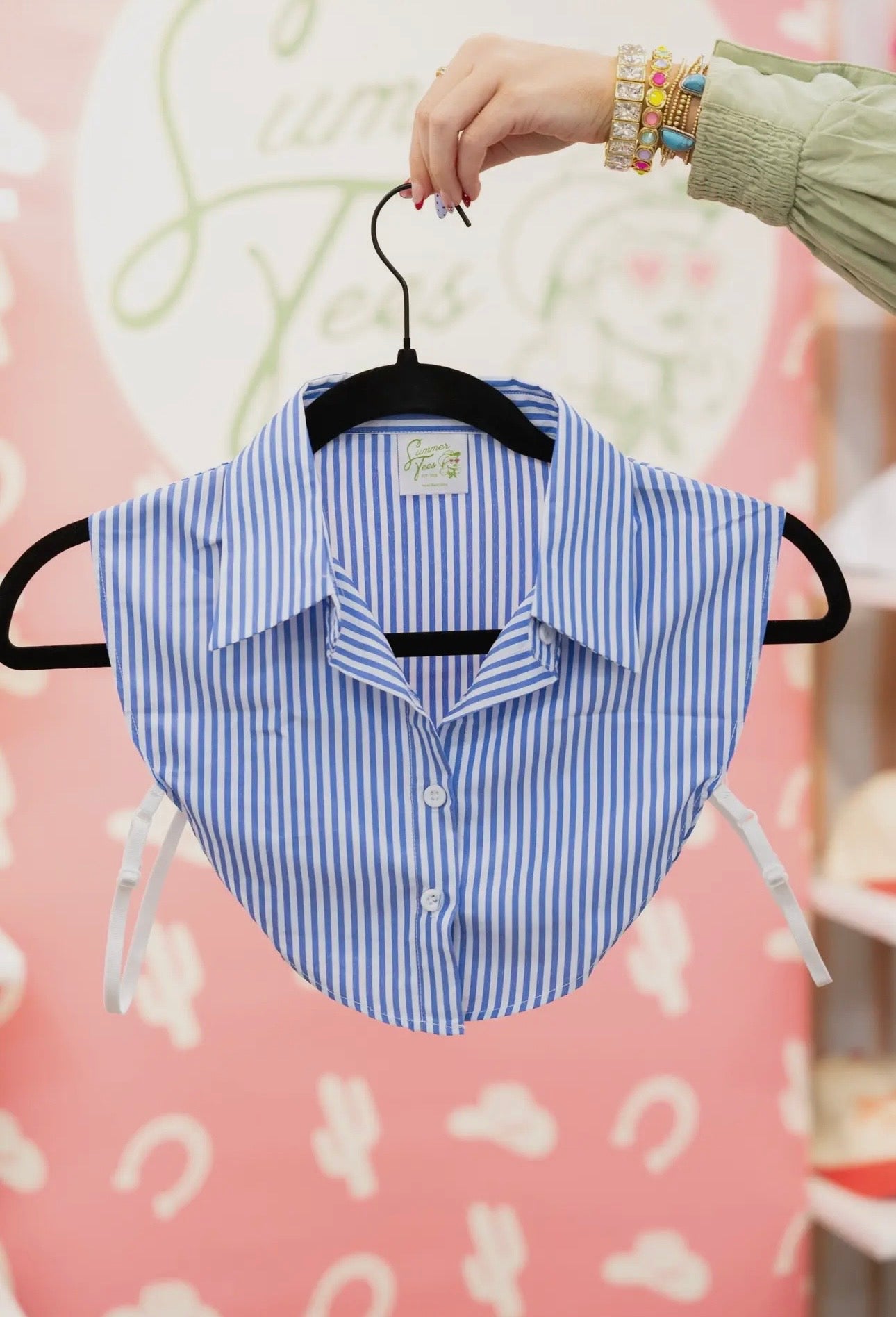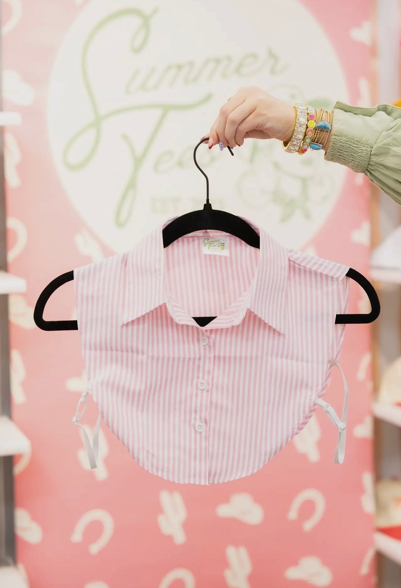 These are perfect going into Spring and Summer. Gives you that dressed up look of having a collard shirt on without all the bulk of the actual collar. Available in Pink and White and Blue and White.