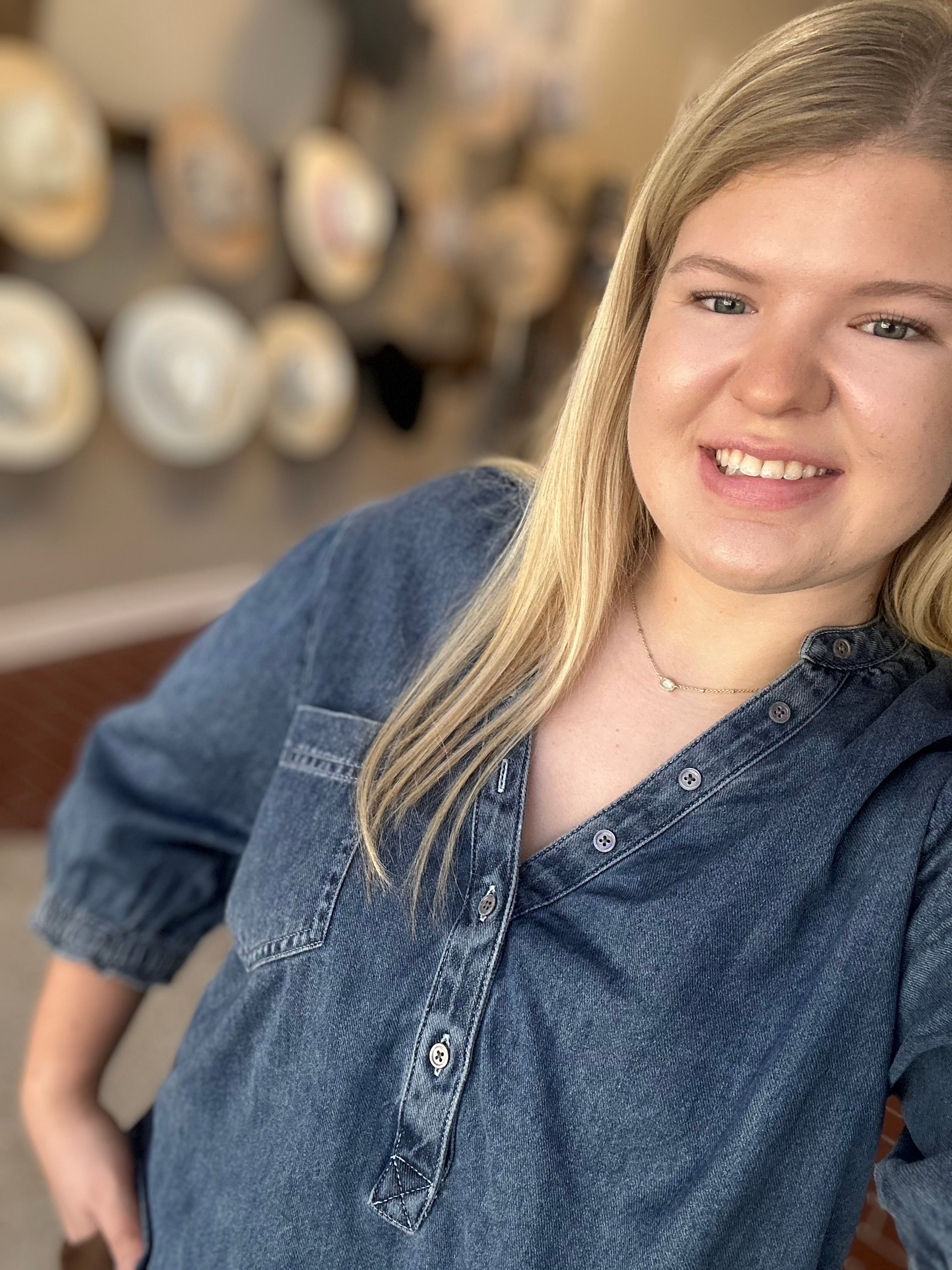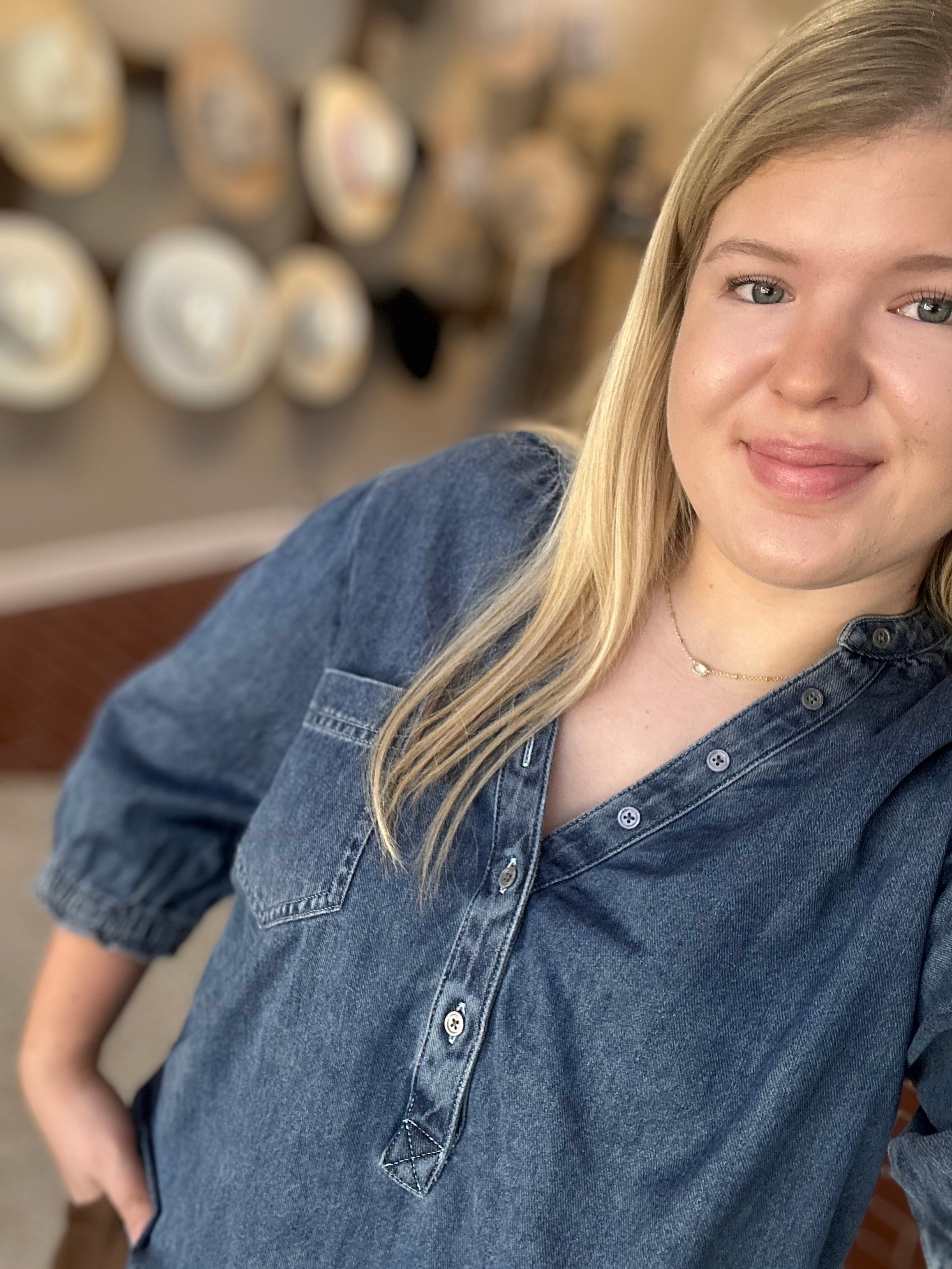 Effortless style meets comfort with this Sidney pop over short sleeve top in medium wash.