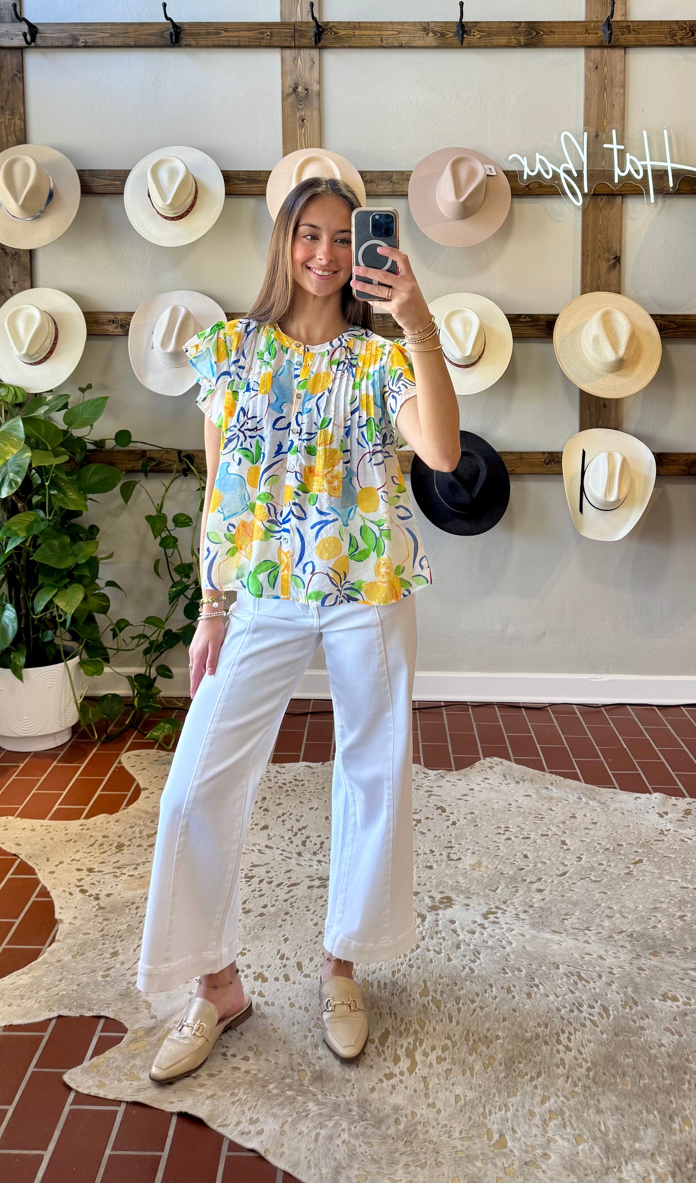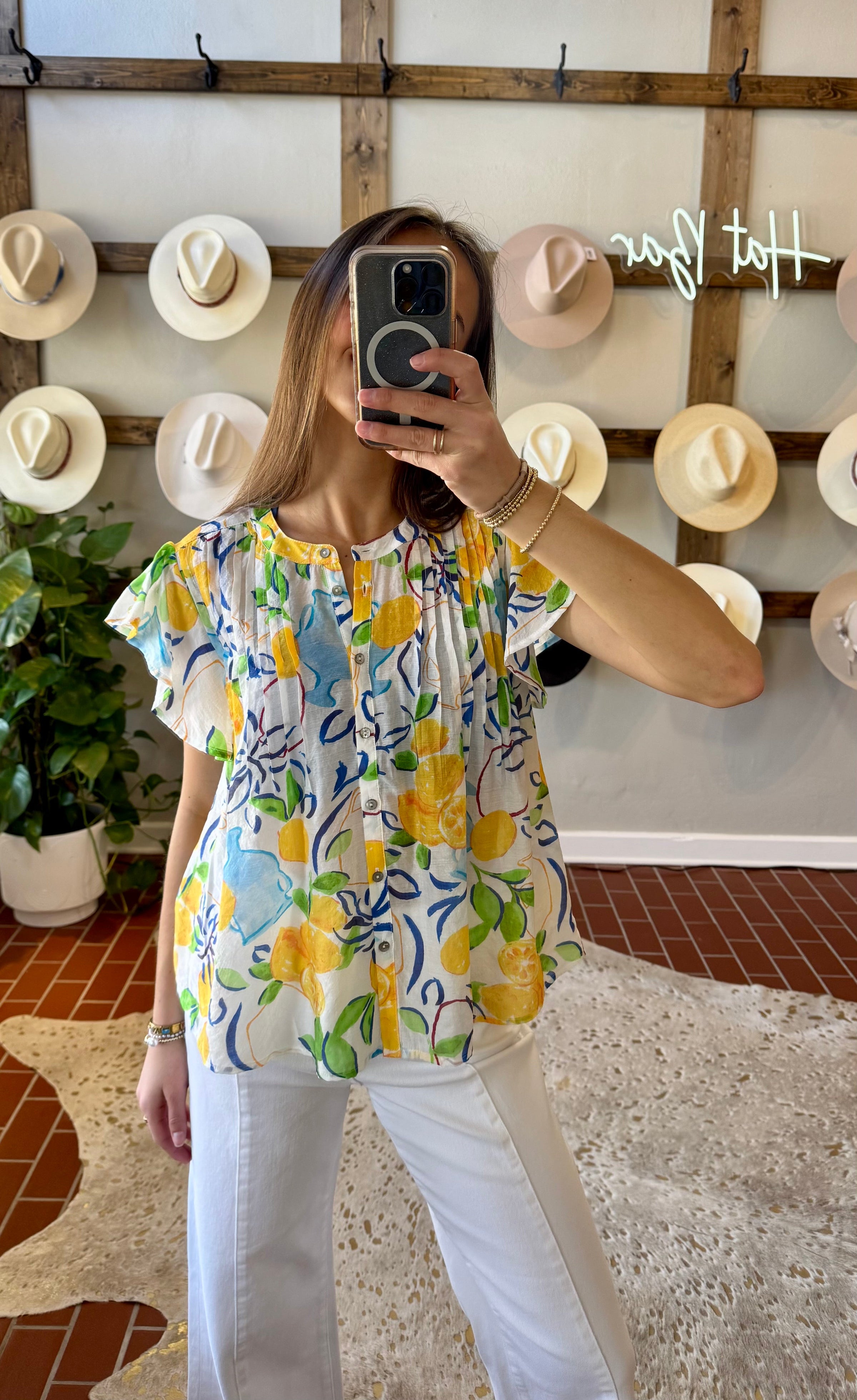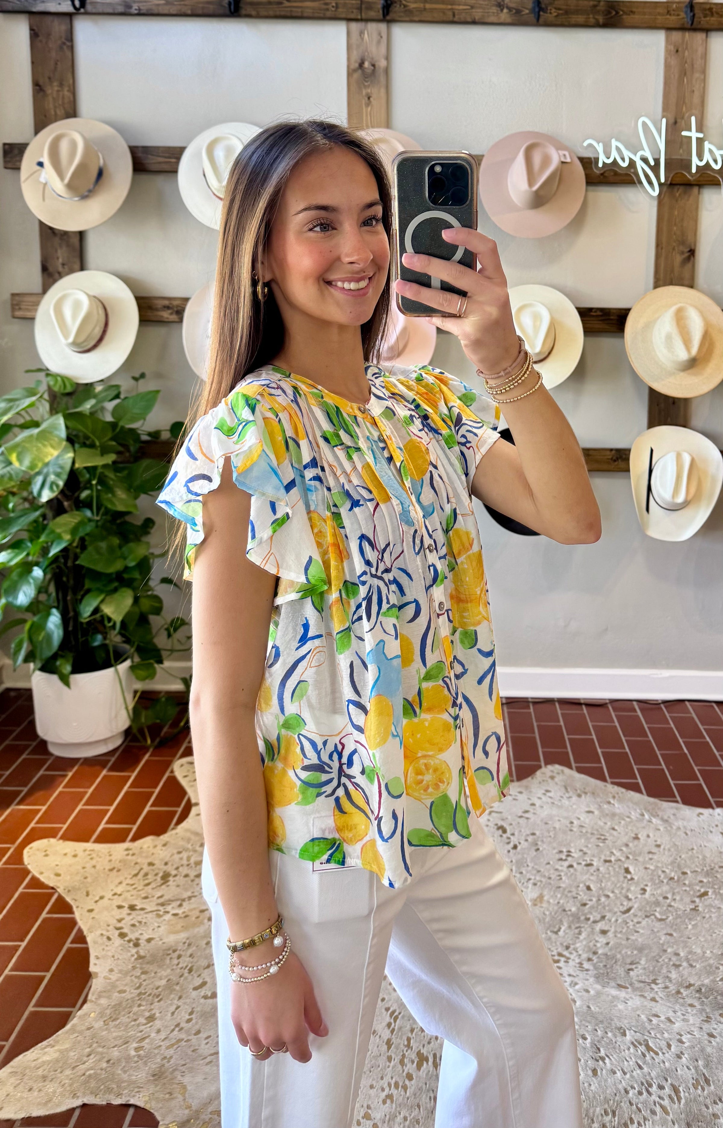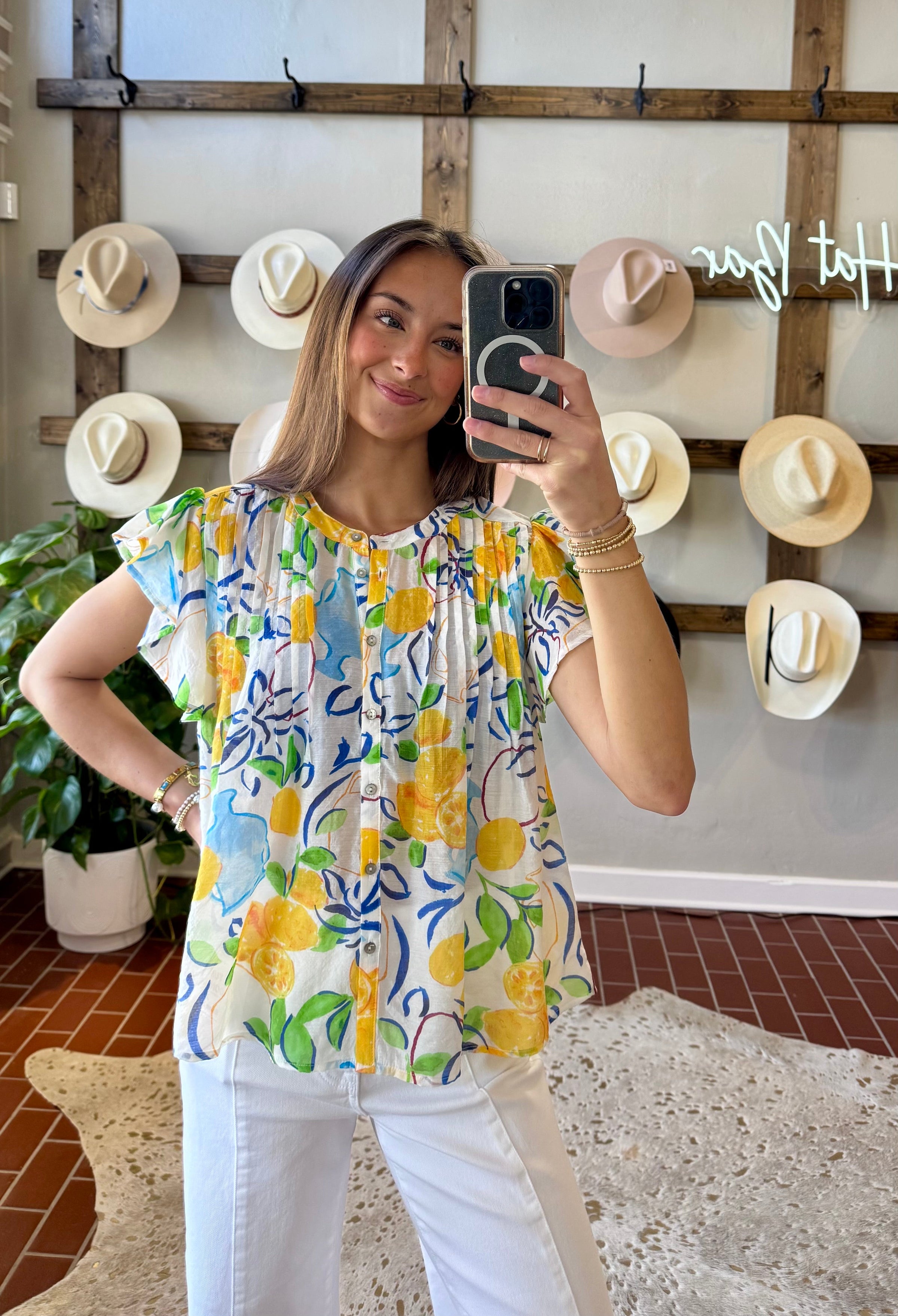 The Lemon Spring Top features a lightweight fabric that promotes breathability, ideal for warm weather. The lemon print design adds a vibrant aesthetic, while the flutter sleeves enhance comfort and mobility. This combination makes it suitable for casual outings or relaxed gatherings during Spring and Summer.
