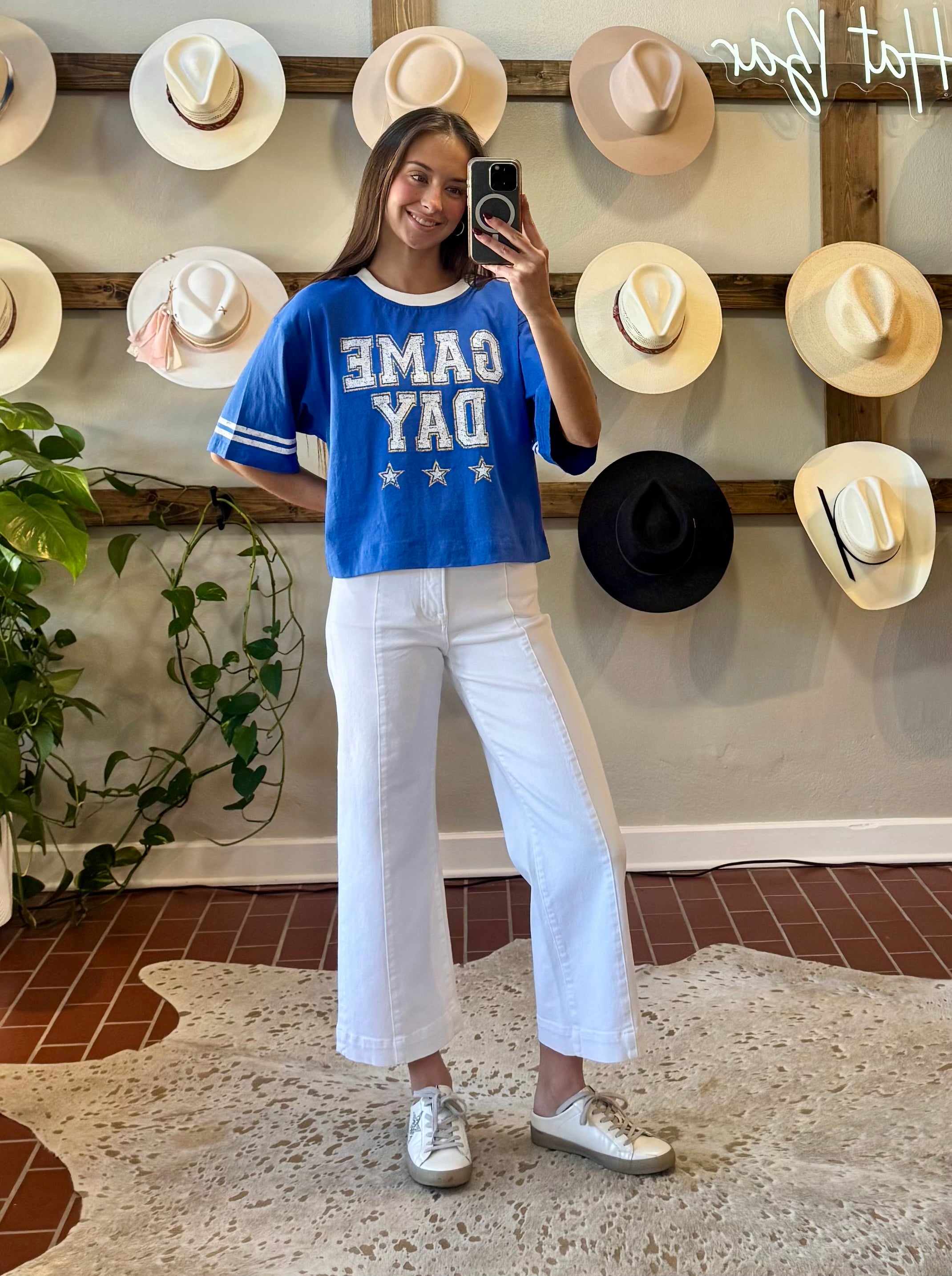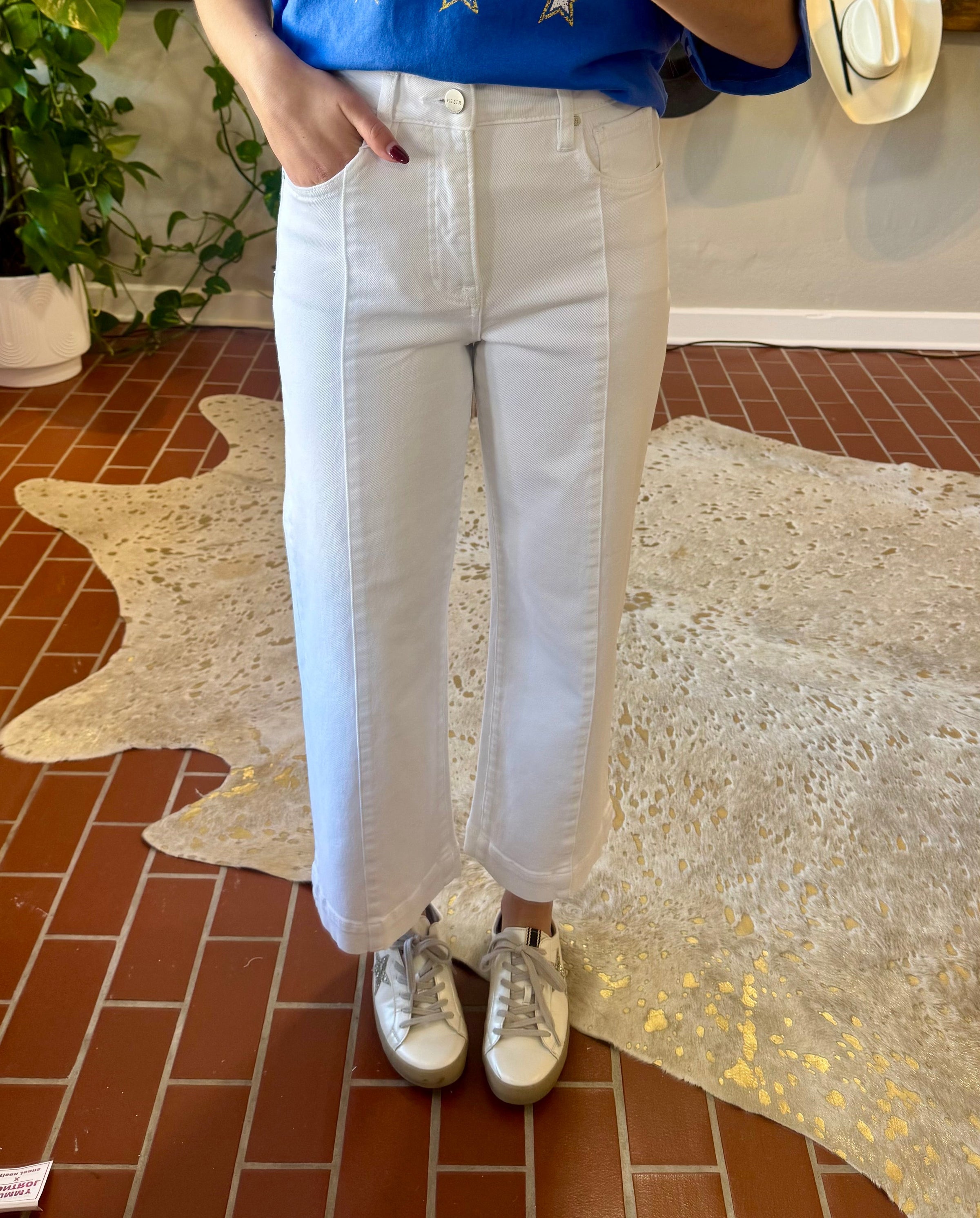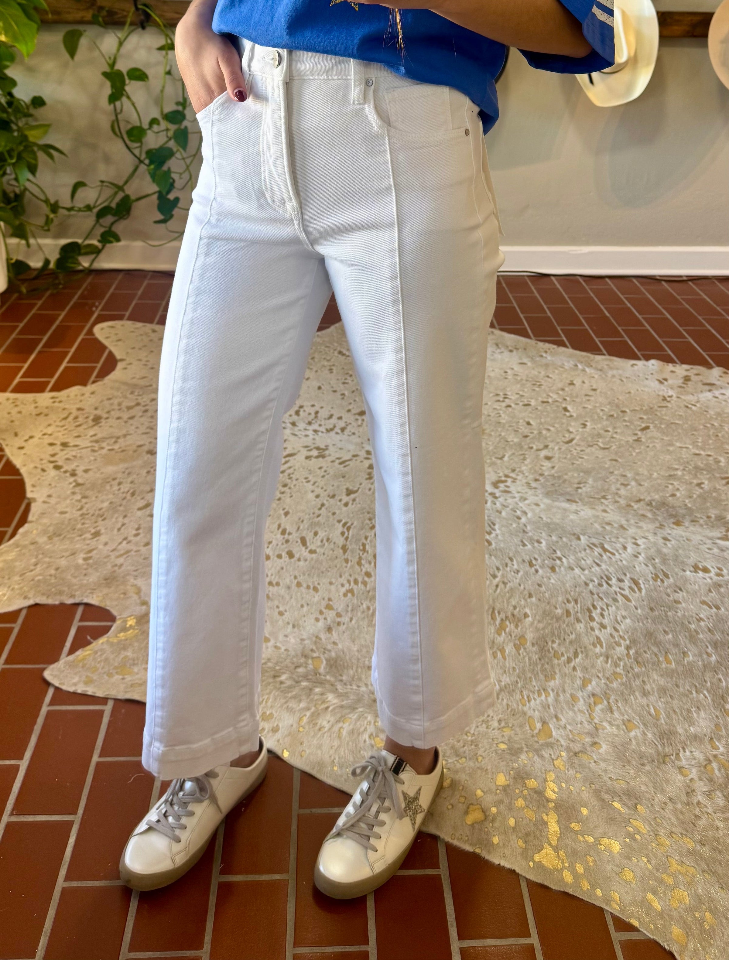 Embrace the season in these crisp white cropped wide-leg jeans—a versatile essential that transitions effortlessly from weekend casual to office-ready. The high rise silhouette flatters and elongates, while the releasable cuff adds modern styling flexibility. Crafted from a breathable cotton-spandex blend, these jeans offer comfort and subtle stretch for all-day wear. Perfect for pairing with sneakers, heels, or loafers, they're the spring refresh your wardrobe has been waiting for.