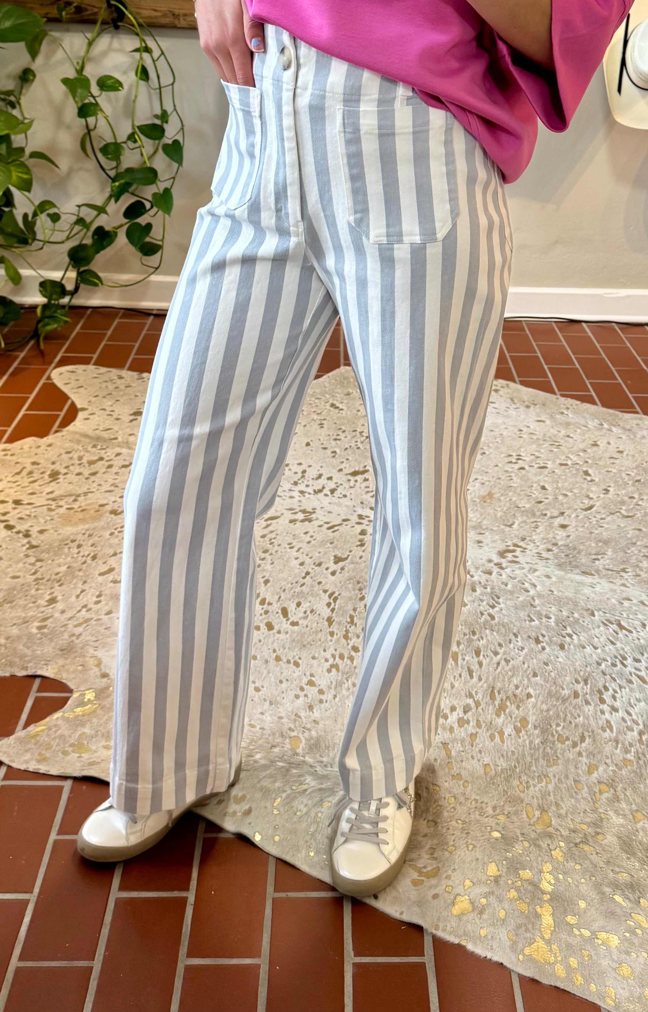 High-rise striped pants designed for a polished, lengthening silhouette. The structured straight leg pairs seamlessly with any top, while functional details—button and zipper closure, belt loops, and front and back patch pockets—deliver everyday practicality. A timeless wardrobe essential that transitions effortlessly from casual to refined.