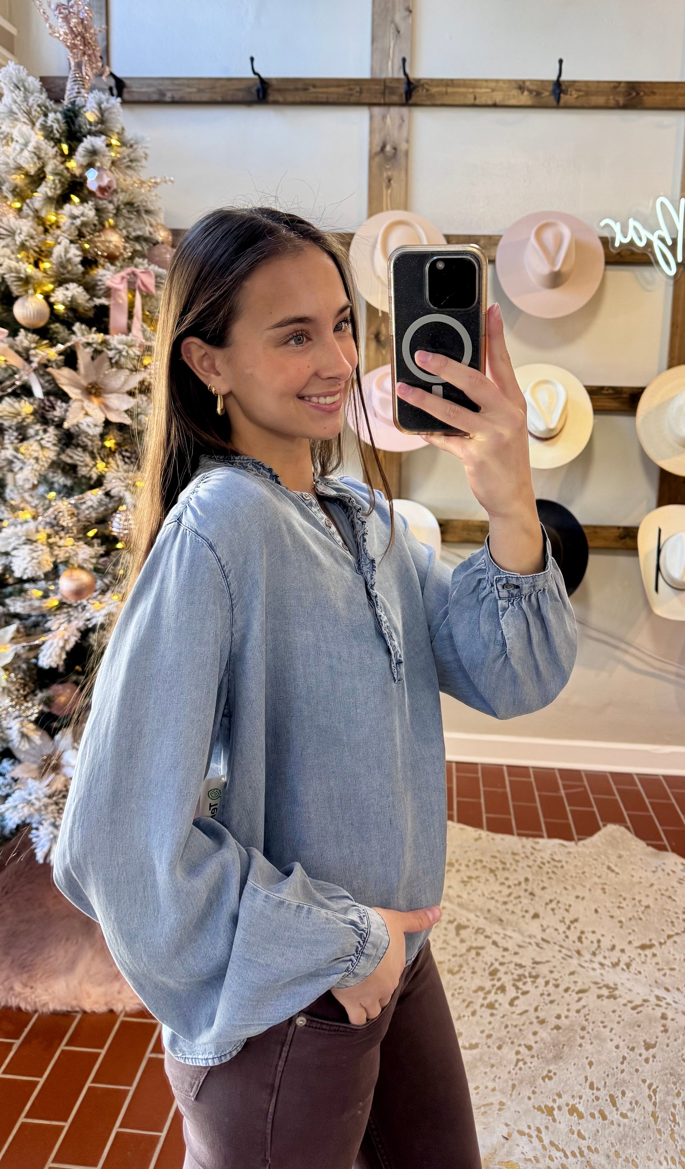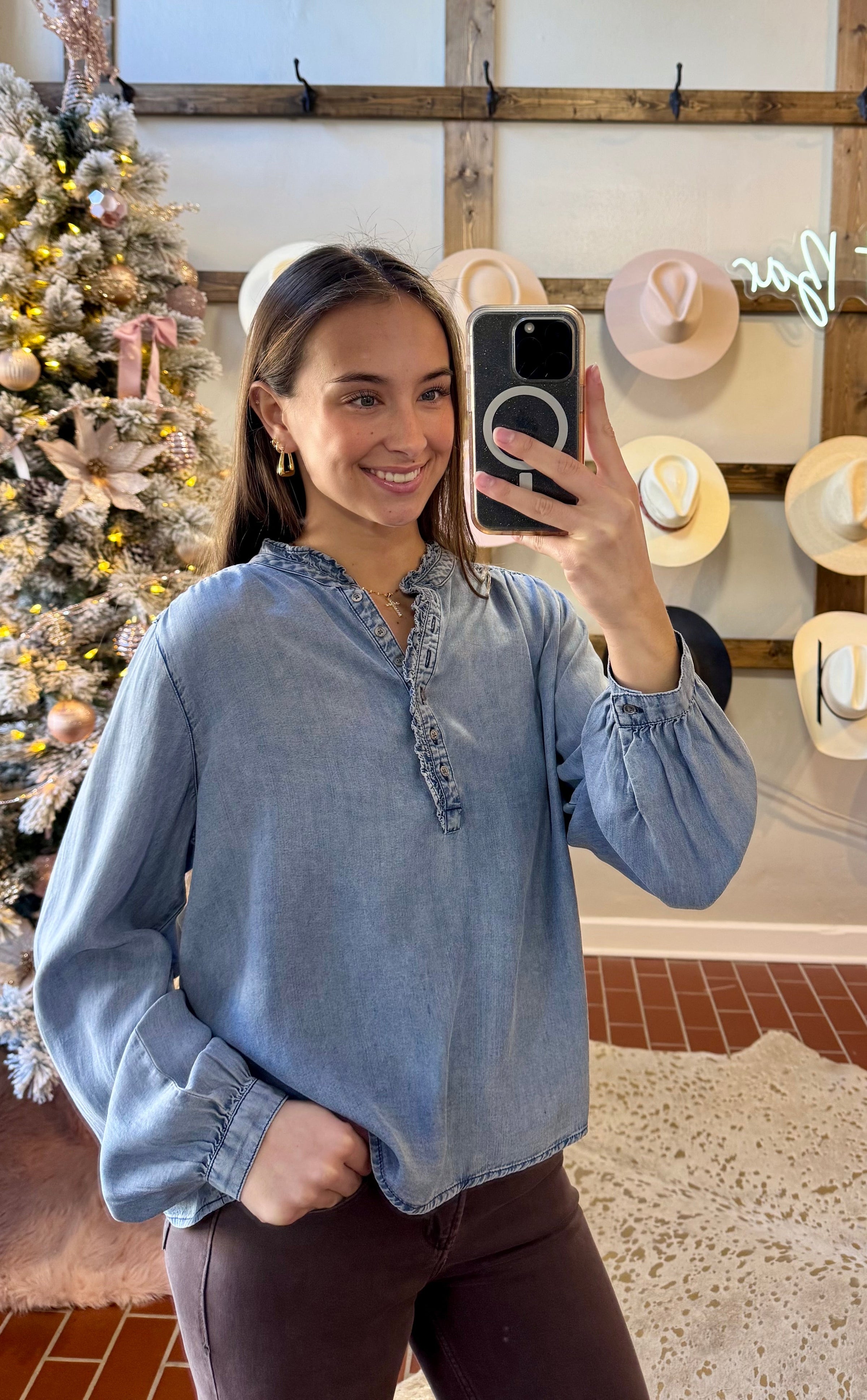 Chatra henley long-sleeve top featuring elegant ruffle detailing.