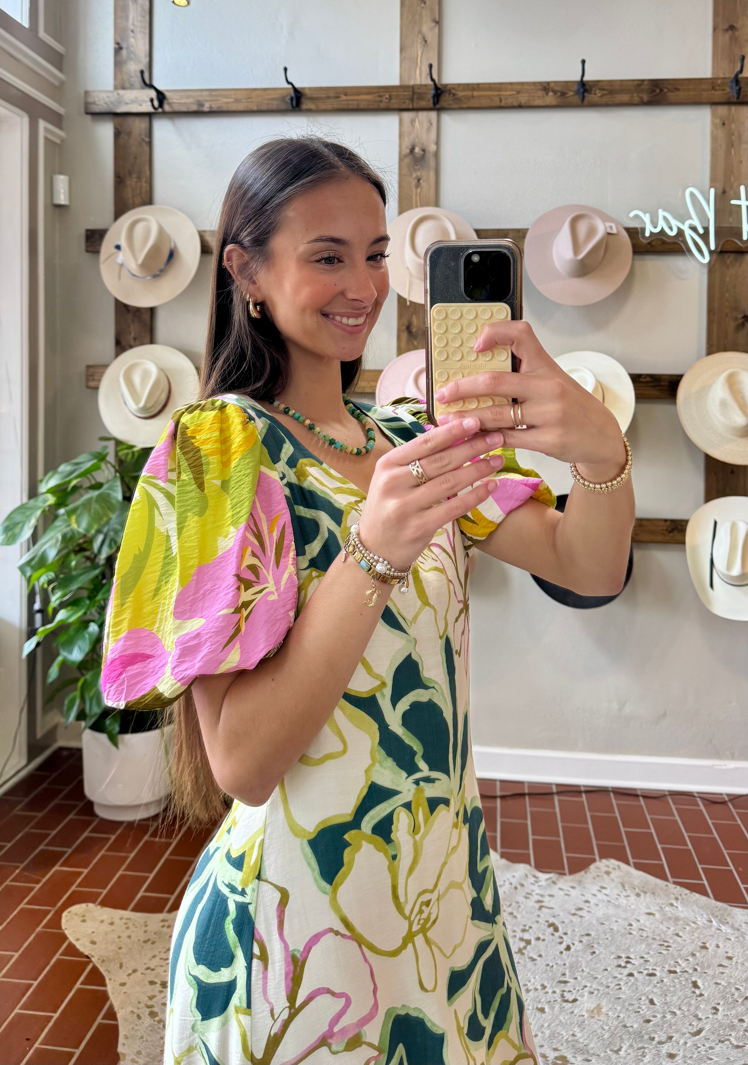 Celebrate life's special moments in this stunning Rachael Floral Dress. Designed for spring and summer occasions, this dress features elegant bubble sleeves and a flattering V-neckline that creates a sophisticated silhouette. The vibrant floral colors bring energy and charm to any event, whether you're attending a May graduation, garden party, or seasonal celebration. Perfect for making a memorable impression at your next gathering.