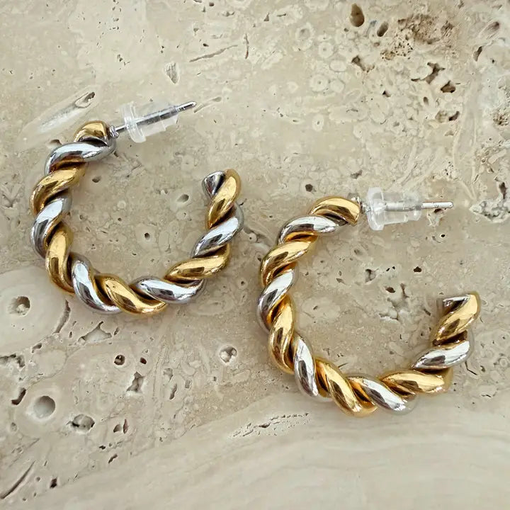 A modern twist on your everyday hoop. These mixed-metal earrings blend gold and silver tones with a smooth, braided design that instantly elevates any look. Lightweight, water-resistant stainless steel makes them perfect for all-day wear — no tarnishing, no hassle. The perfect “go with everything” earring your customers will reach for every single day.