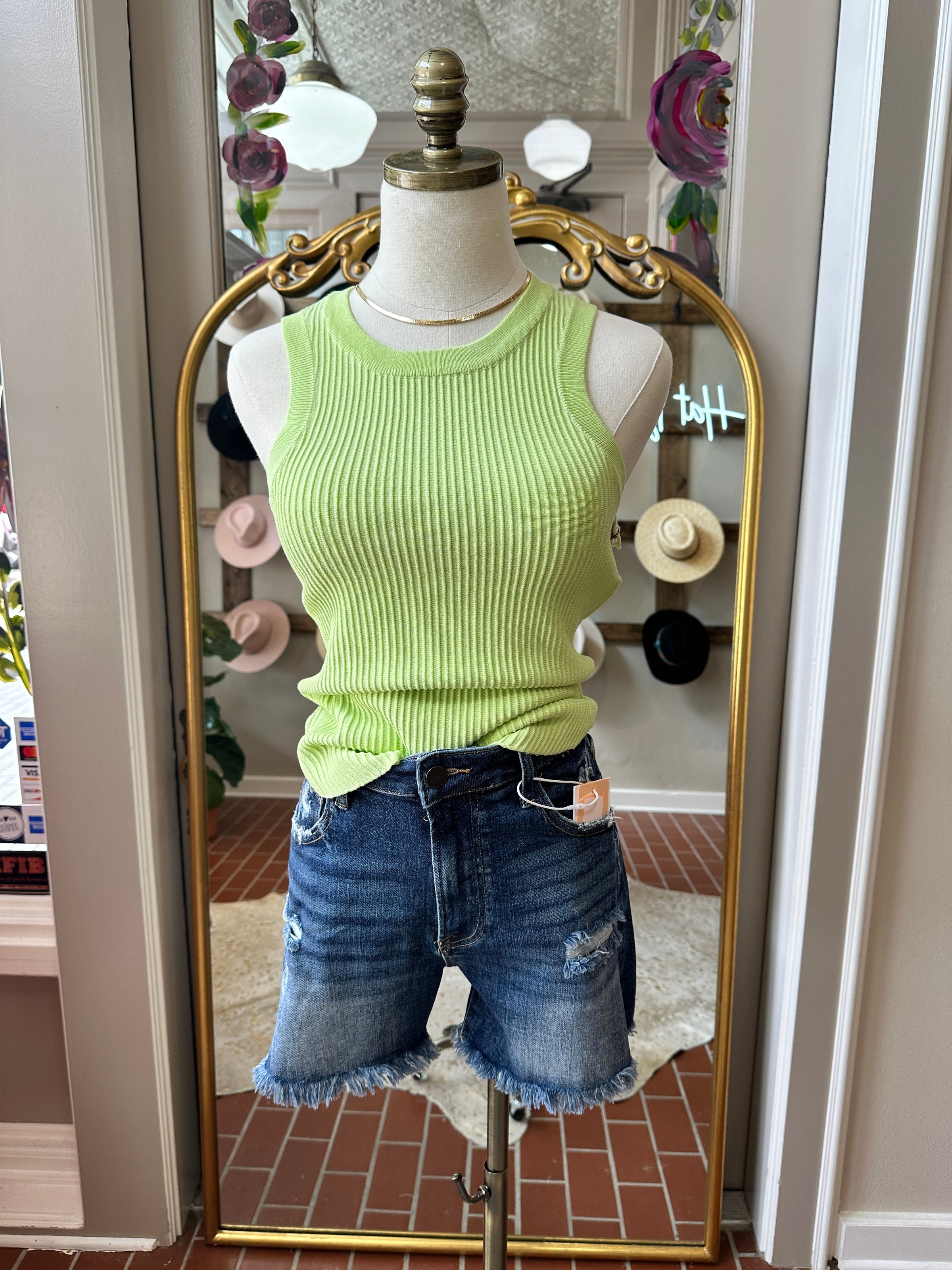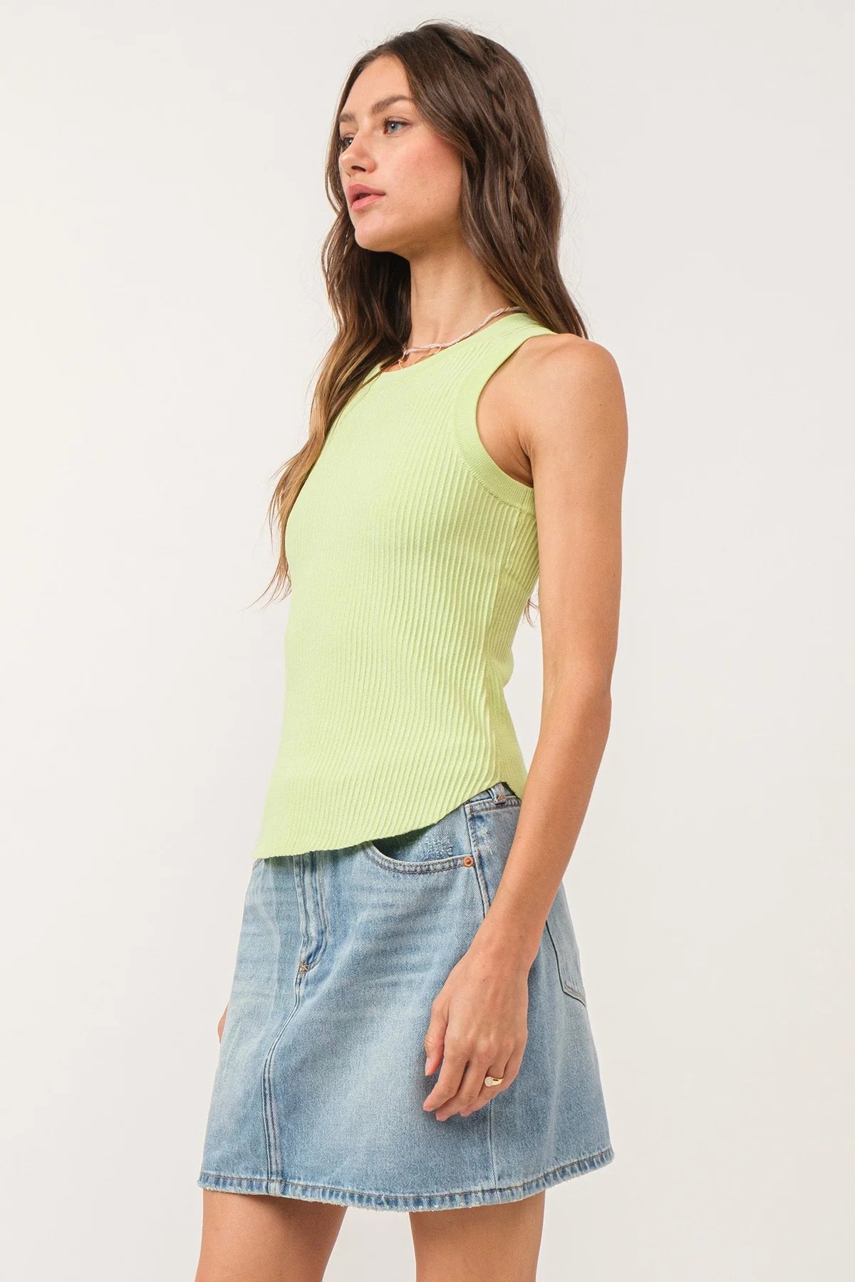 Sleeveless rib tank ribbed, high neck finished sleeveless with weaved self neck band & hem. Dress up or casual, looking ever SIZZLING & comfy. The go-to piece of extra sazz! Solid color yarn fitted.