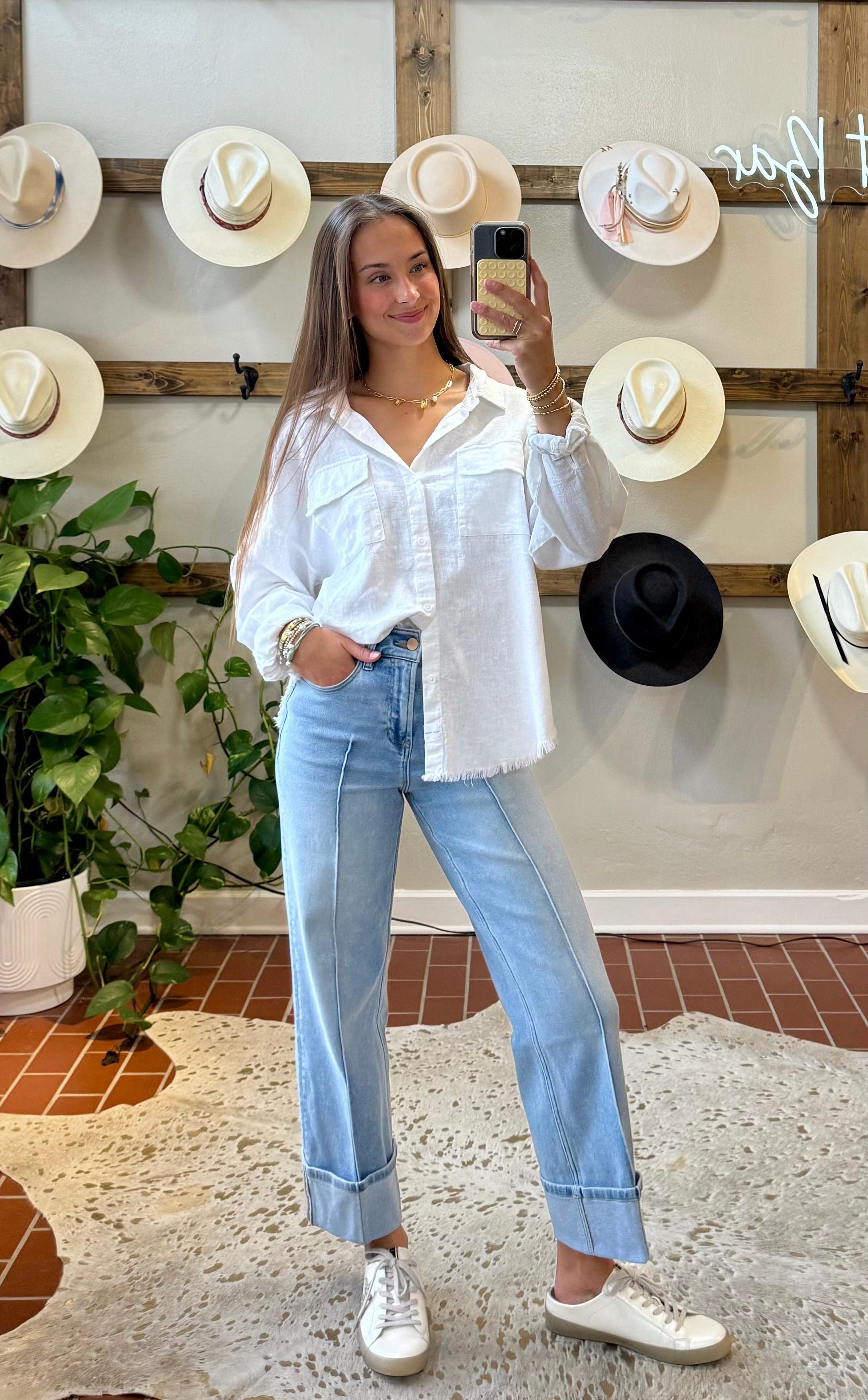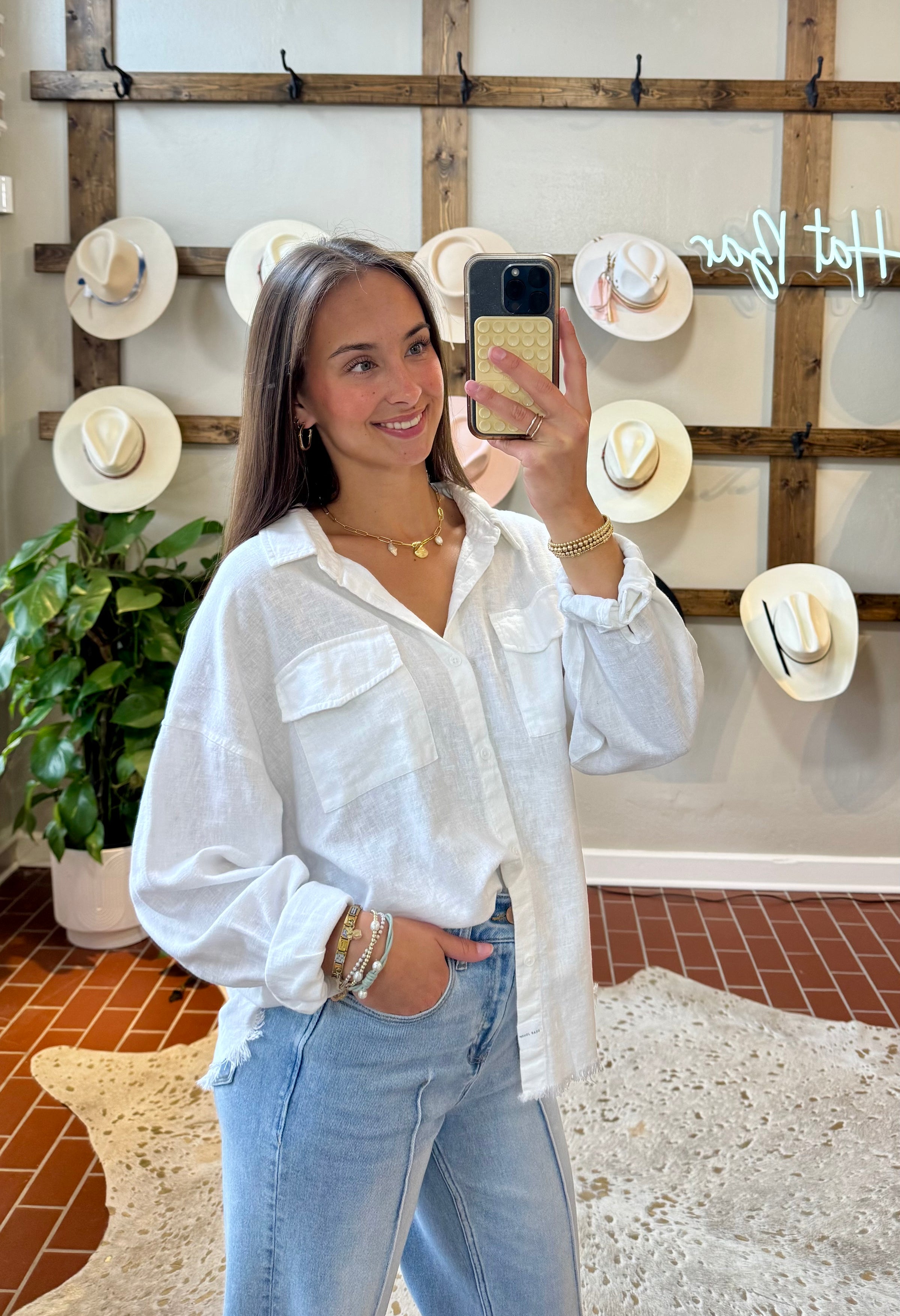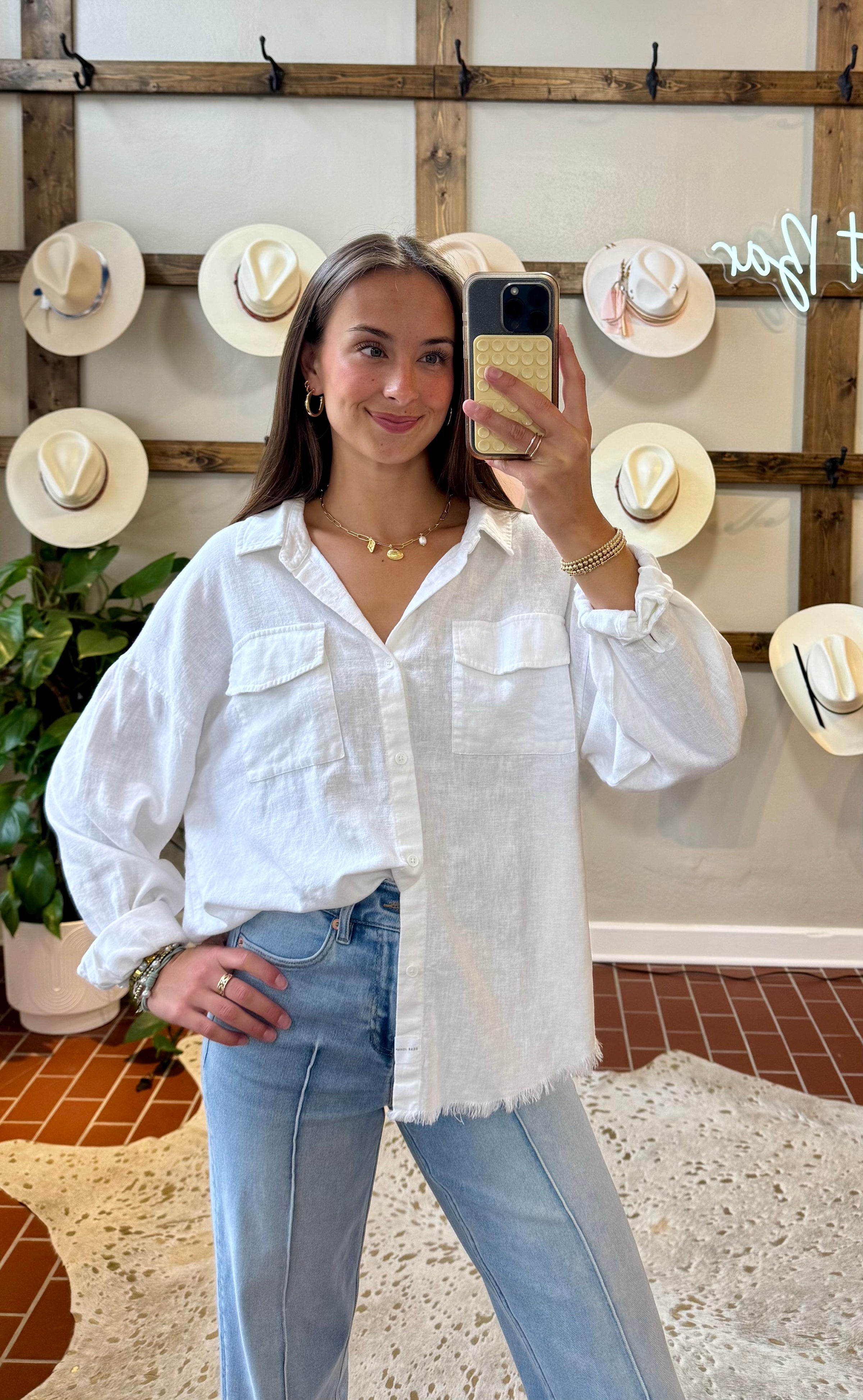 The Adrianna Shirt is a long sleeve, oversized, garment-dyed, lightweight white shirt crafted from cotton for a soft, breathable feel.