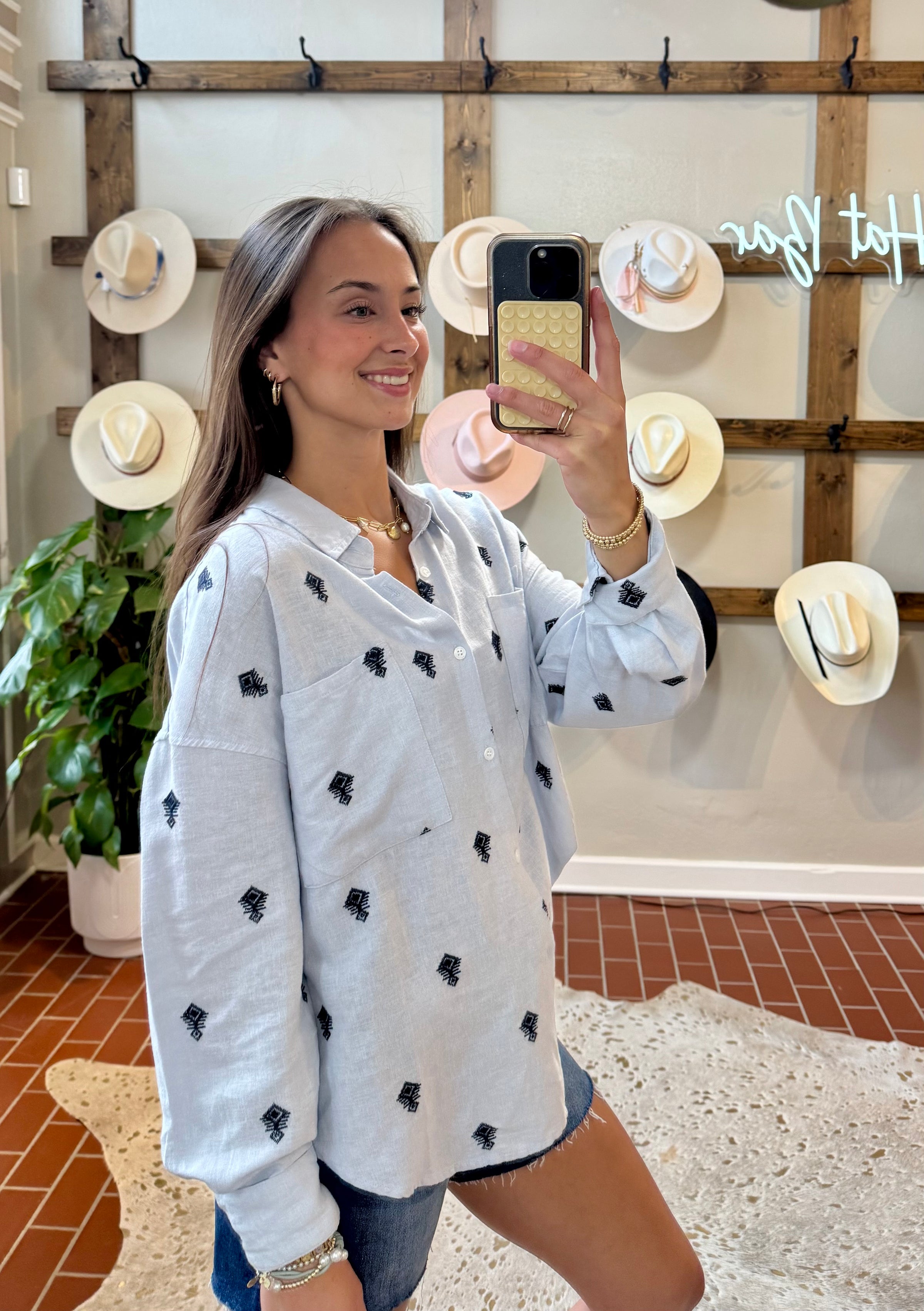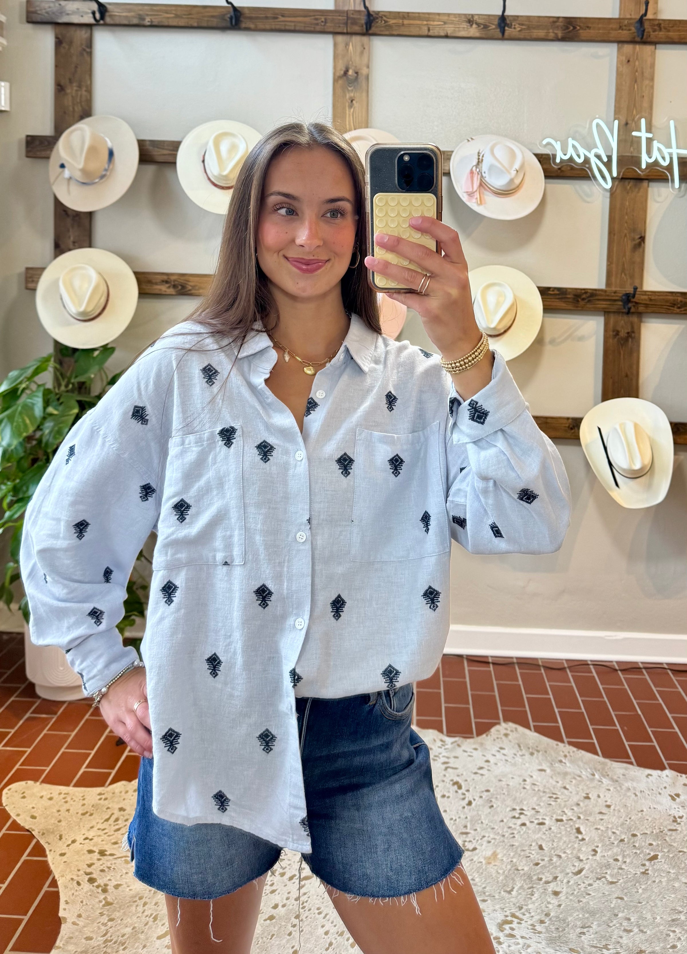 This lightweight woven embroidery shirt features a button front and collar for a classic touch, making it a standout in the realm of tops online and the top market.