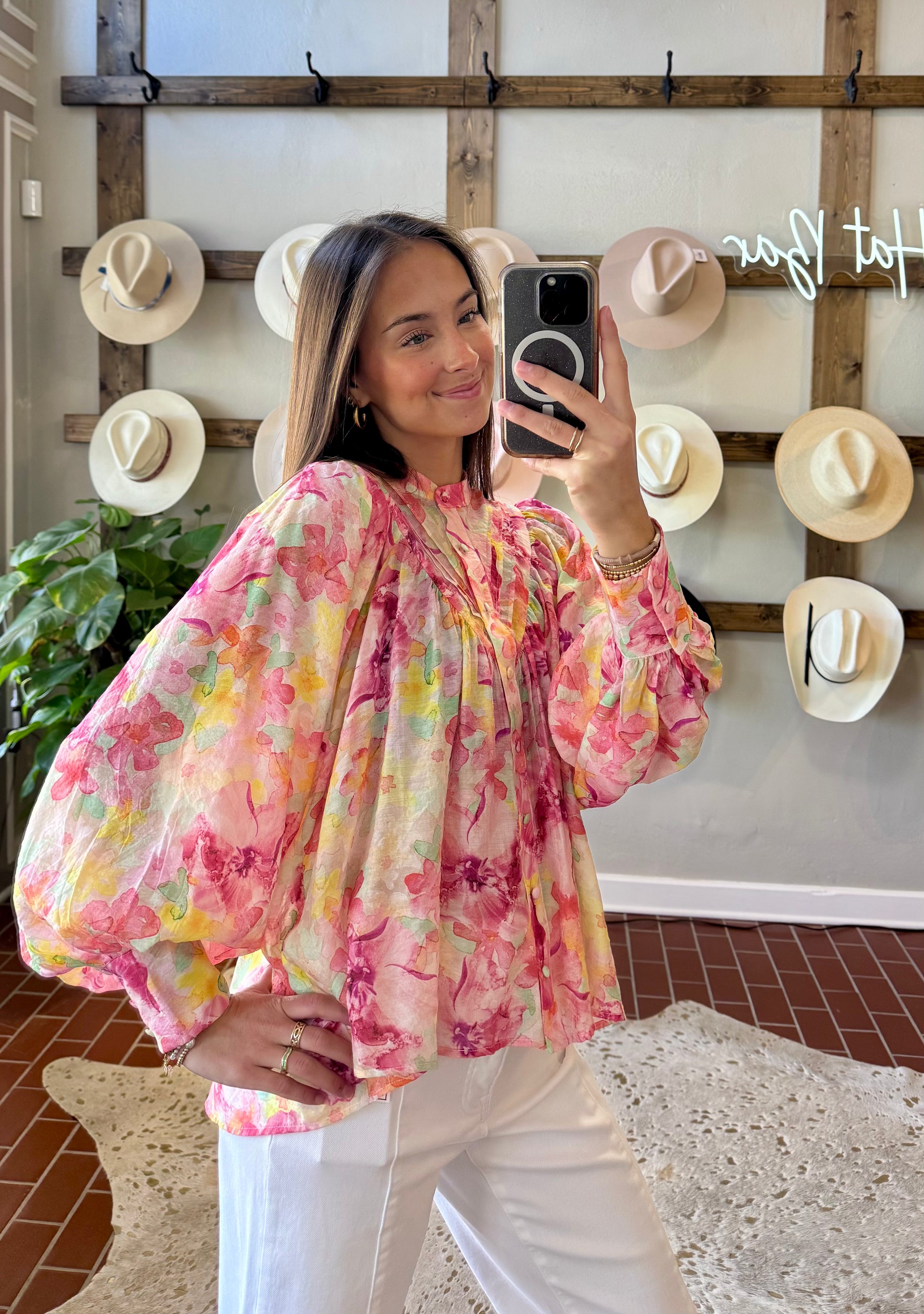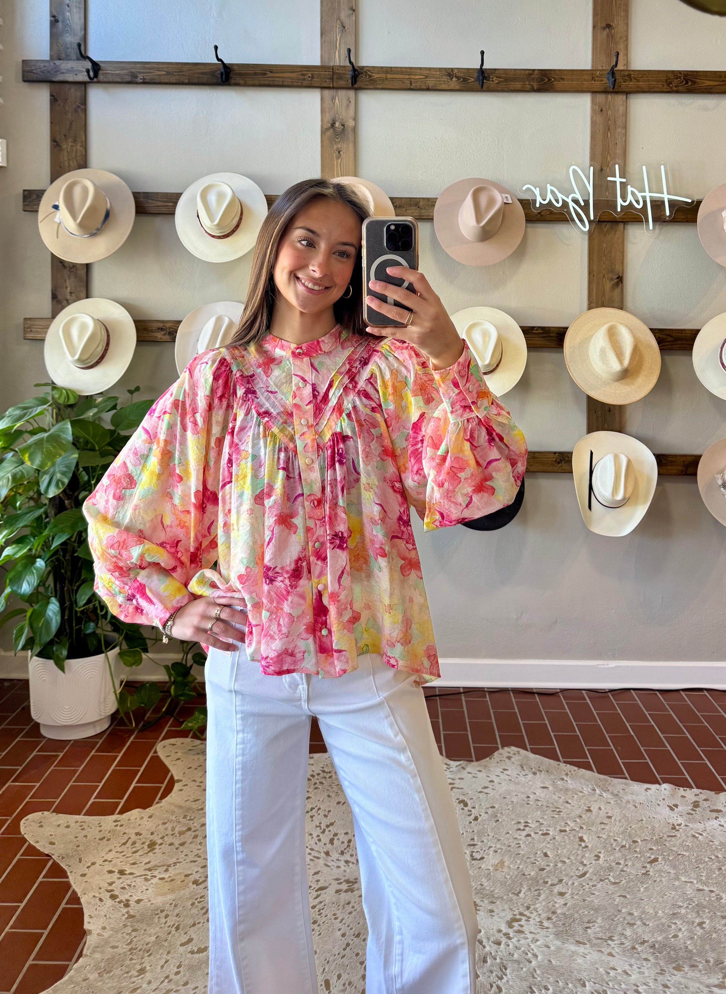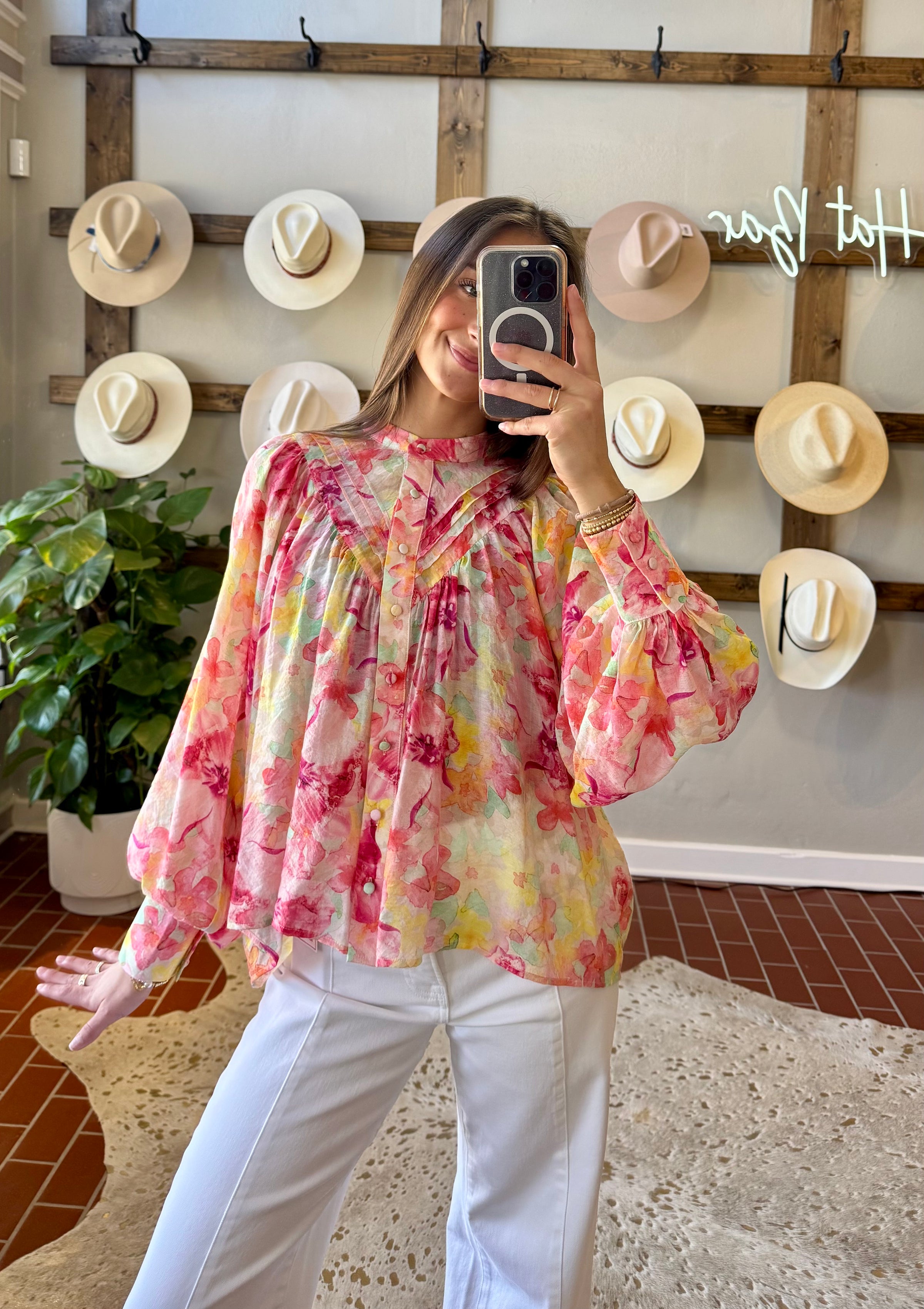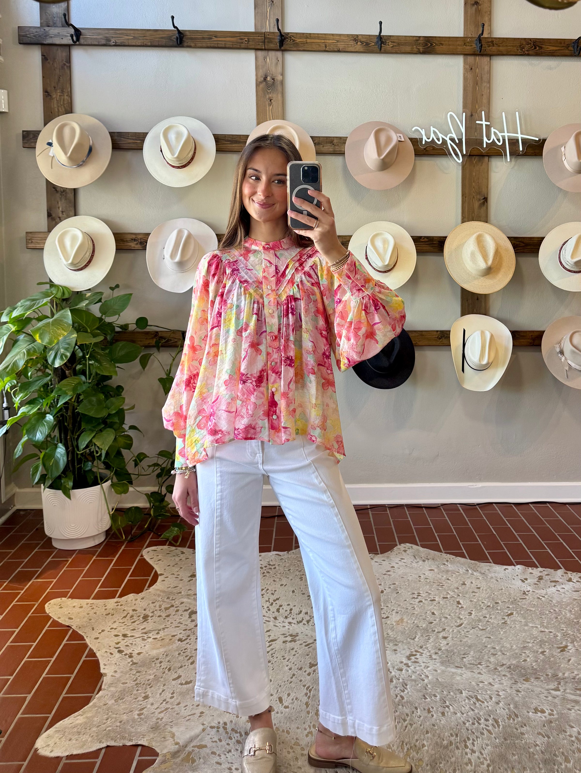 The Spring Janae Top features a vibrant floral print in bright pastel colors, designed to enhance versatility in your wardrobe. Its lightweight, flowy fabric ensures comfort, making it suitable for casual outings with denim or dressed up with colored slacks. This adaptability offers numerous styling options throughout the season.