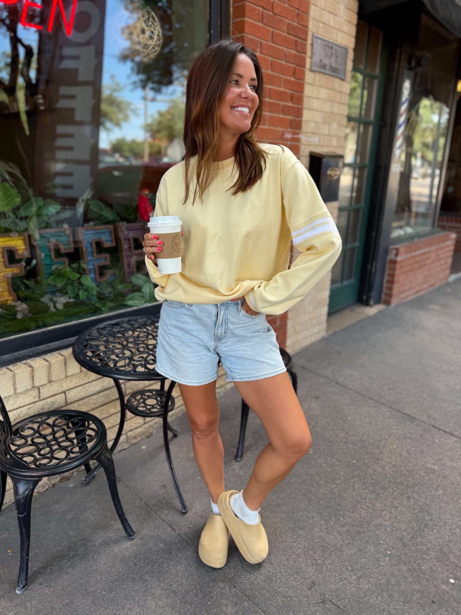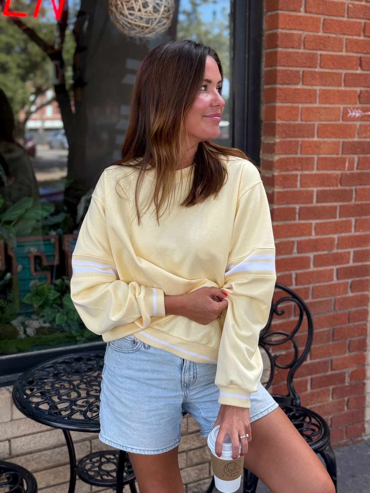 Our Sunny Stripe Sweatshirt combines comfort and style with its cozy cotton-polyester blend and classic oversized unisex fit. Featuring a solid crewneck and eye-catching striped ribbed insets on the sleeves, cuffs, and waistband, it offers a modern twist on a timeless design. The medium size fits true to medium/large, while the large offers a relaxed large/x-large fit. Perfect for layering or wearing on its own, this sweatshirt is your new go-to for effortless casual cool.