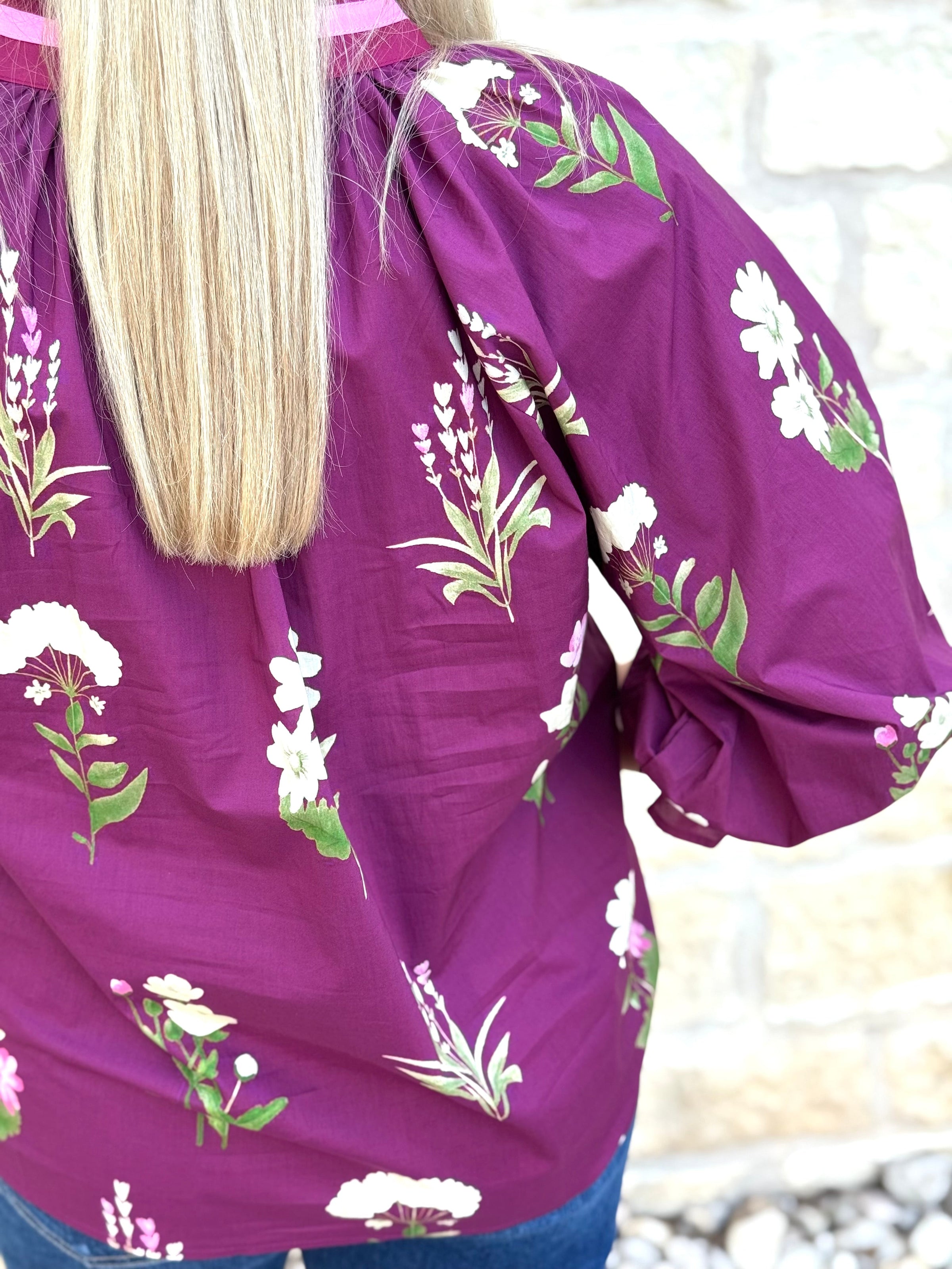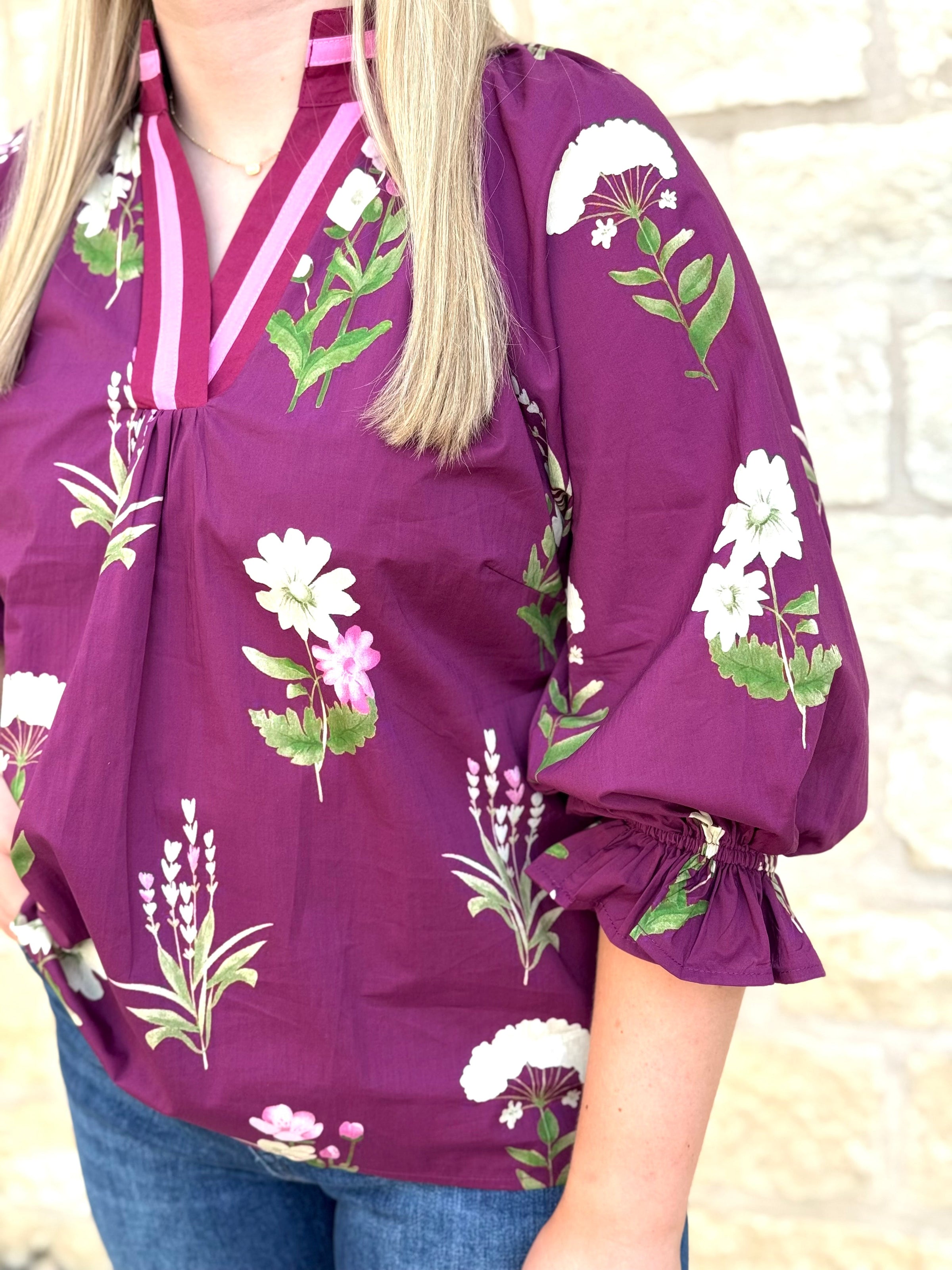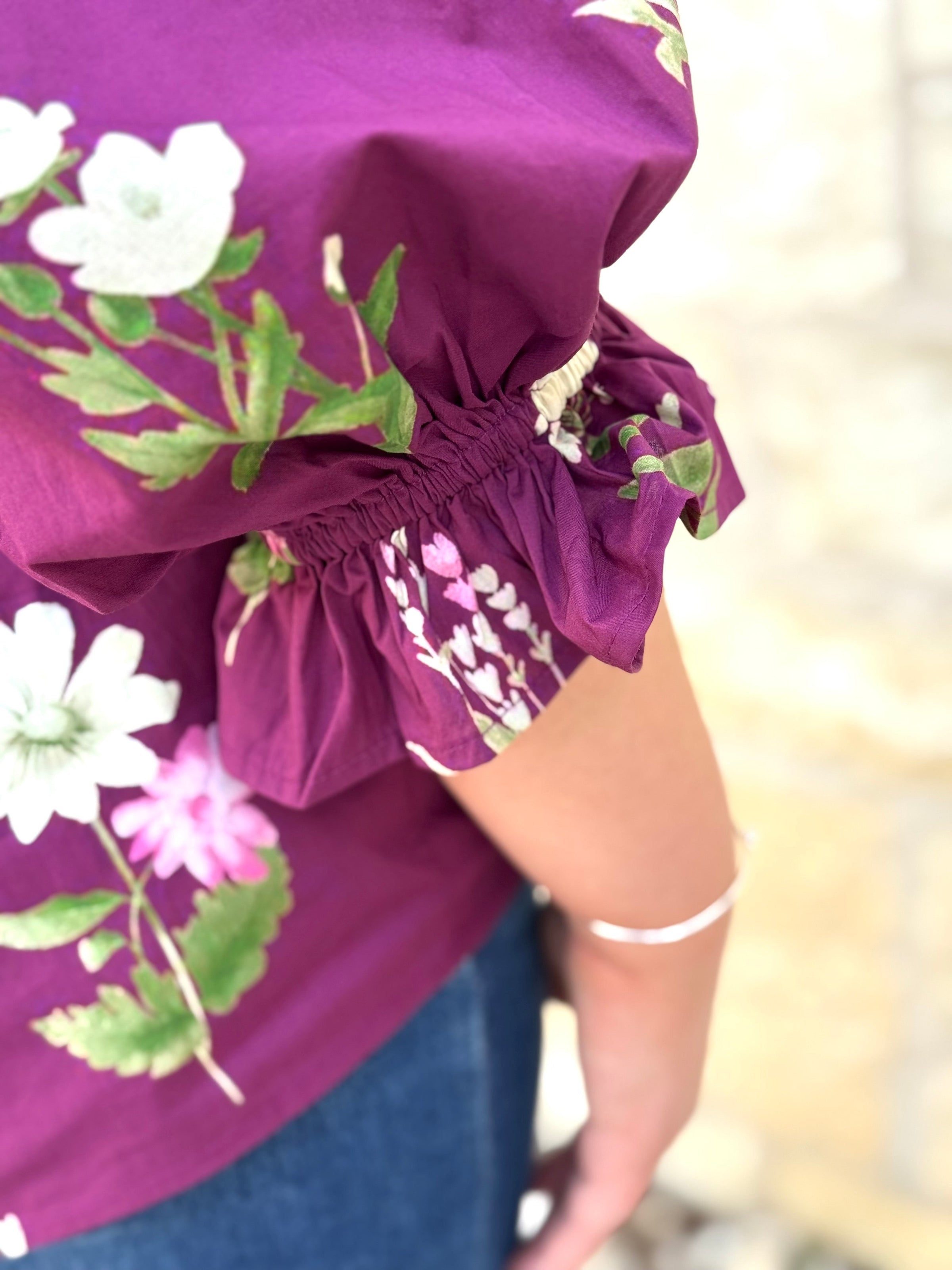 Our Plum mix top is the perfect transition top going into Fall. Model is wearing the size small and a size 6 and 5"3. Elastic banded sleeves with a baby ruffle at the end of the sleeve.
