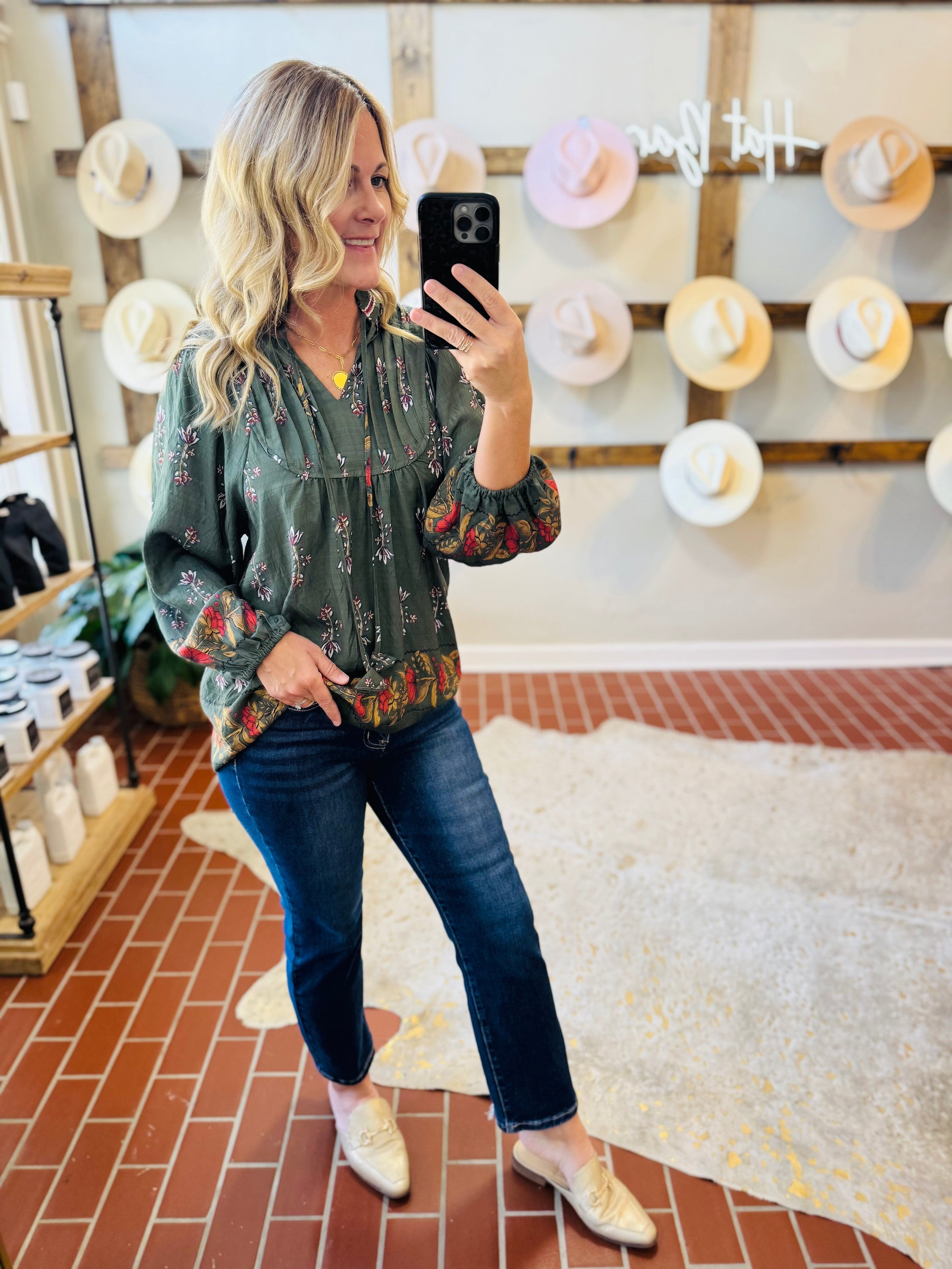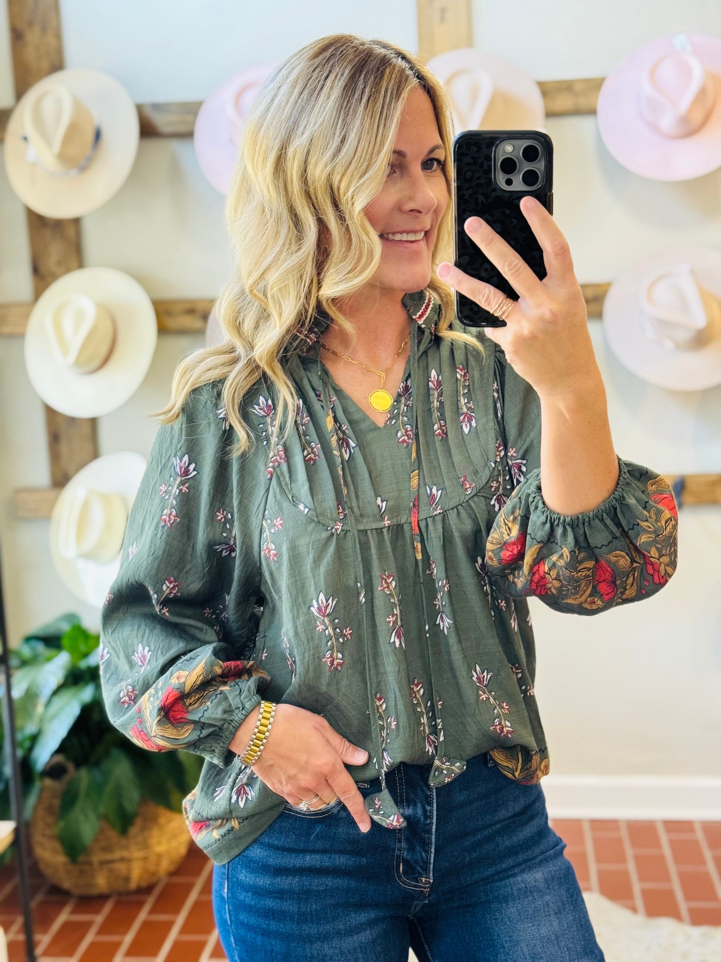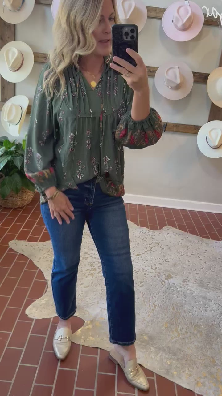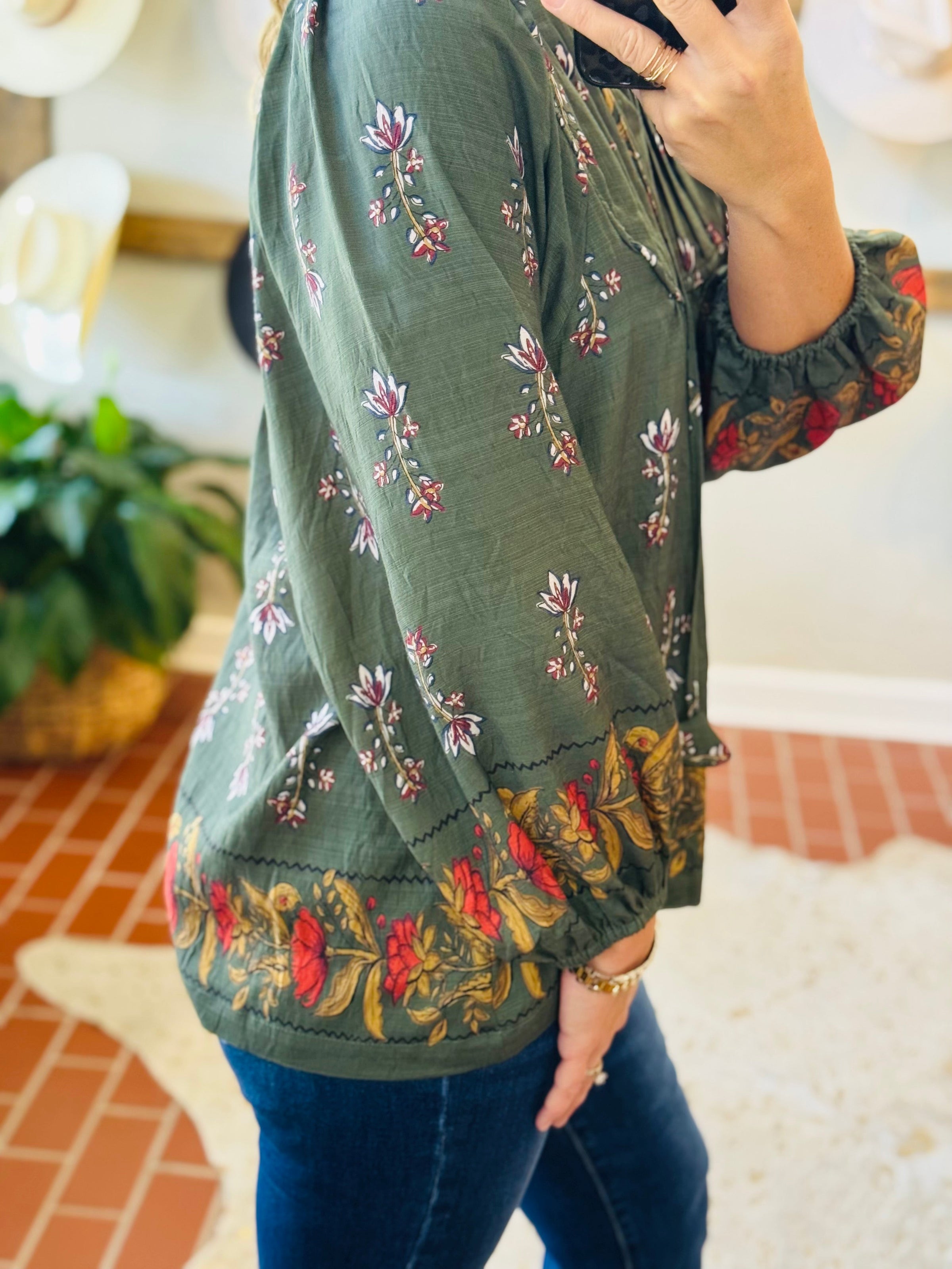 Introduce some autumn vibes to your wardrobe with our Alexandra Forrest Top! This gorgeous piece features a rich forrest green color and a unique pattern in warm fall hues. The v neck line is adorned with playful tassels, adding a touch of whimsy to your outfit. Perfect for cooler weather with its long sleeves, this top will keep you looking and feeling stylish all season long.