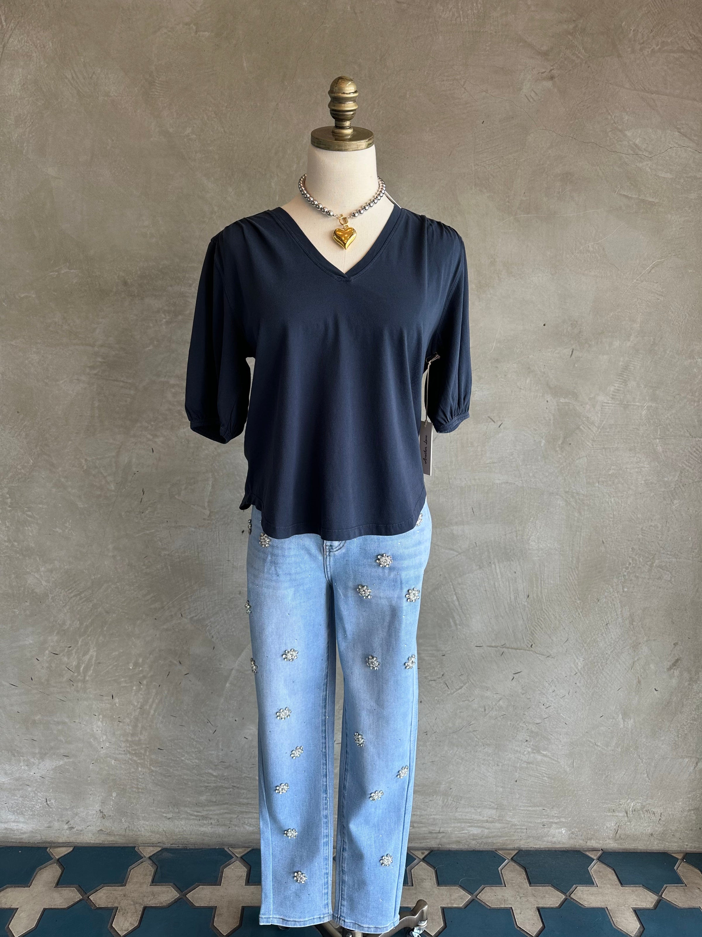 Phoebe 3/4 sleeve v-neck top crafted from 100% cotton, offering a perfect blend of comfort and style. This classic fitting piece is ideal for layering or wearing on its own. Its breathable fabric ensures all-day comfort while adding a touch of elegance to any outfit.