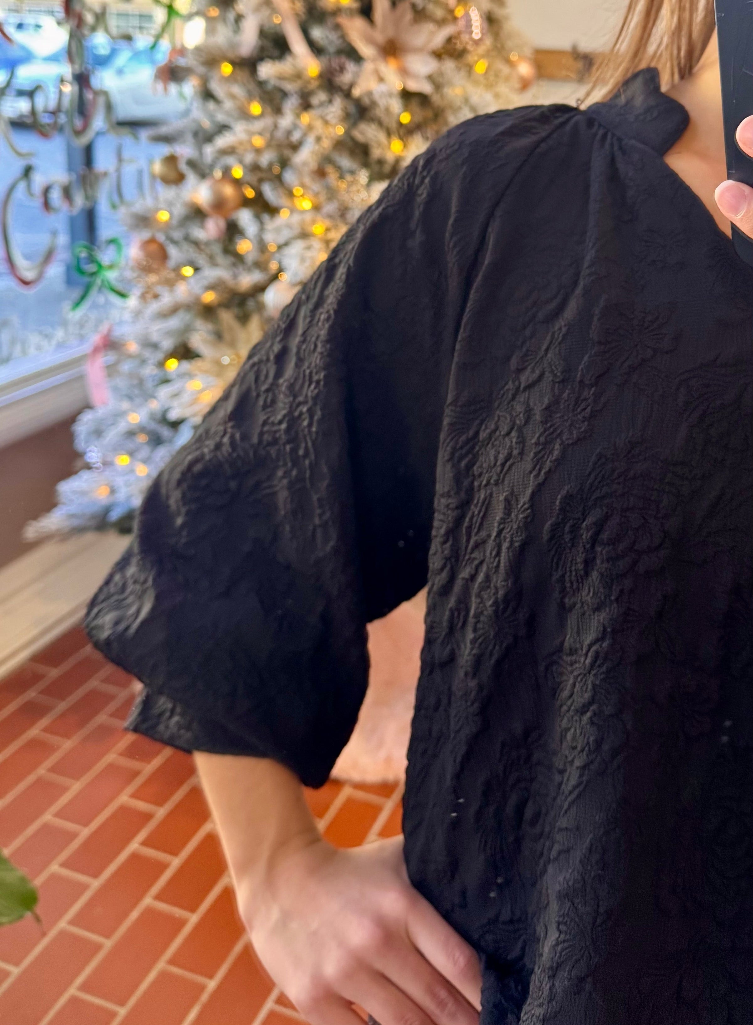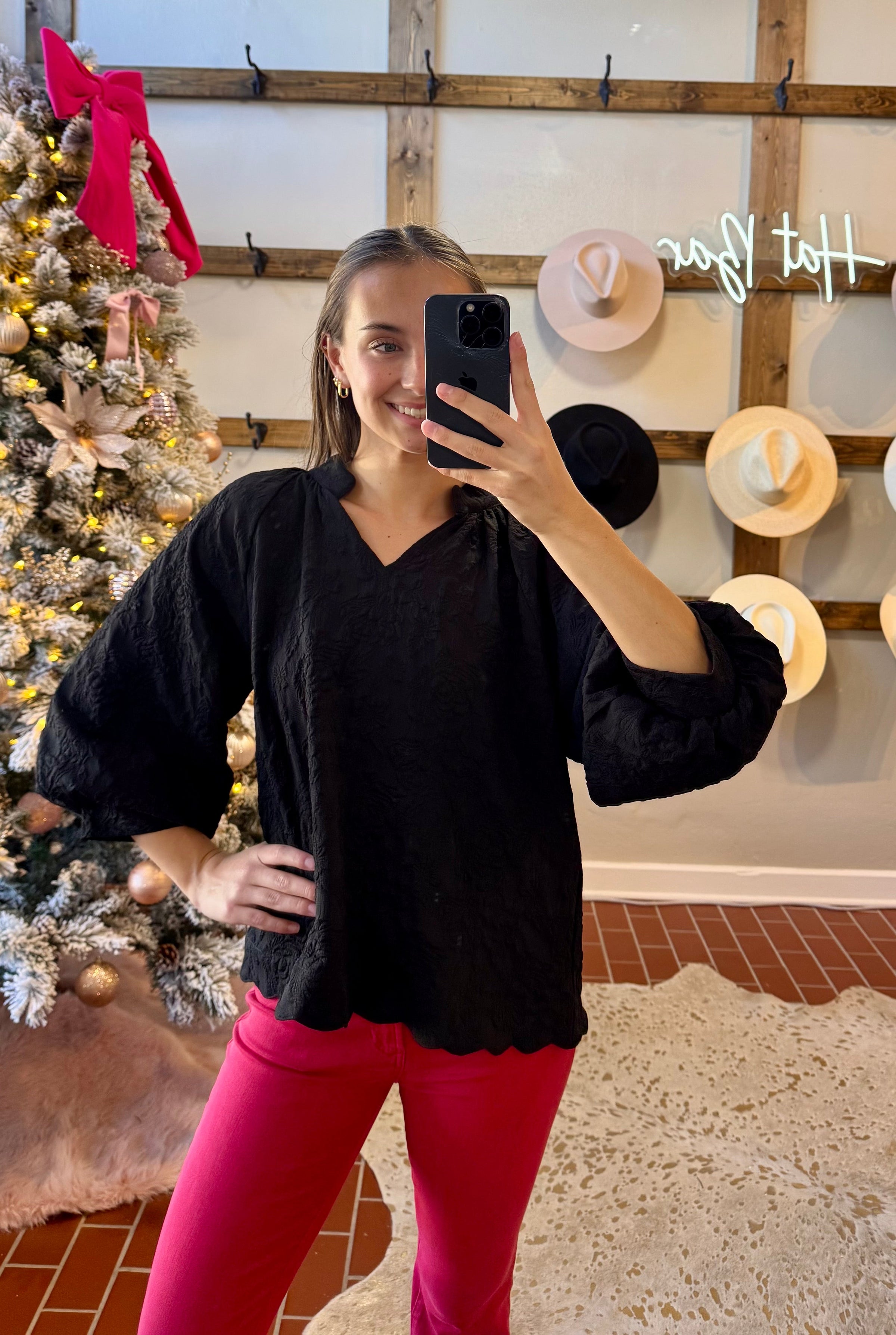 The Amelia Scalloped Top is a wardrobe staple with timeless style. Its classic black colorway pairs effortlessly with any bottom, while the scalloped hemline and quarter sleeves add a touch of sophistication. Perfect for transitioning into the new season, this top is a must-have for any fashion-forward individual.